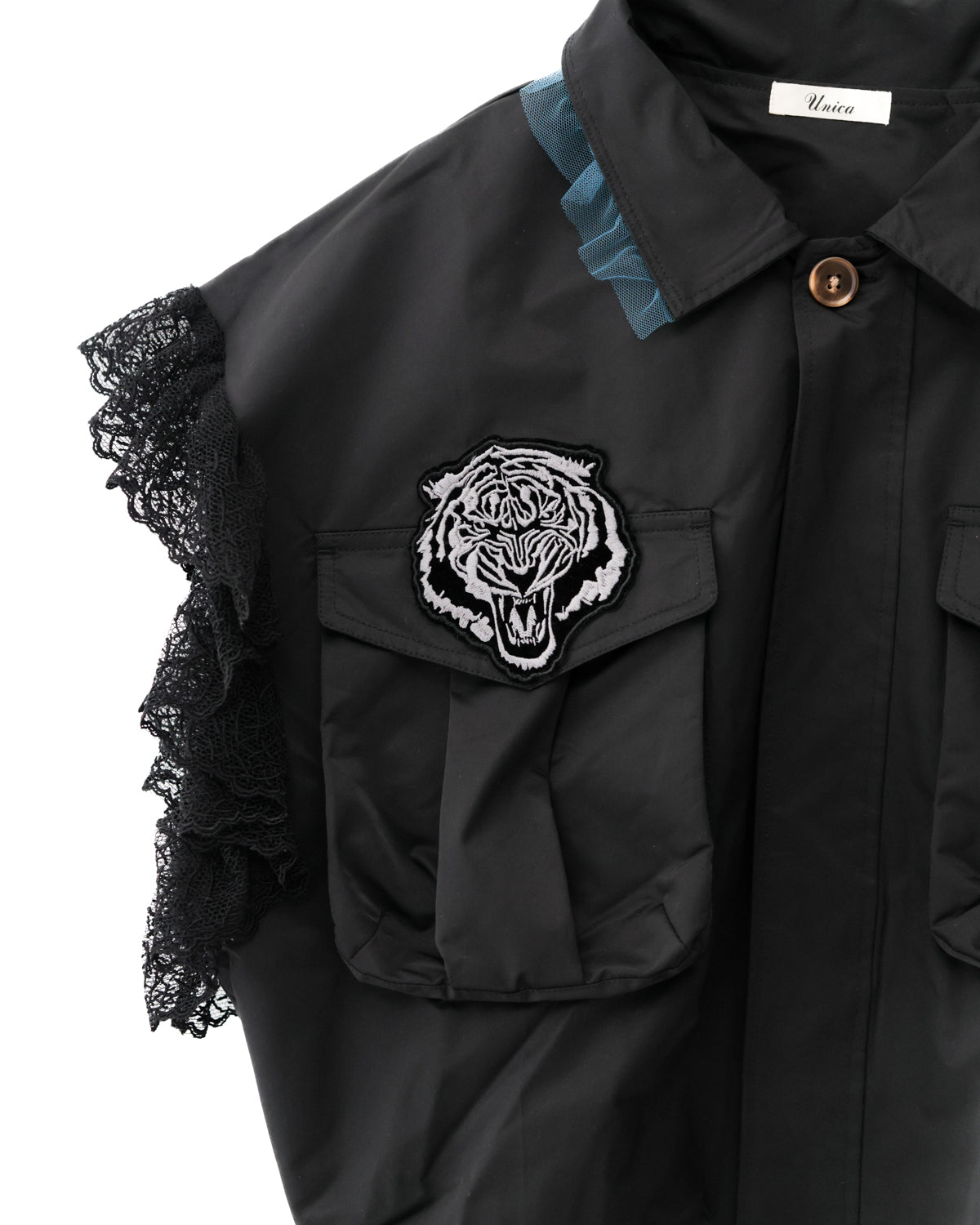 フロントのパッチワークやタイガーの刺繍がアクセントになり、甘さをそっと添えるレースの袖が絶妙なバランスに。