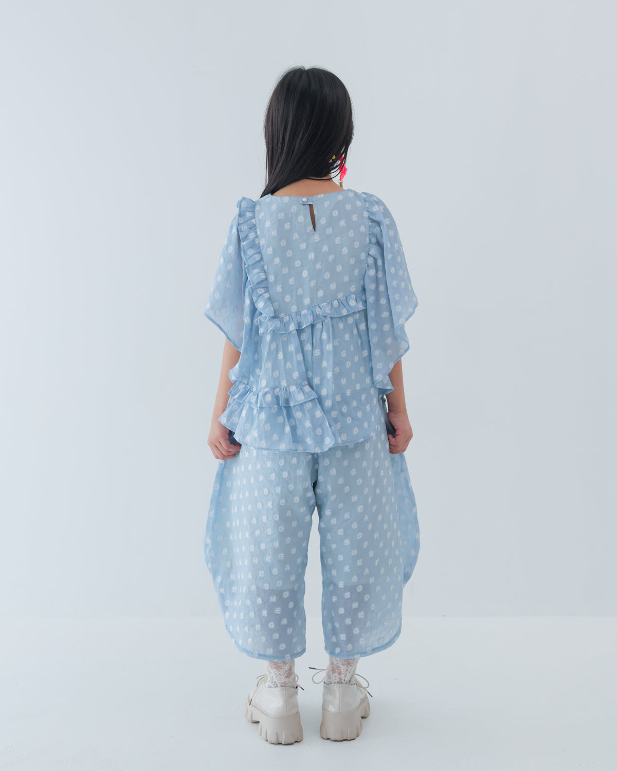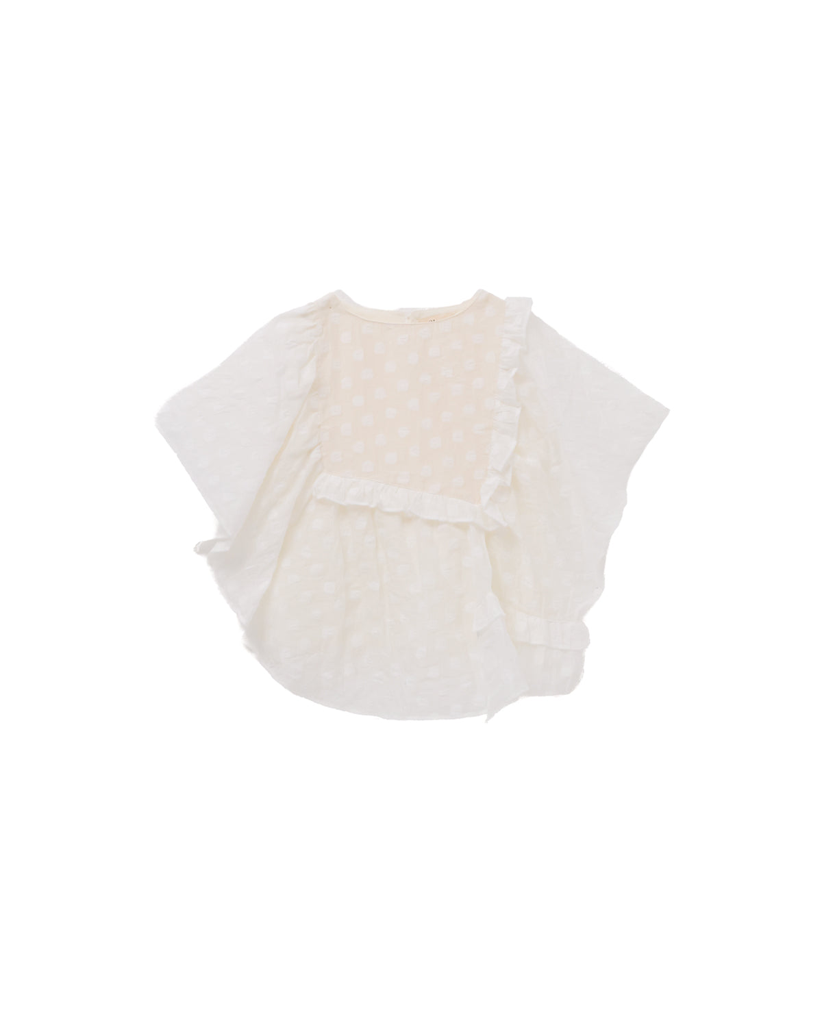 タンクトップの上にフリルを被せた涼しげな作りで、着用すると肩の部分をオーガンジーがふわりとカバー。