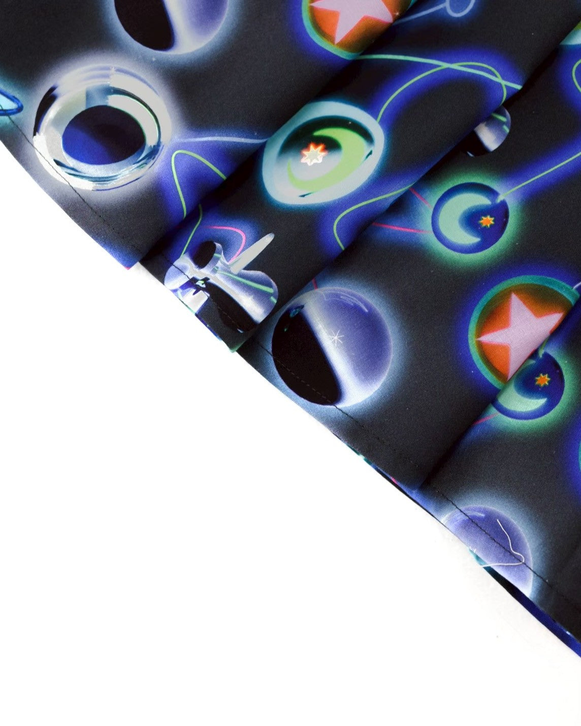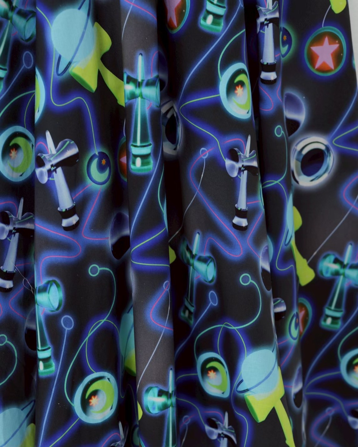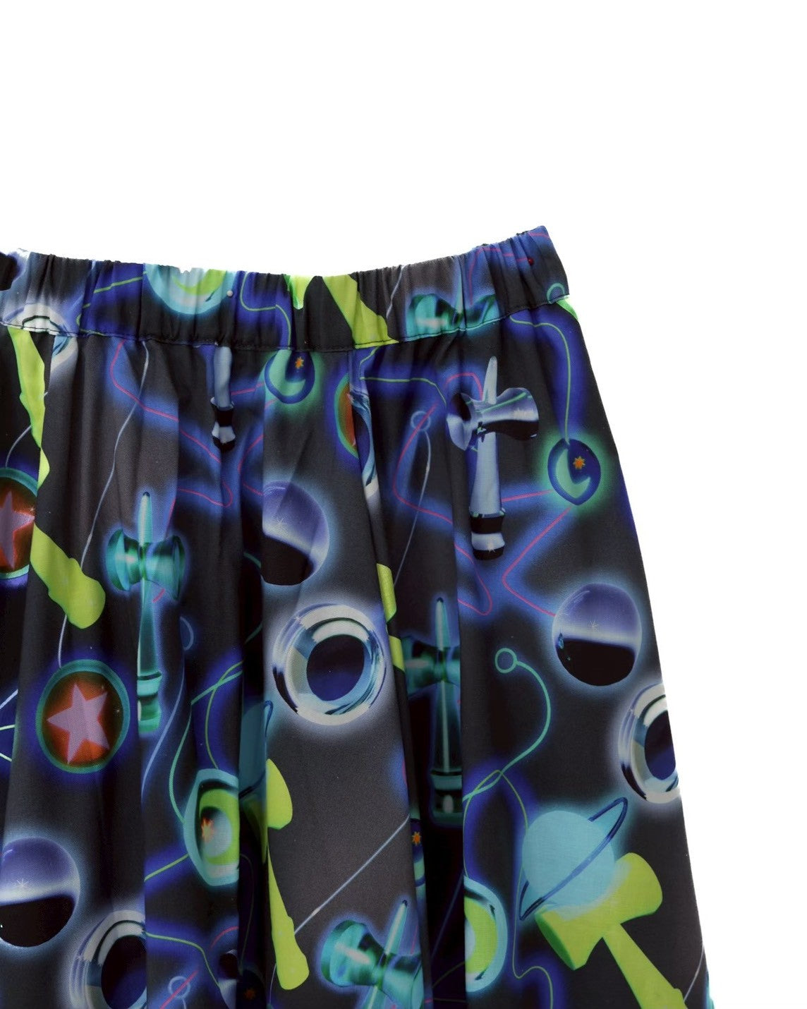 ブームになったなつかしのあのオモチャをイメージさせる柄と、ネオンなカラーが目を引く総柄スカート!