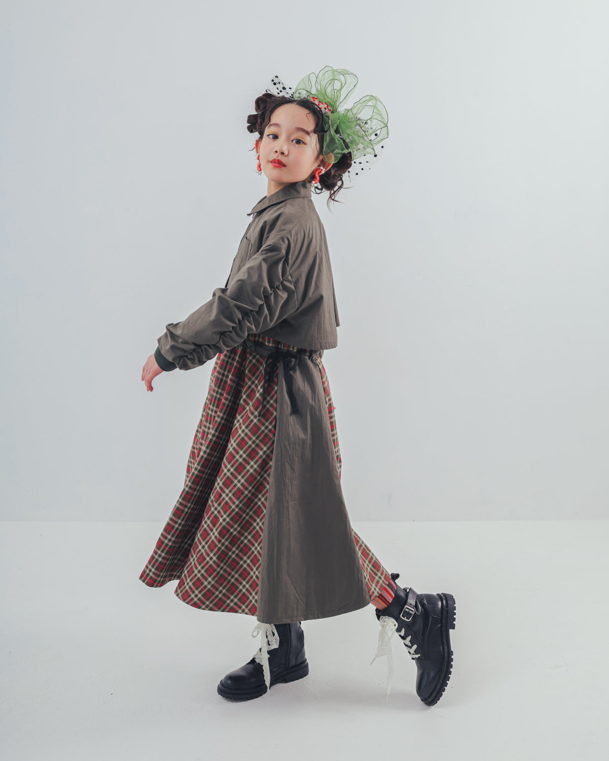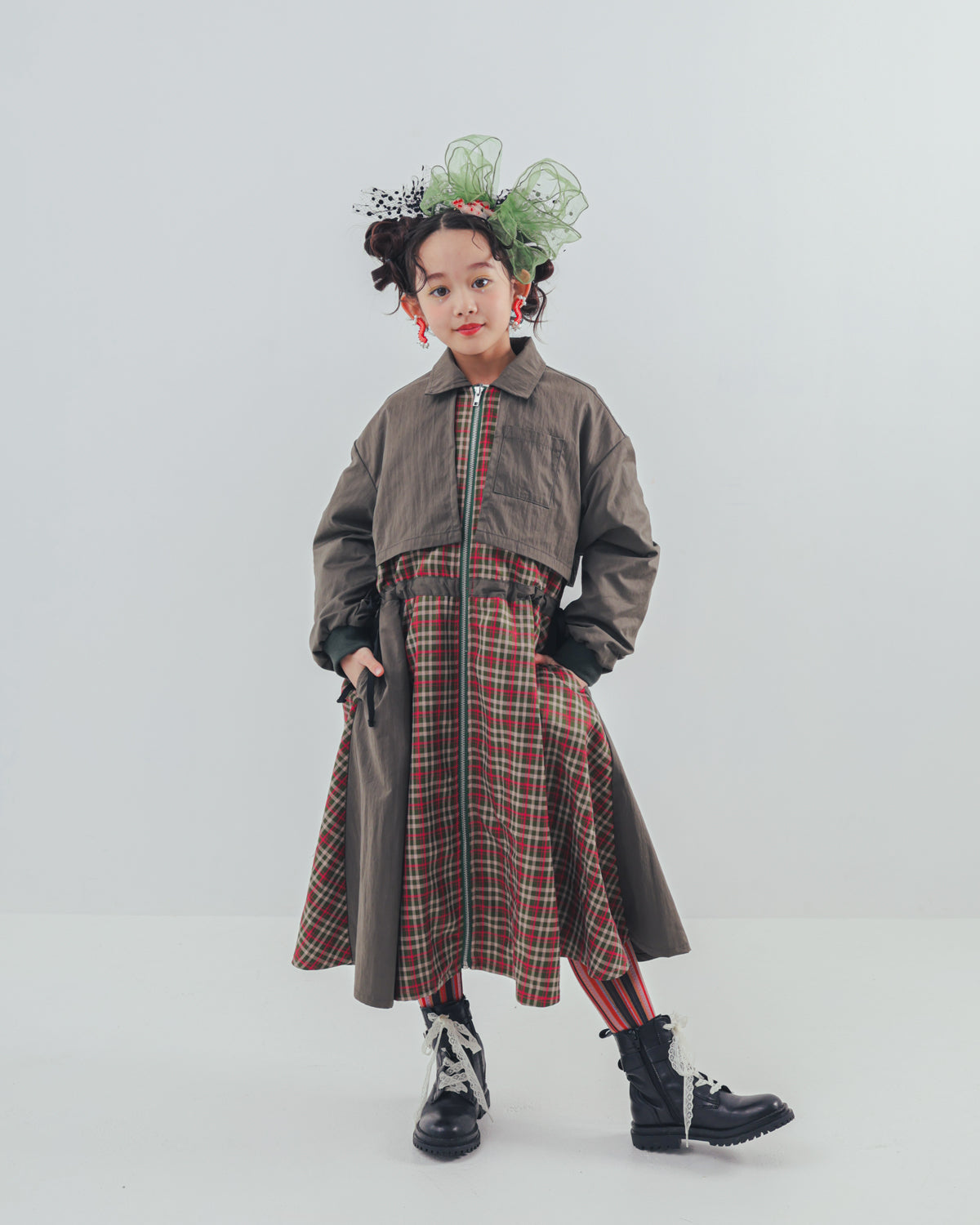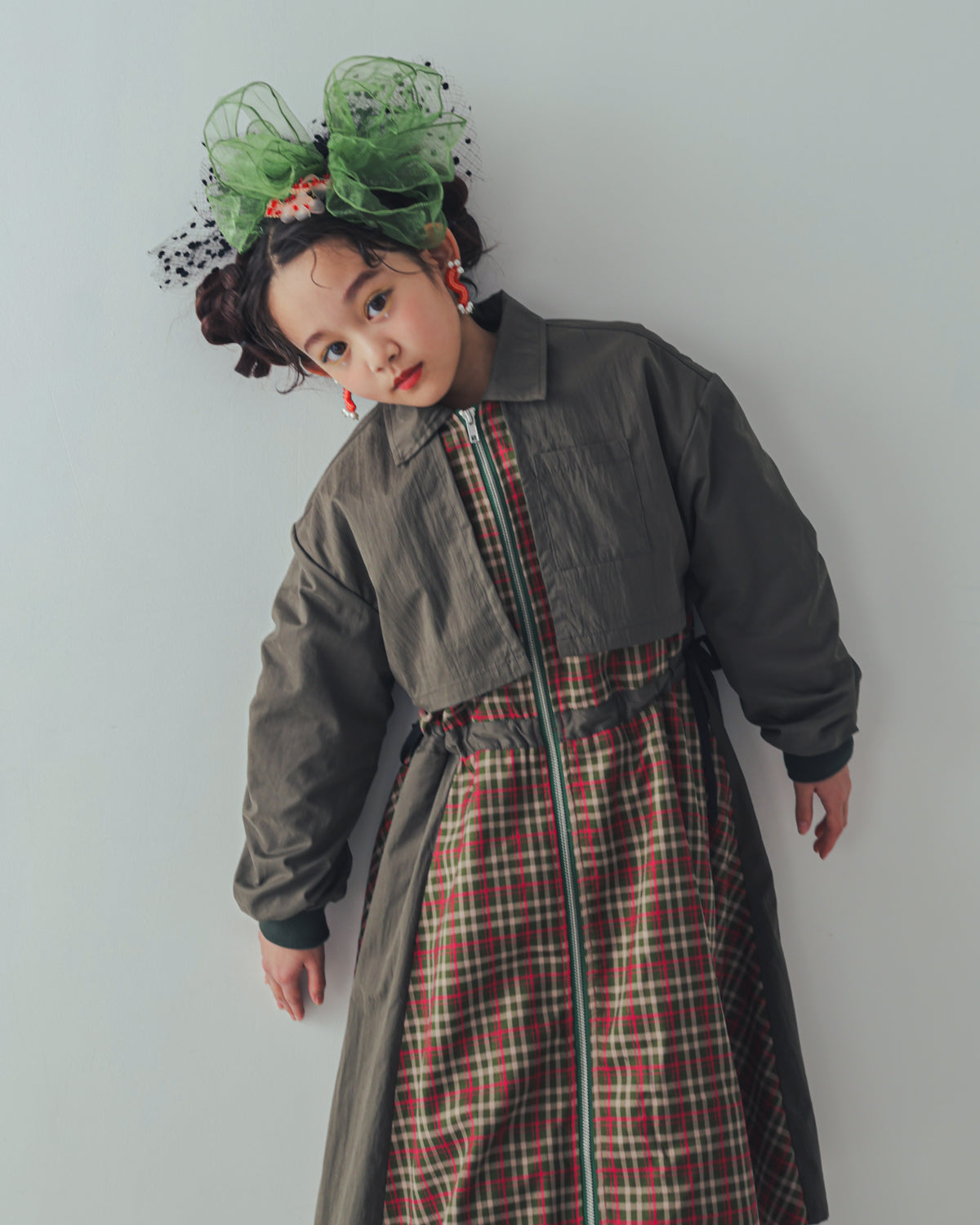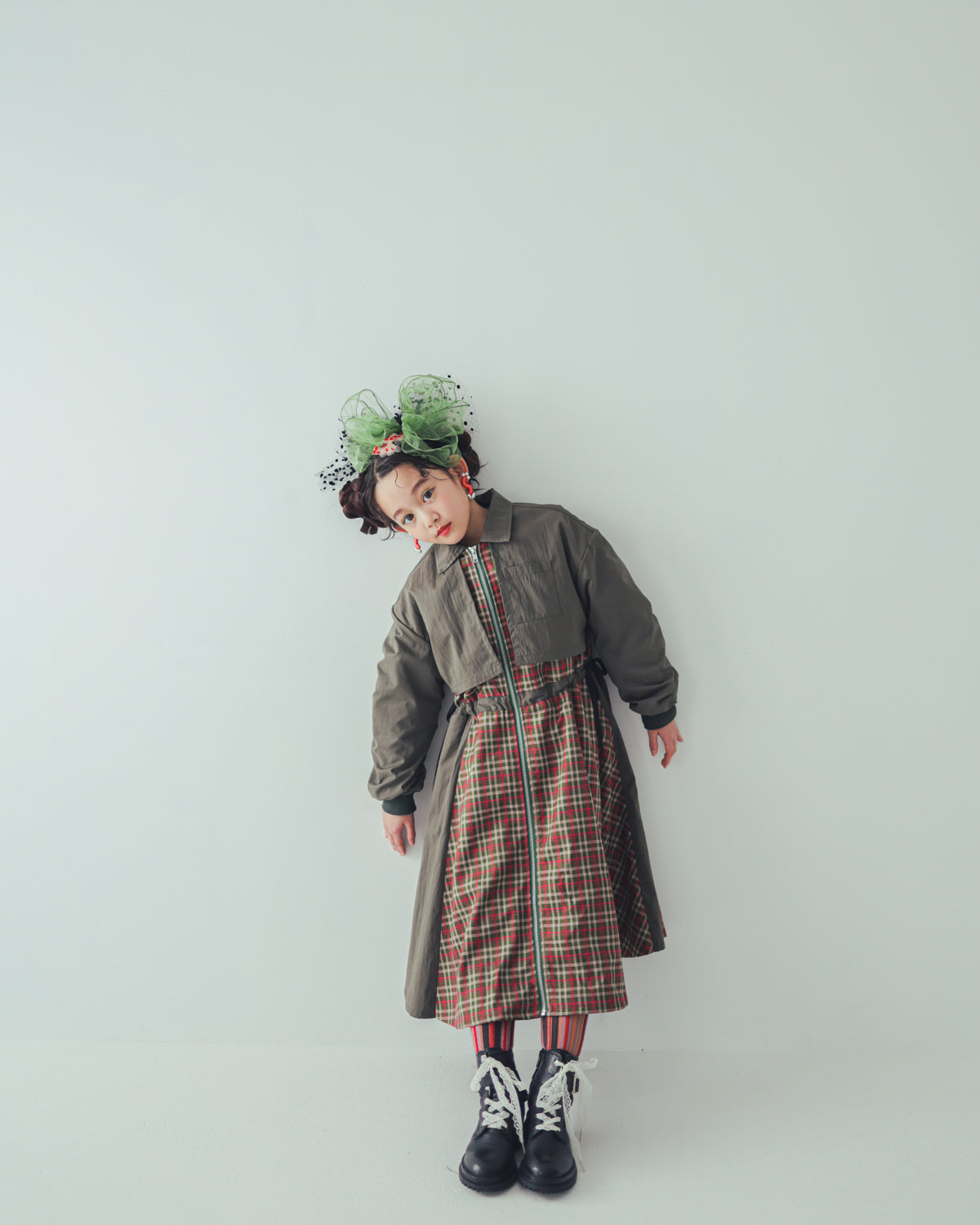 アウターを羽織っているように見えて、実は一着のワンピースという遊び心のあるアイテム。秋冬の定番柄であるチェックを大胆に使いつつ、色と柄を切り替えることで甘さと辛さの匙加減を絶妙なバランスで仕上げました。ジッパーを全て開けてロングアウターのようにお使いいただくのもオススメです。