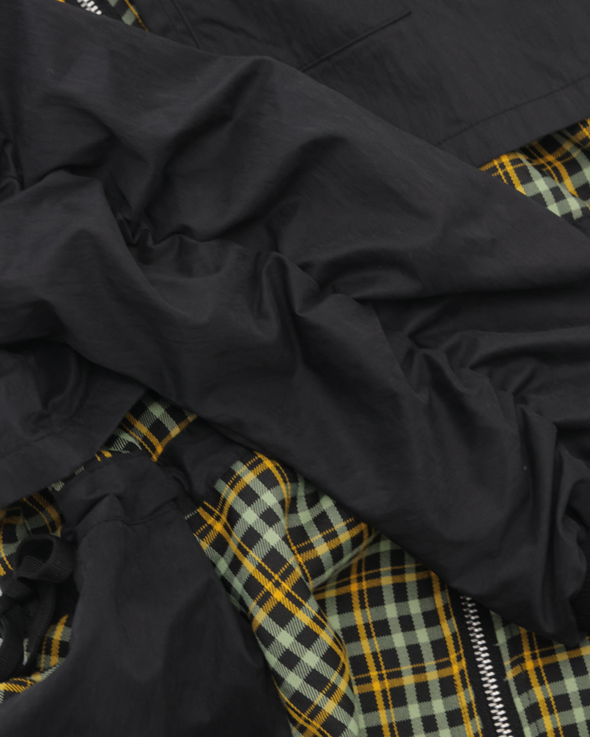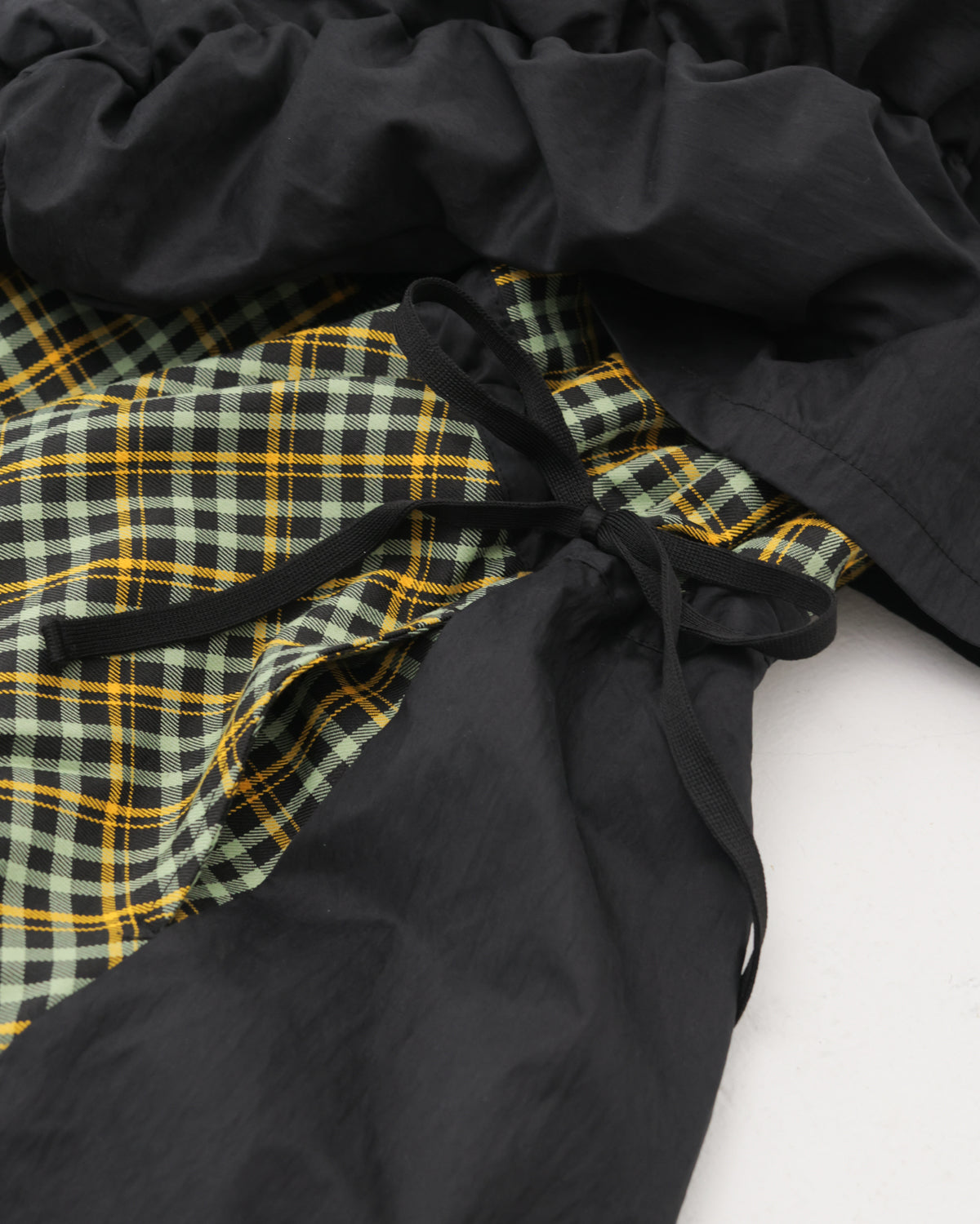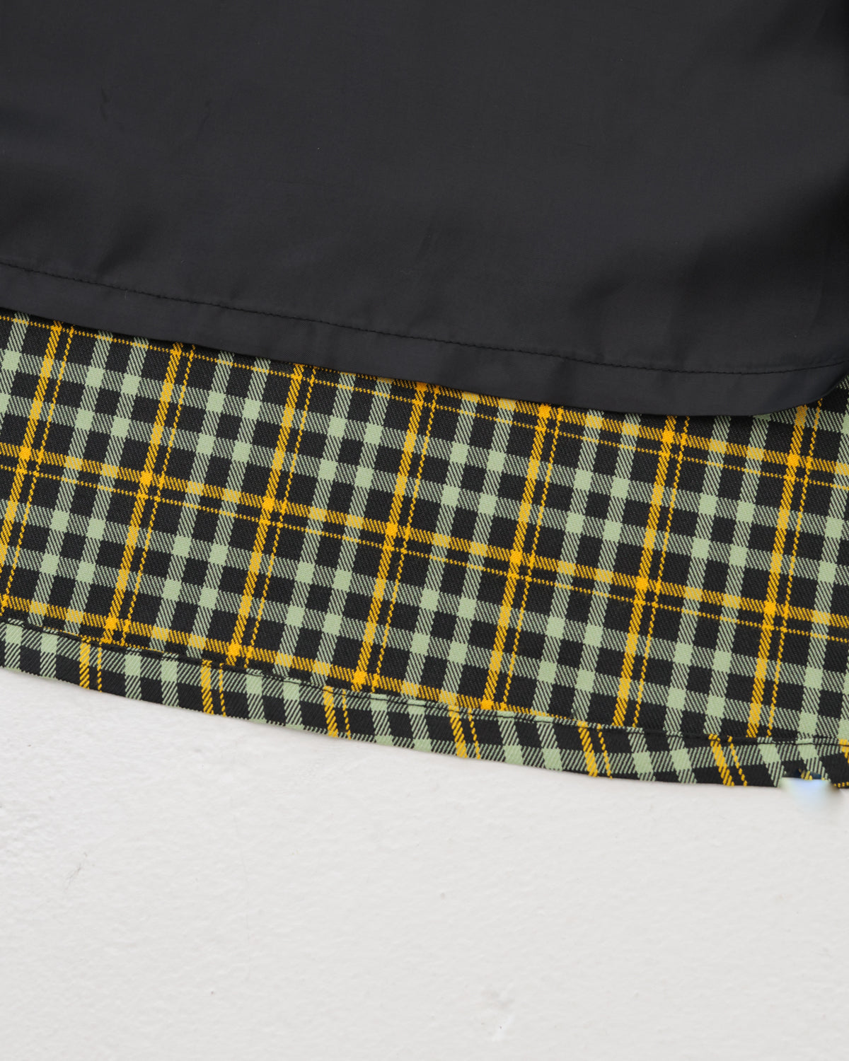 アウターを羽織っているように見えて、実は一着のワンピースという遊び心のあるアイテム。秋冬の定番柄であるチェックを大胆に使いつつ、色と柄を切り替えることで甘さと辛さの匙加減を絶妙なバランスで仕上げました。ジッパーを全て開けてロングアウターのようにお使いいただくのもオススメです。