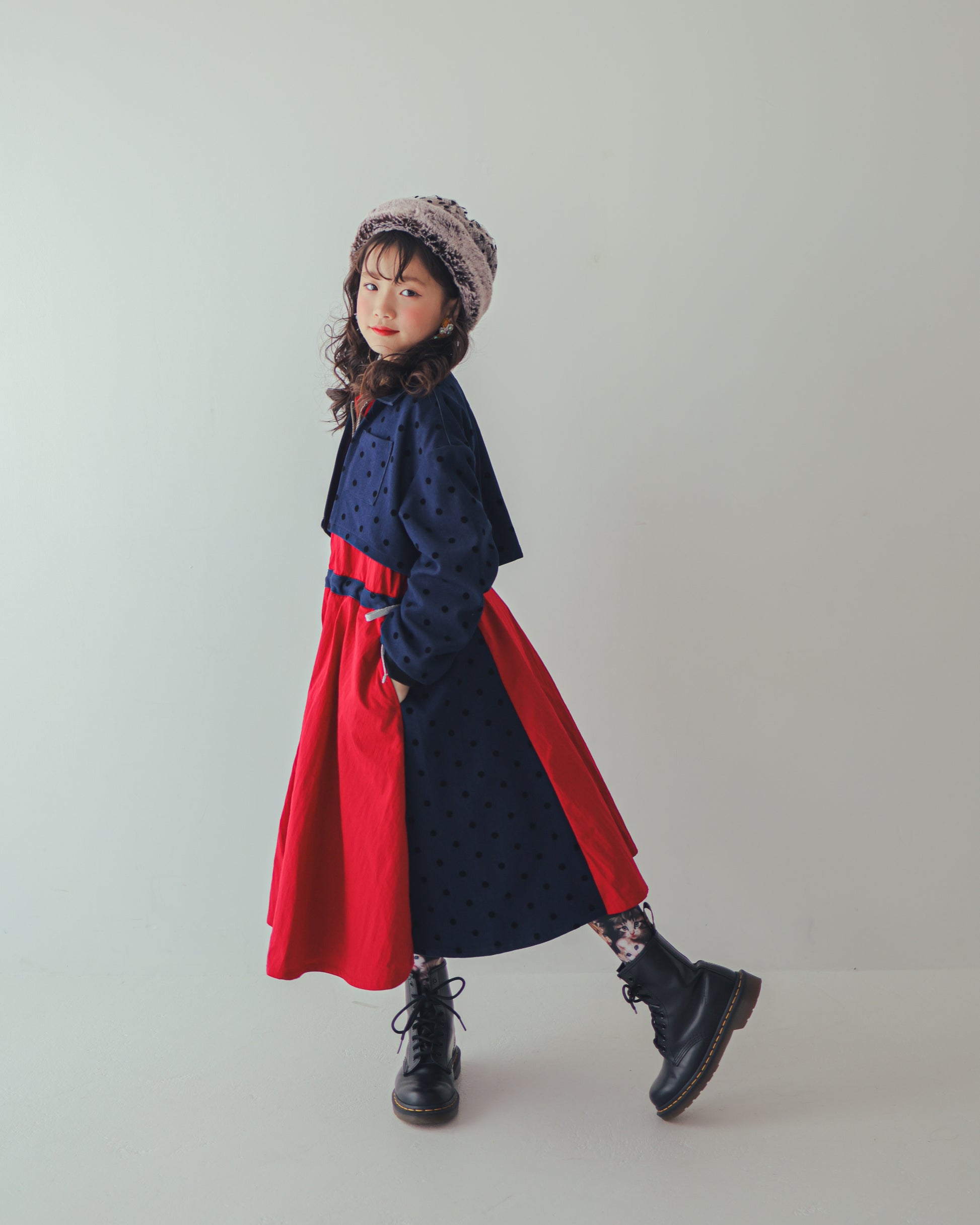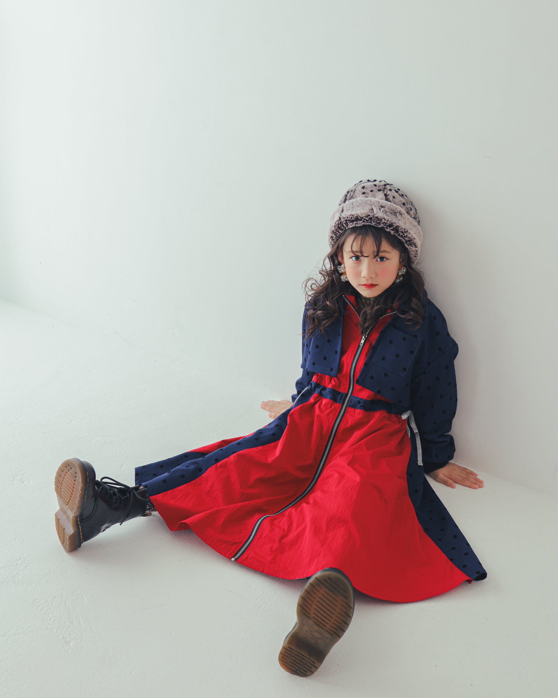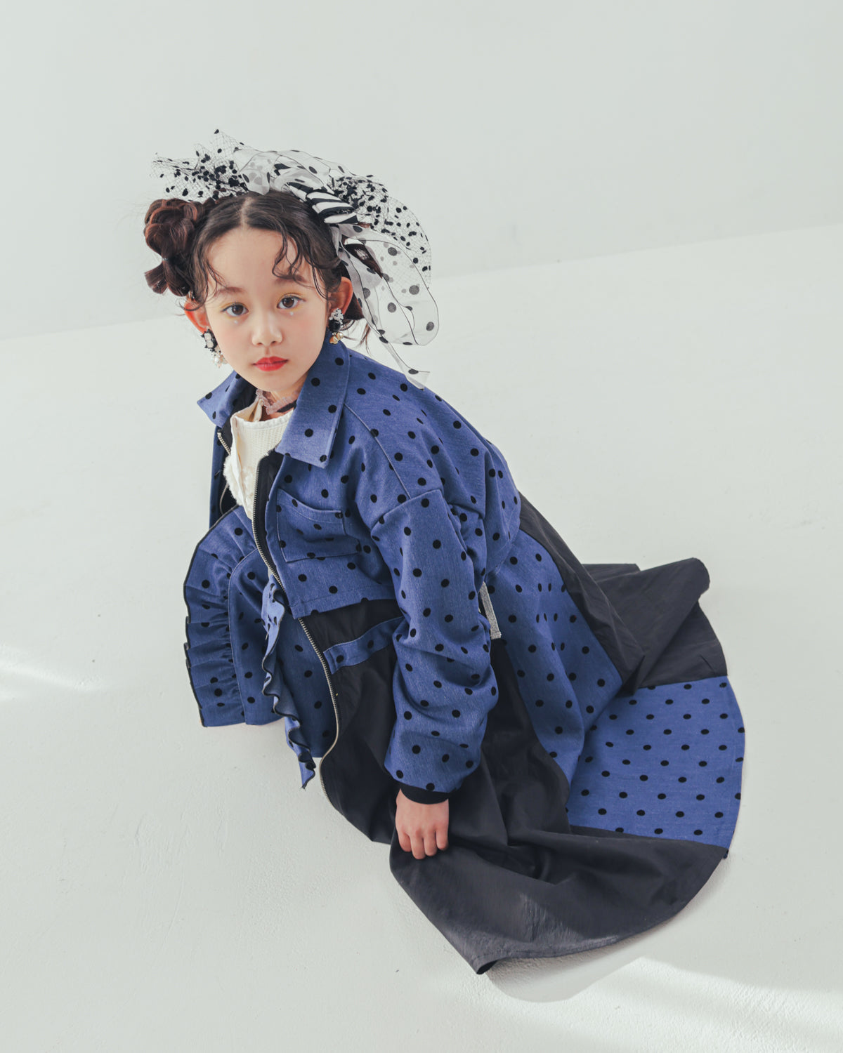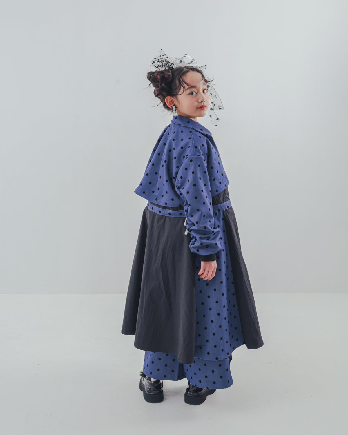 アウターを重ねているように見えるユニークなワンピースは、ドット模様のダンガリーを使うことでカジュアルキュートな一着に!