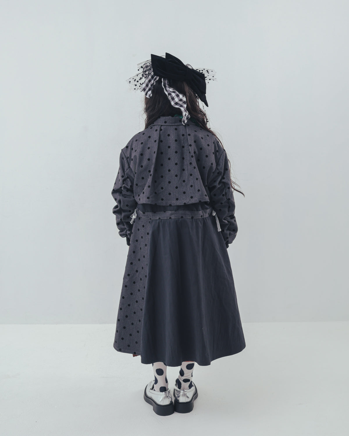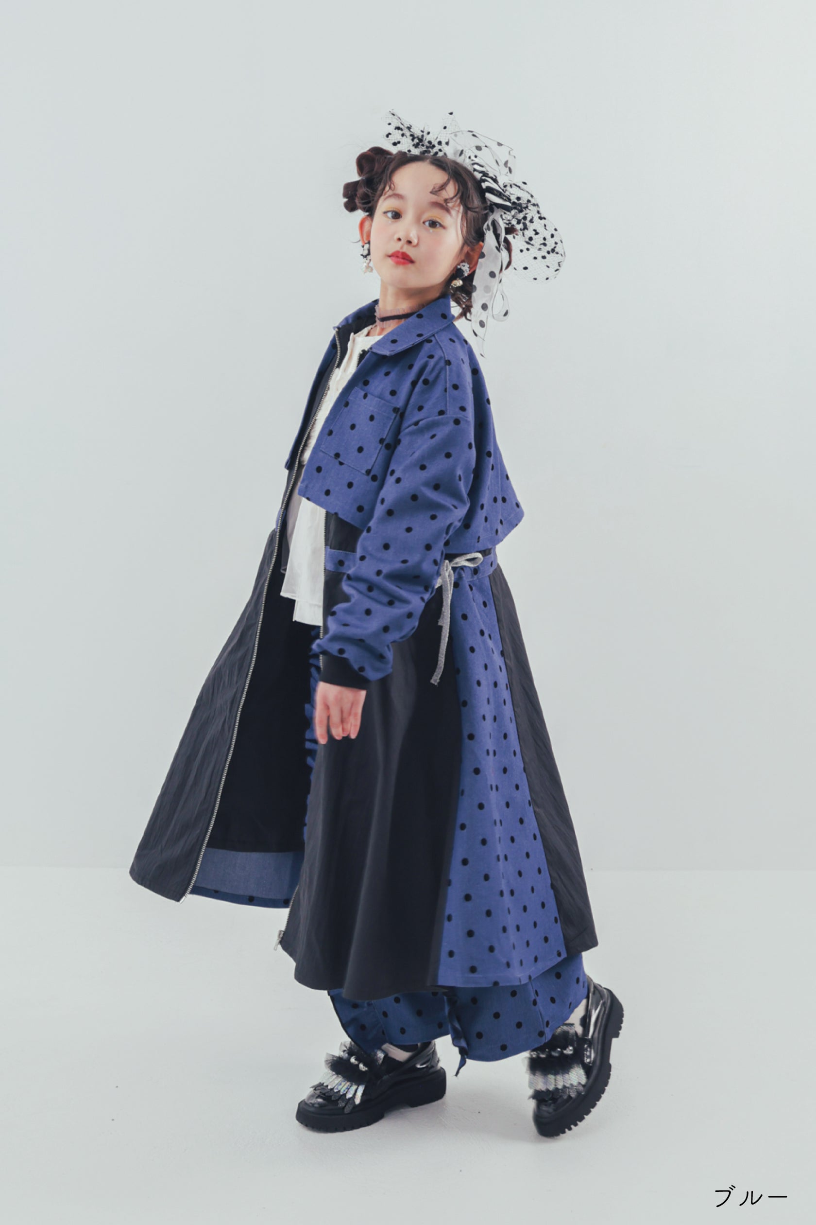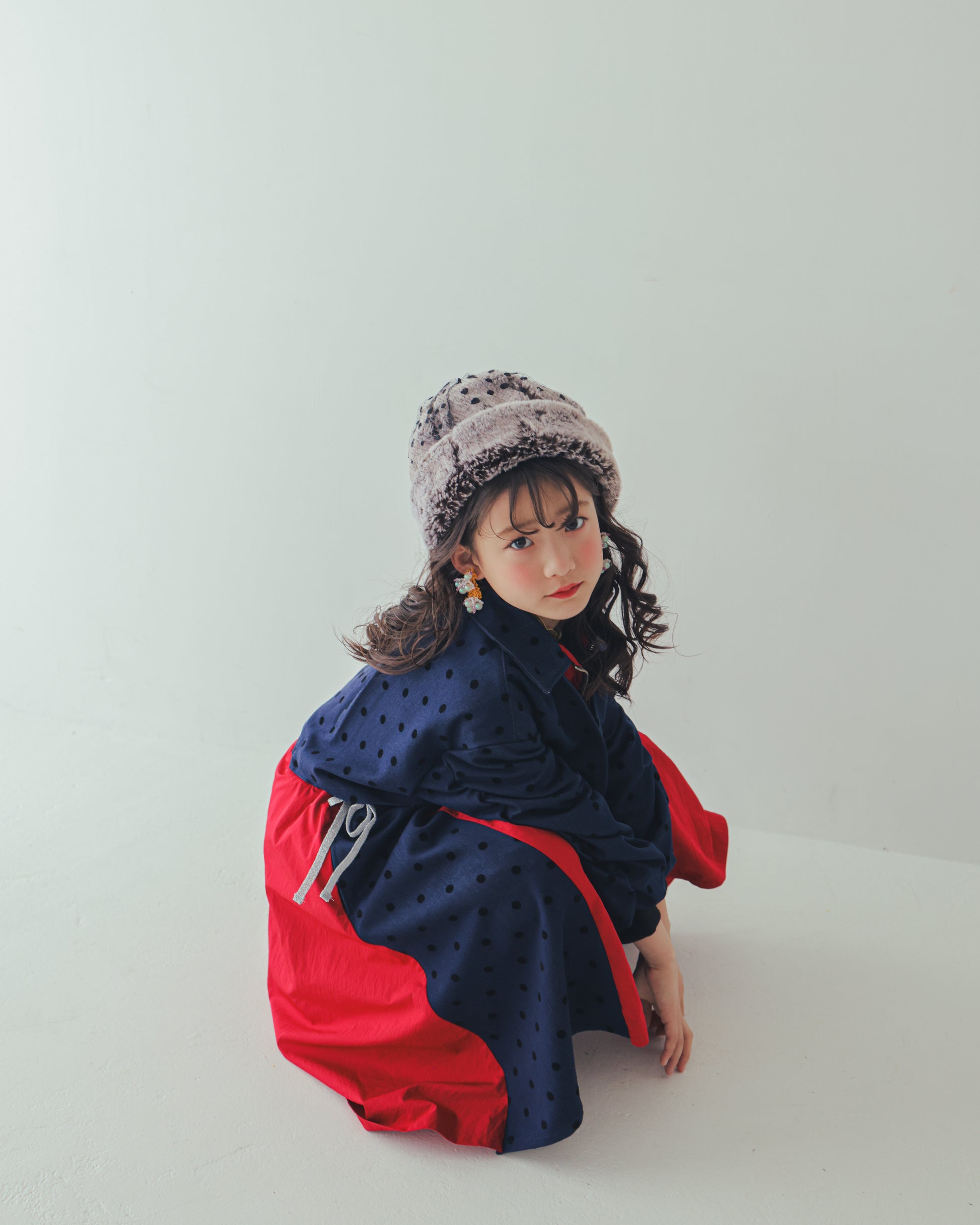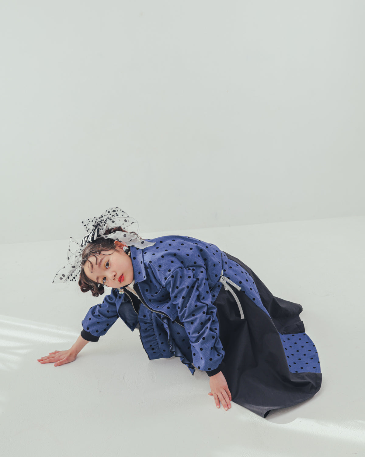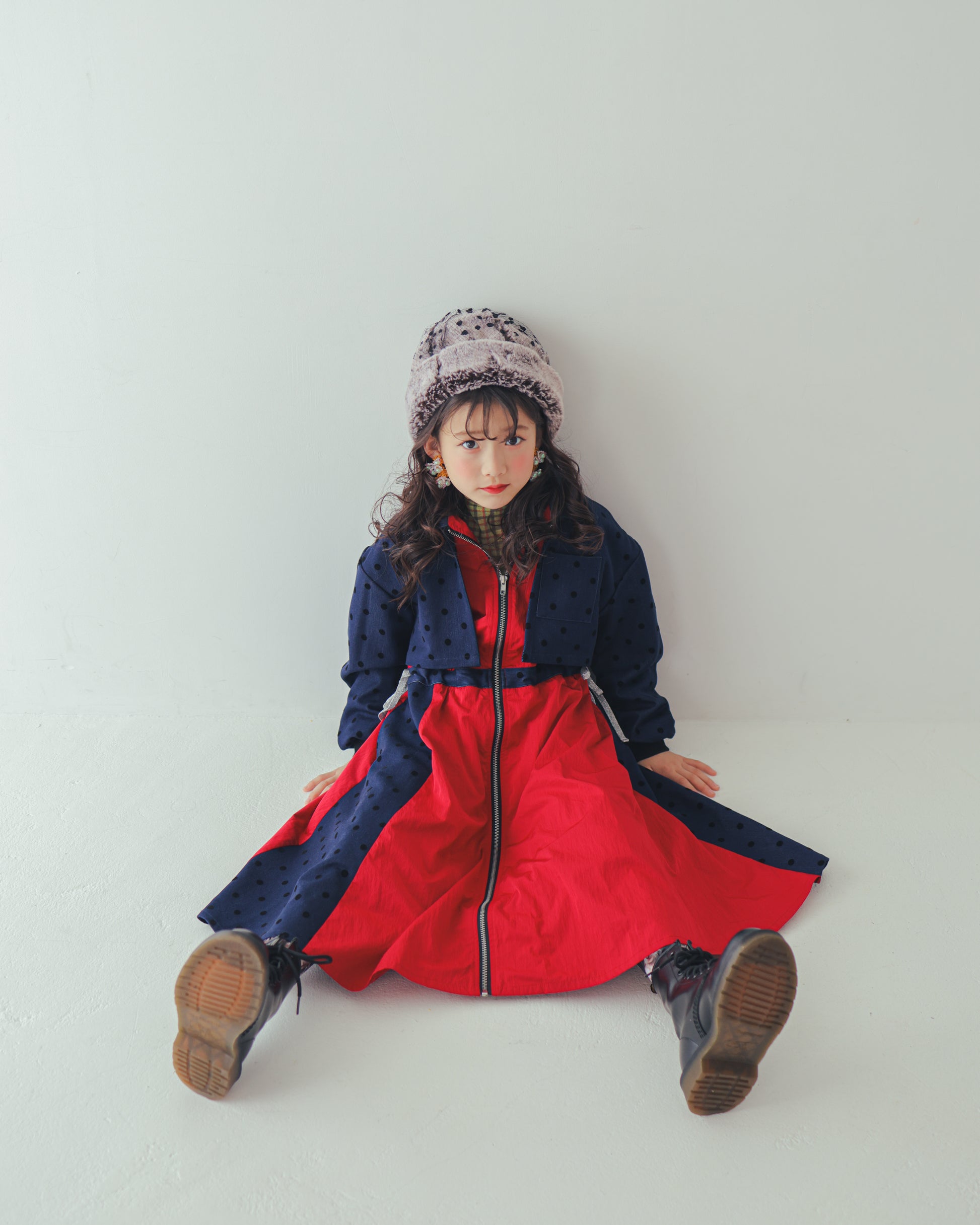 アウターを重ねているように見えるユニークなワンピースは、ドット模様のダンガリーを使うことでカジュアルキュートな一着に!