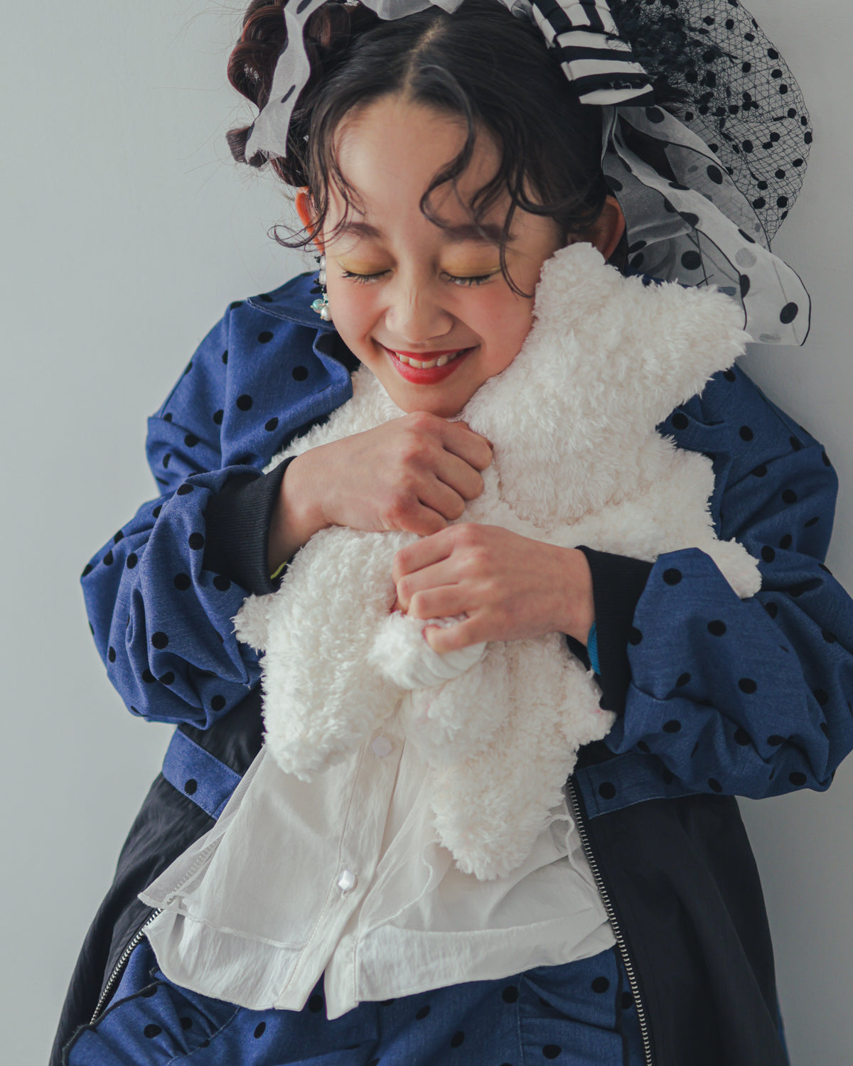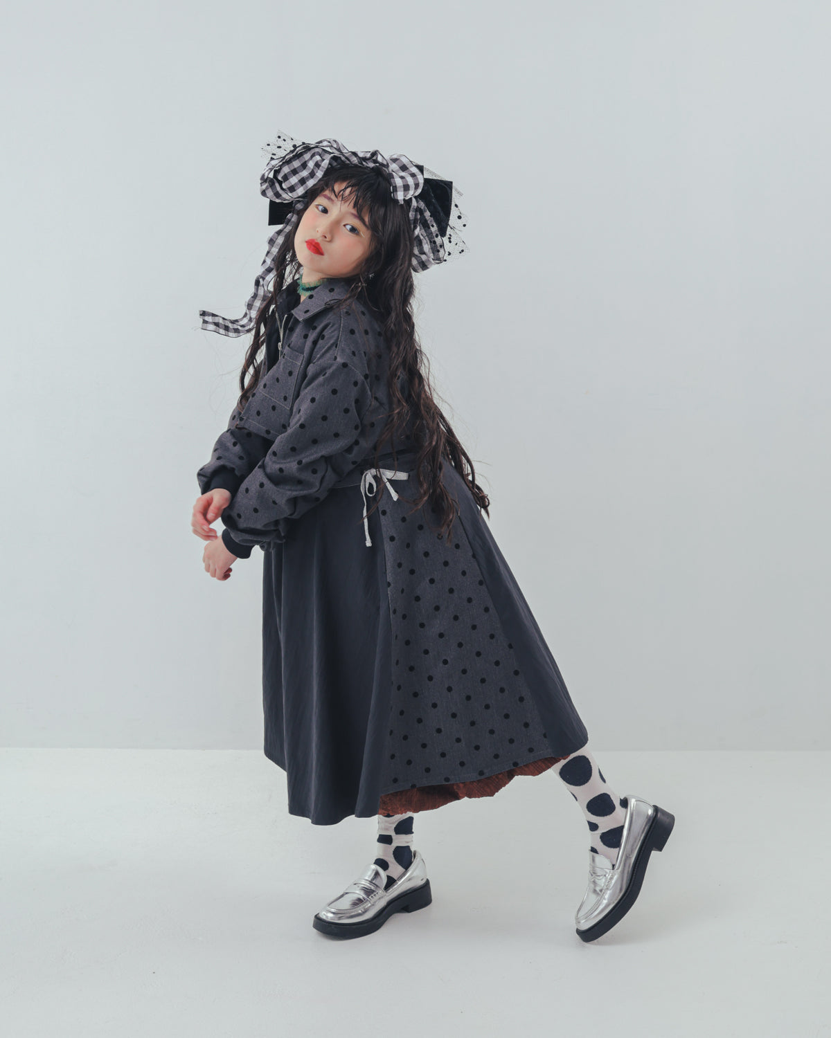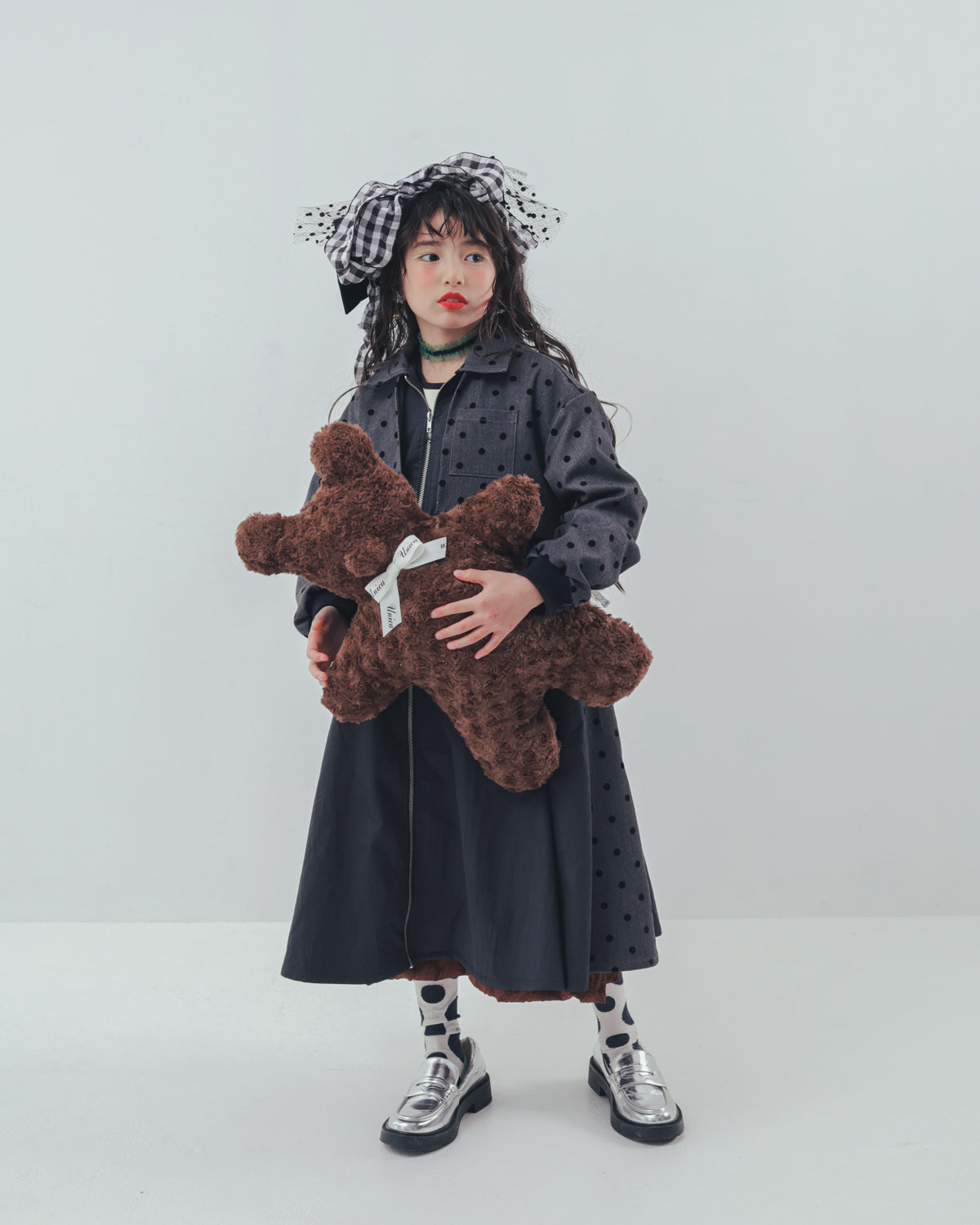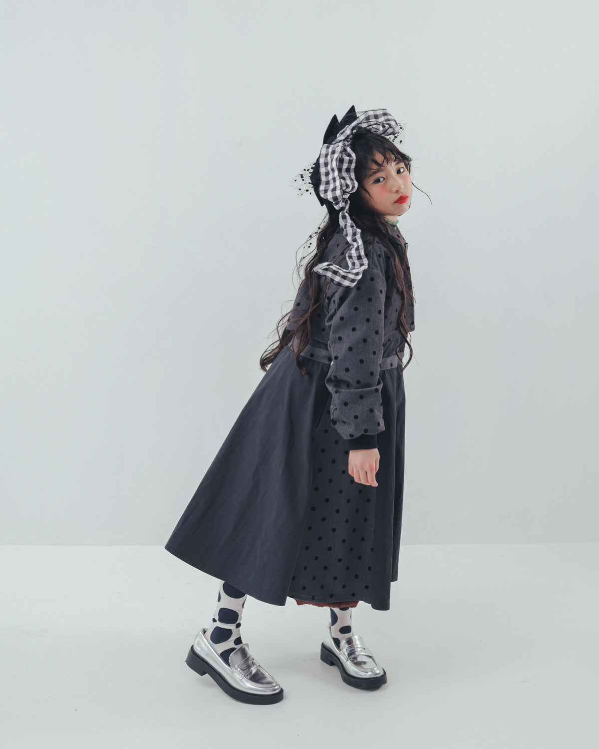 アウターを重ねているように見えるユニークなワンピースは、ドット模様のダンガリーを使うことでカジュアルキュートな一着に!