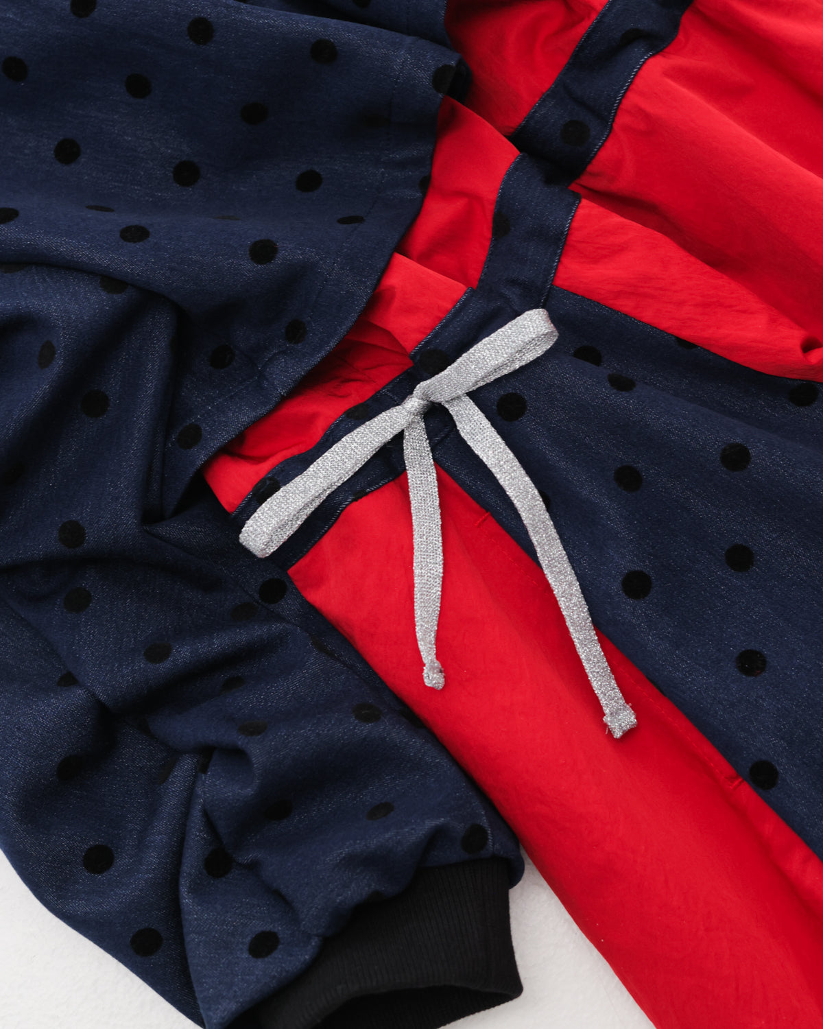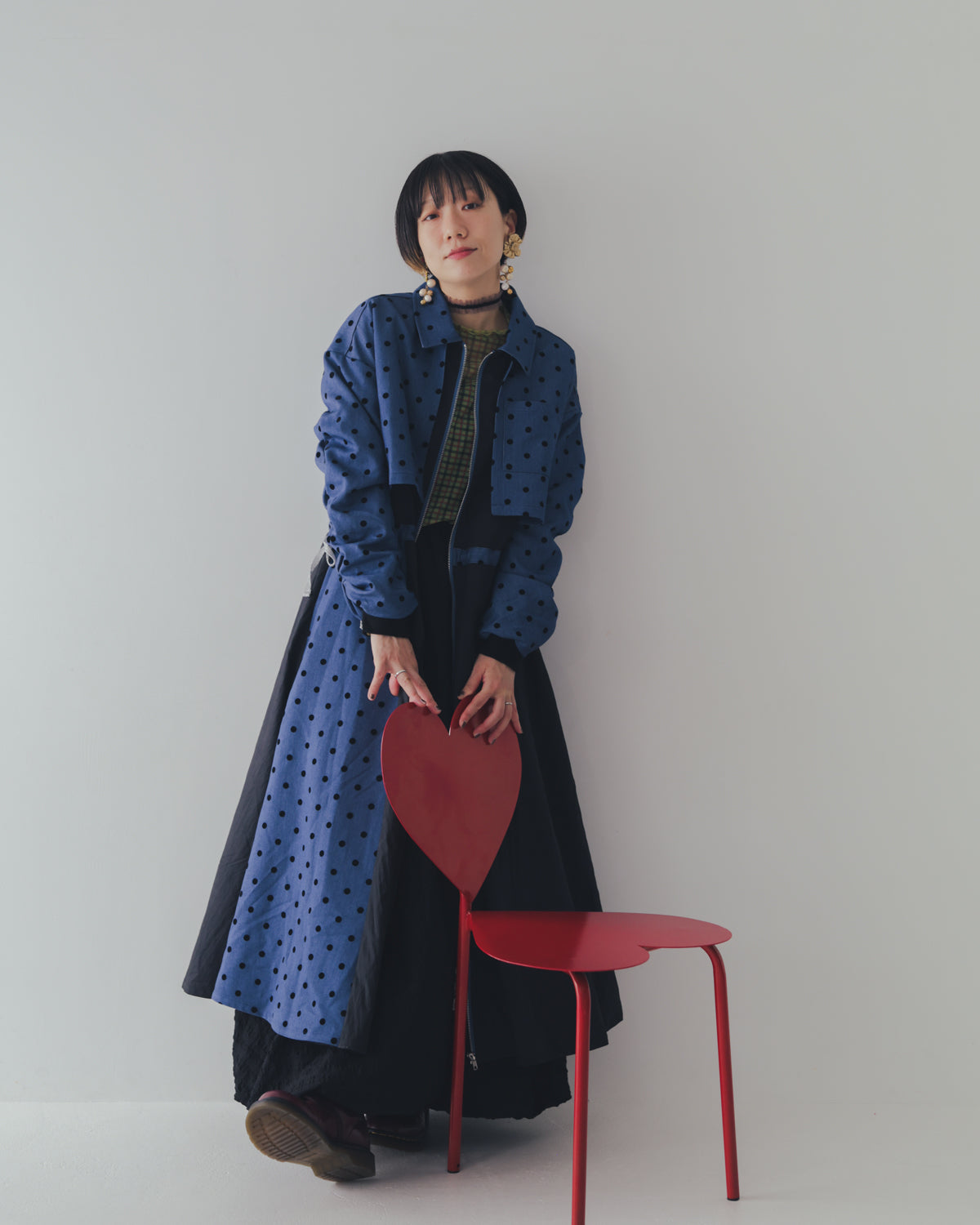 アウターを重ねているように見えるユニークなワンピースは、ドット模様のダンガリーを使うことでカジュアルキュートな一着に!