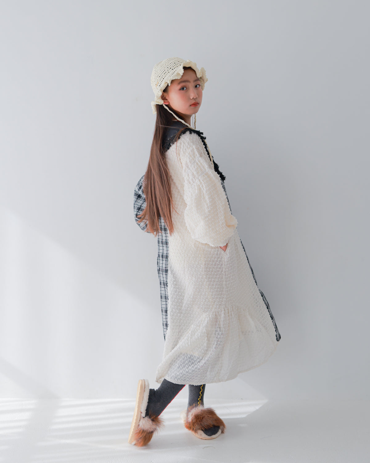 シックな色展開でありながら、異なる素材を組み合わせることでニュアンスあるアイテムに仕上げた一着です。 規則性のあるチェック柄に施した切り替えやシャーリングには、アイテムにアクセントを付けると共にデザイン的なリズムを生み出す効果も。 カラフルなタイツやソックスなどで足元に差し色を入れてみたりと、モノトーンだからこそのアレンジをお楽しみ下さい。