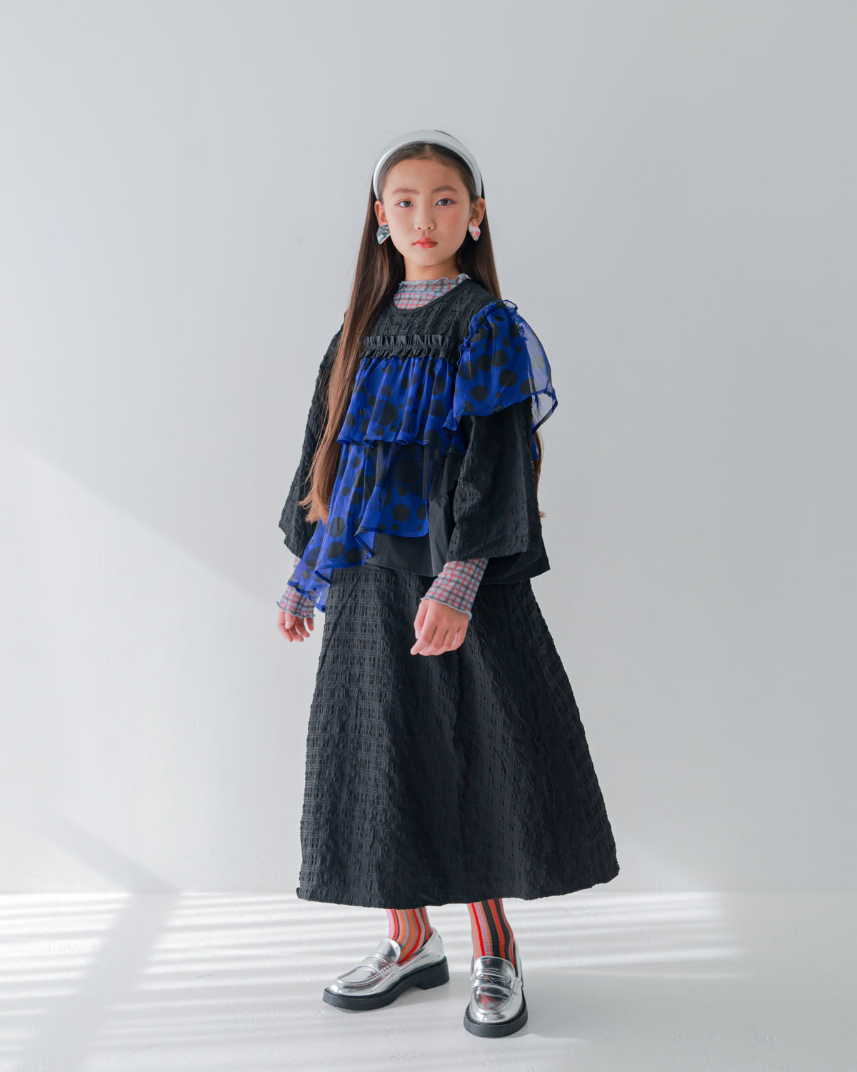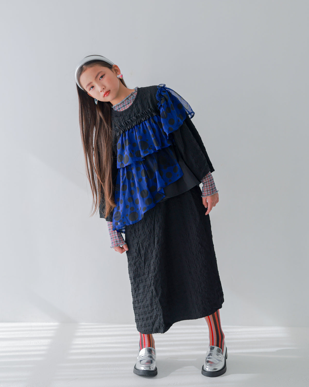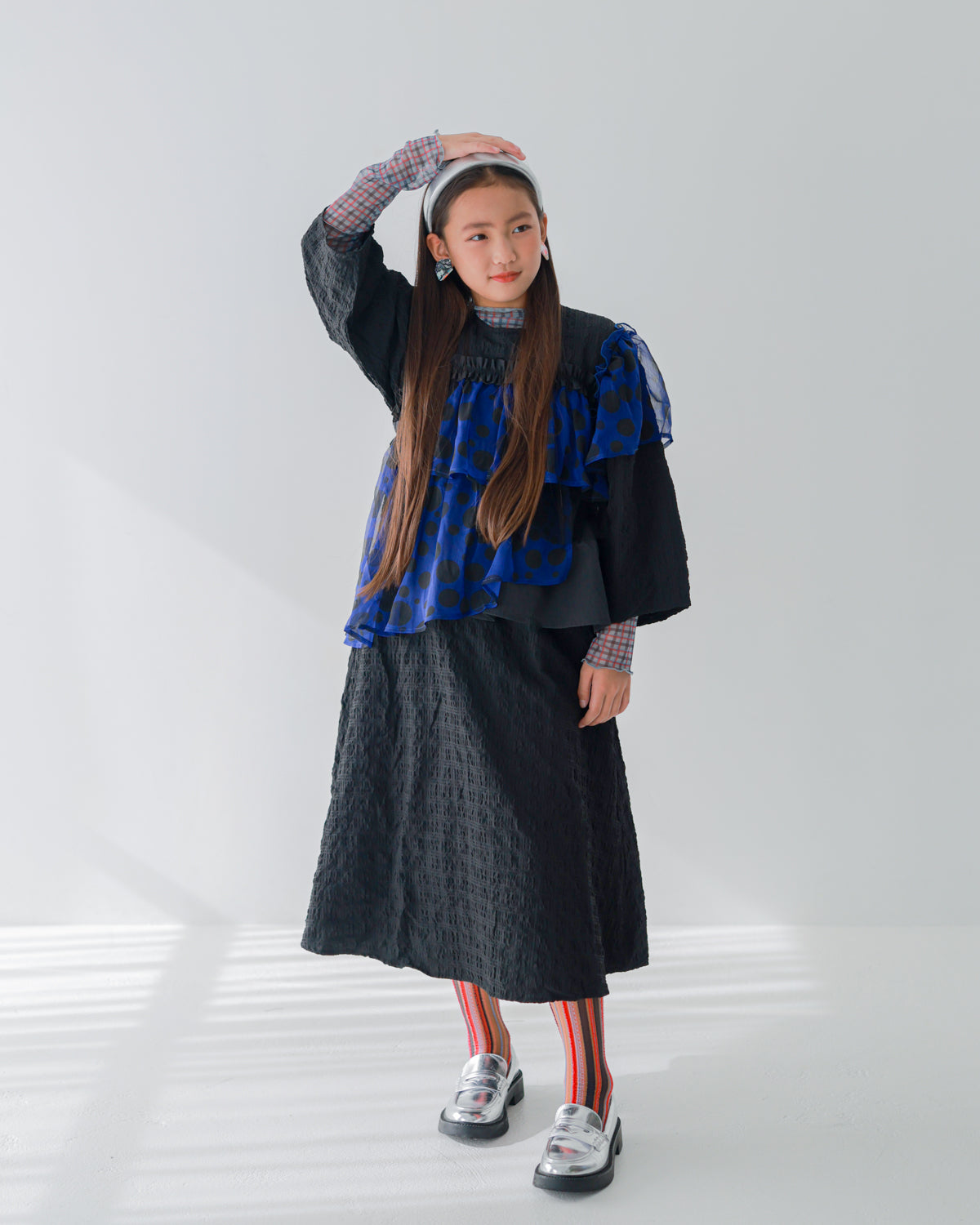 様々な生地を層のように重ねて立体感を演出したワンピースです。大きさの異なるドットをランダムに散らした生地を肩から胸元、サイドへと少しずつずらしながら添えることで、インパクトのあるアイテムに仕上げました。ブラックをベースに、グレーがかったオフとクールなブルーの2色でそれぞれお作りしているため、甘くなりすぎないのがポイントです。