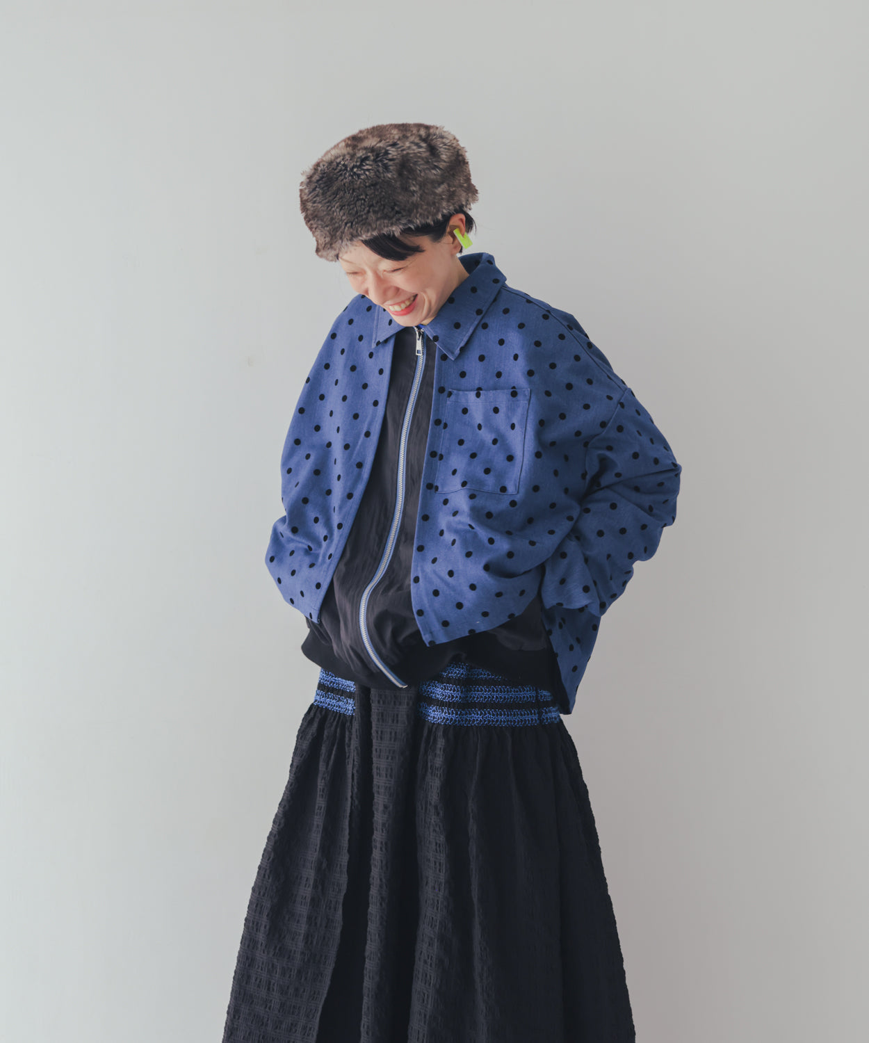 ドット柄のダンガリー生地を使ったジャケットはデニムのような硬さがなく、楽に羽織れるのが嬉しいポイント。 ジッパーをフルオープンにして中に重ねたアイテムを見せるも良し、首元まできっちり上げて襟付きのシャツ感覚で着るも良し! 滑りを良くして型崩れを防ぐ裏地付きです。
