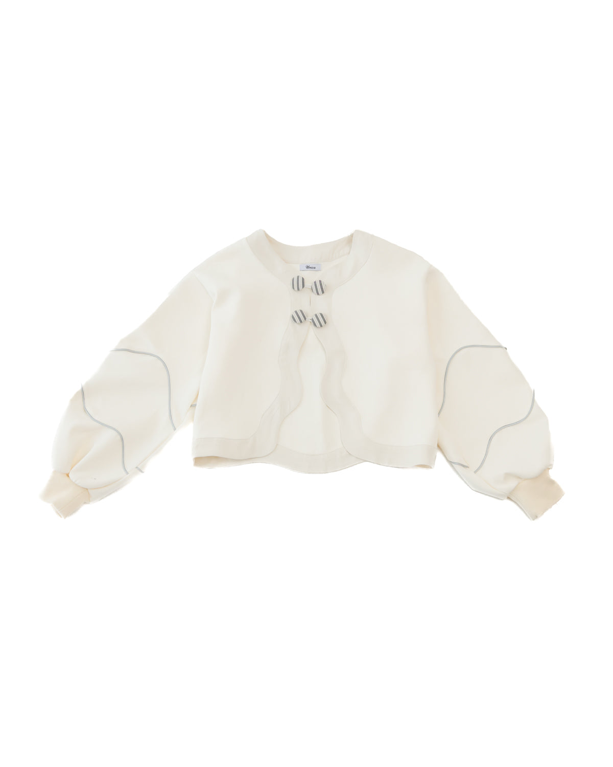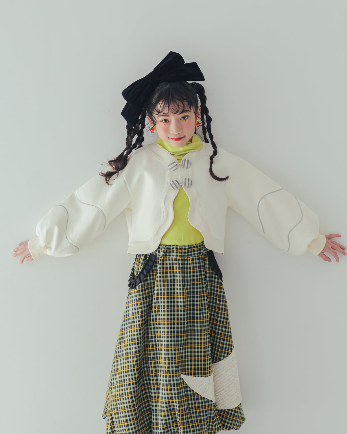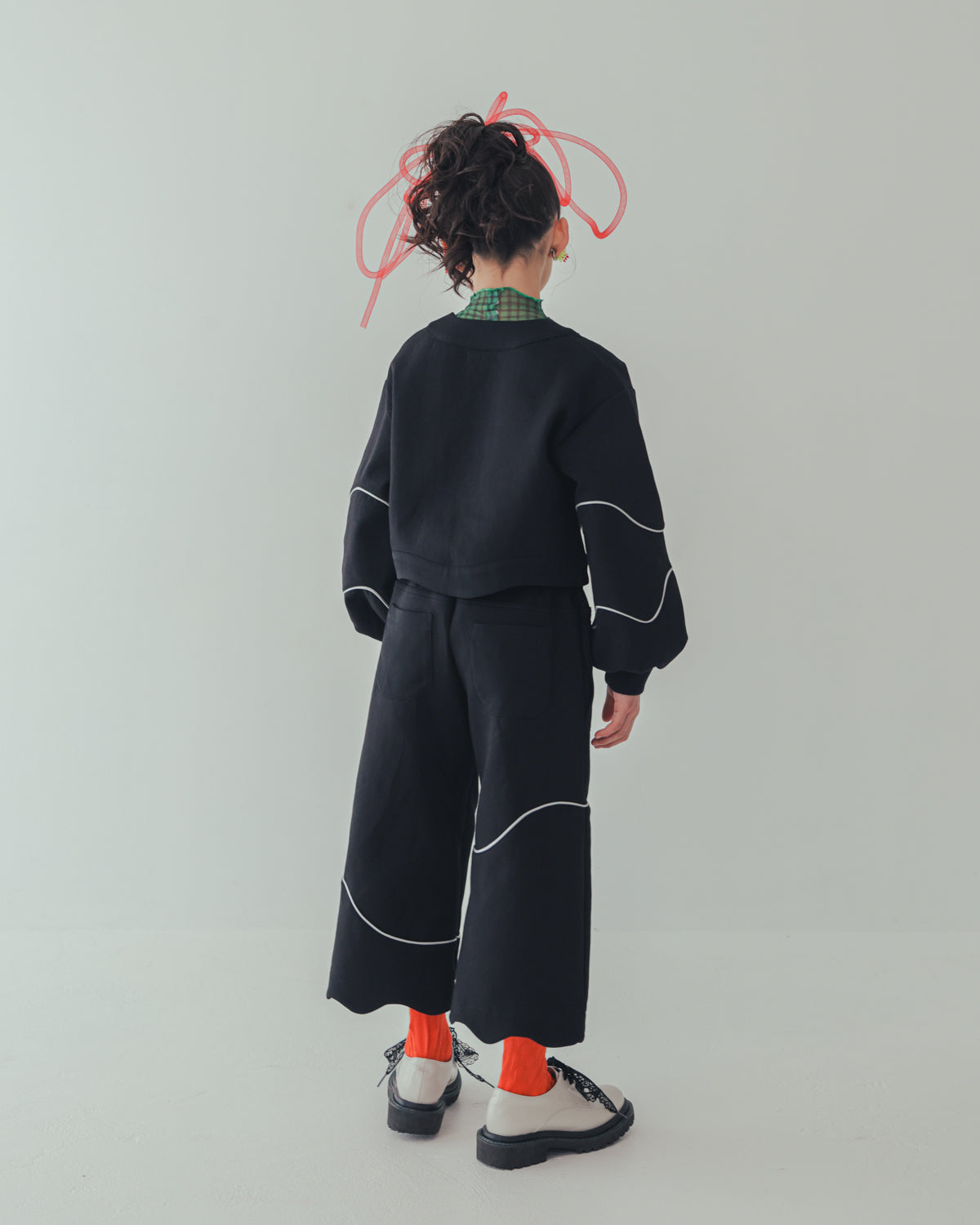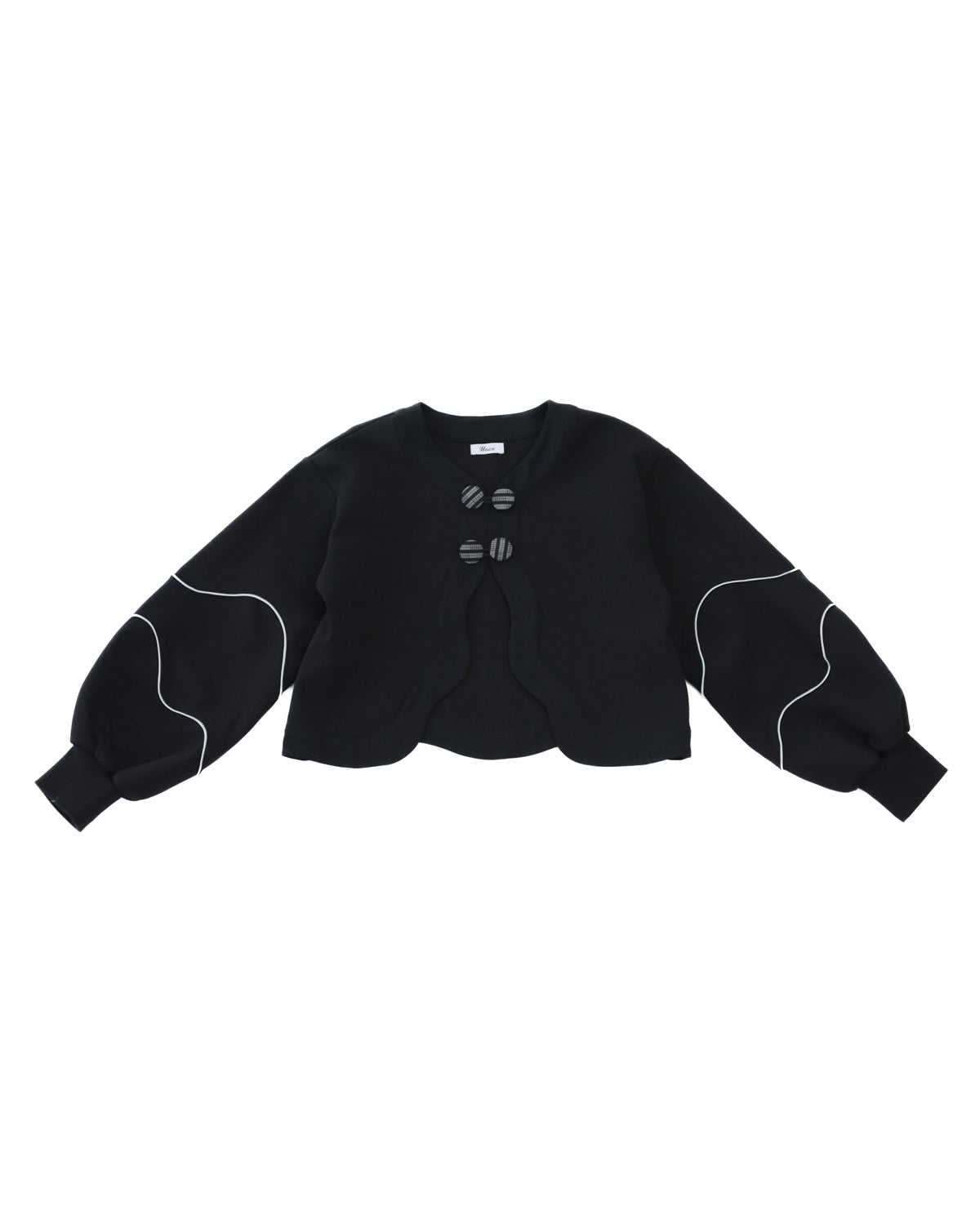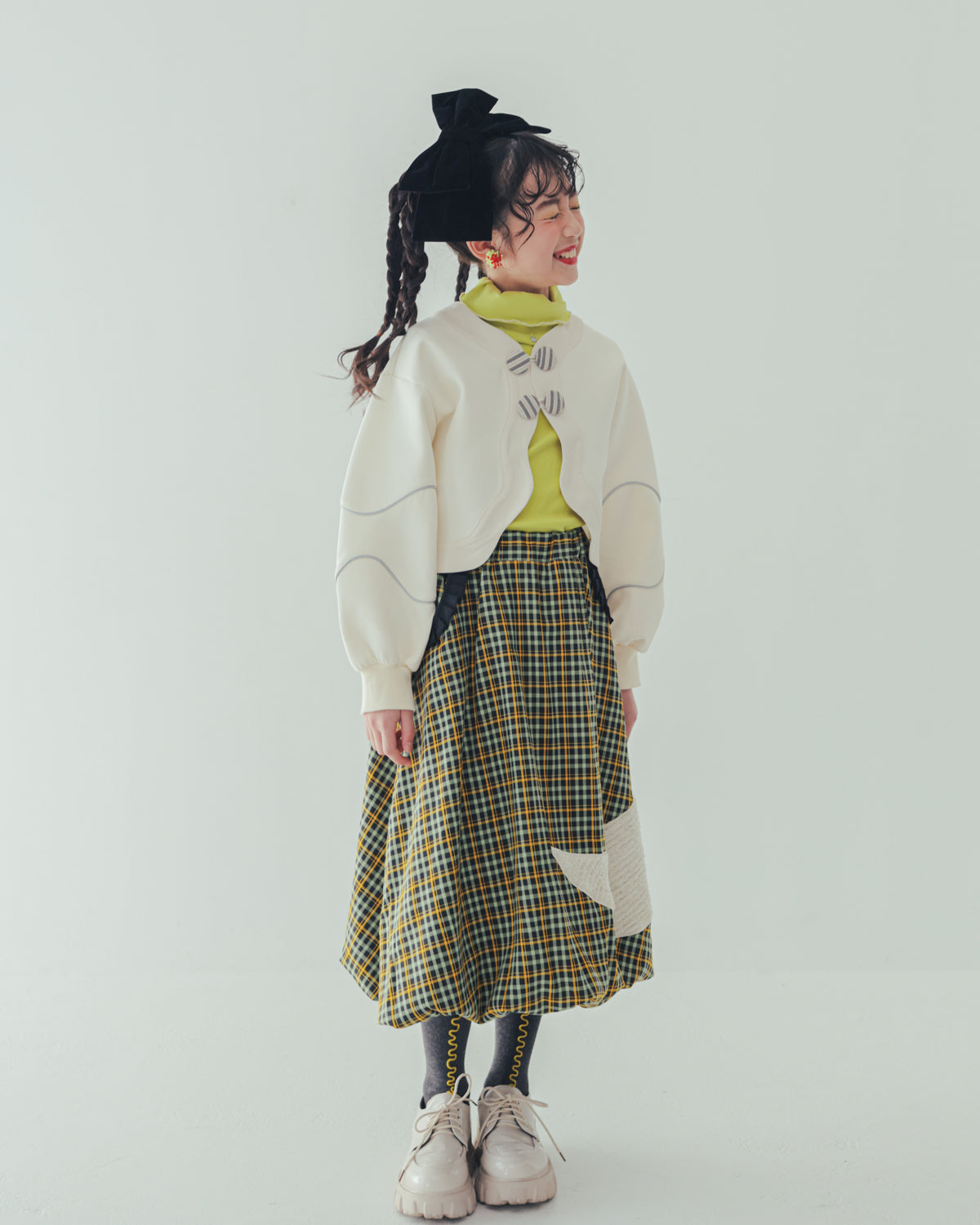 前身頃や裾、袖のパイピングなど、全体的に波打つようなデザインを施したボレロは、軽くシワになりにくいボンディング生地を使用。 少し肌寒い秋口にはカットソーの上に重ねて、本格的な冬の季節にはレイヤードアイテムのひとつとして合わせるなど、活躍する機会が多いのも嬉しいポイントです。 くるみボタンで上品な印象をプラスしました。