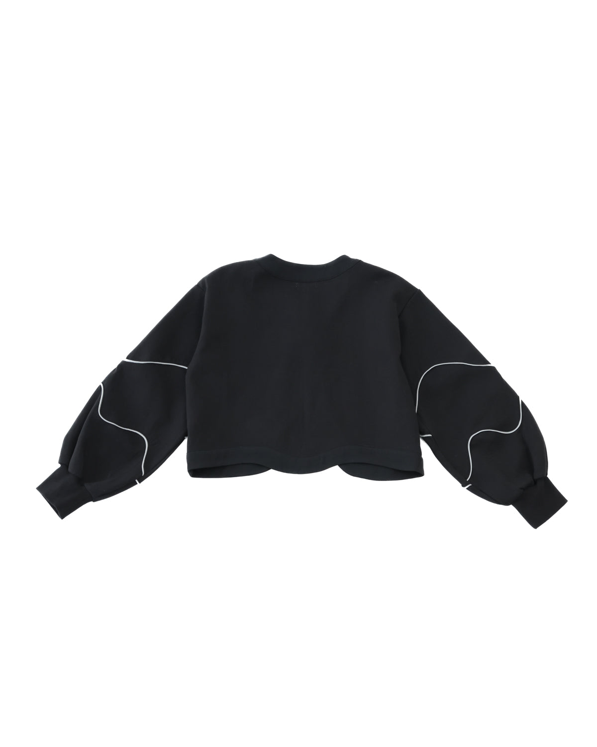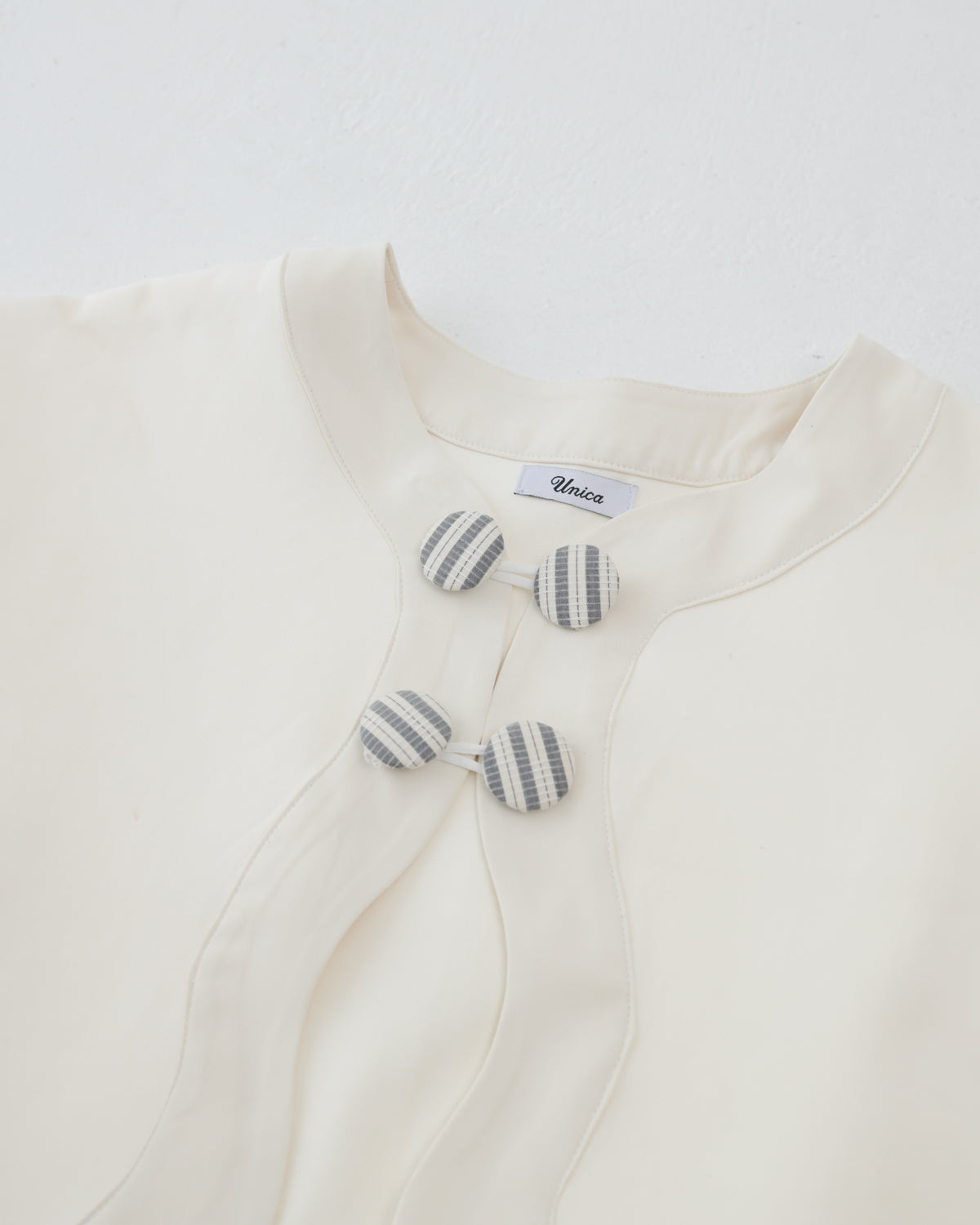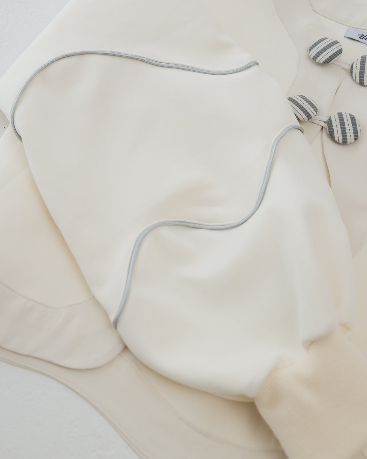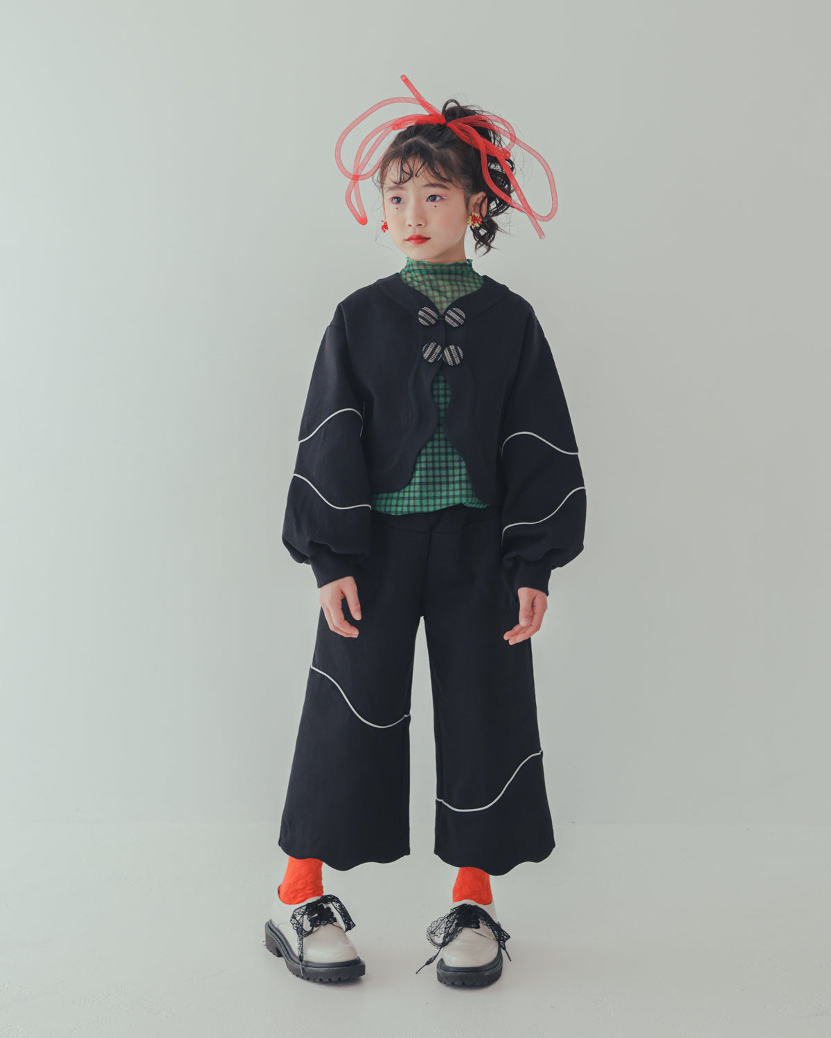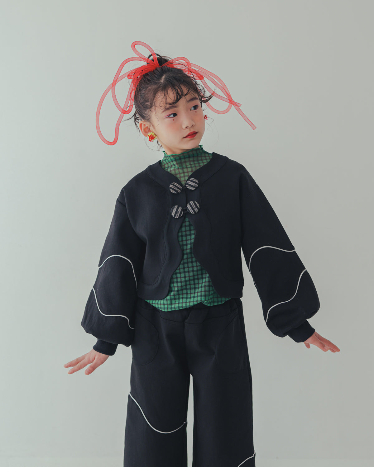 前身頃や裾、袖のパイピングなど、全体的に波打つようなデザインを施したボレロは、軽くシワになりにくいボンディング生地を使用。 少し肌寒い秋口にはカットソーの上に重ねて、本格的な冬の季節にはレイヤードアイテムのひとつとして合わせるなど、活躍する機会が多いのも嬉しいポイントです。 くるみボタンで上品な印象をプラスしました。
