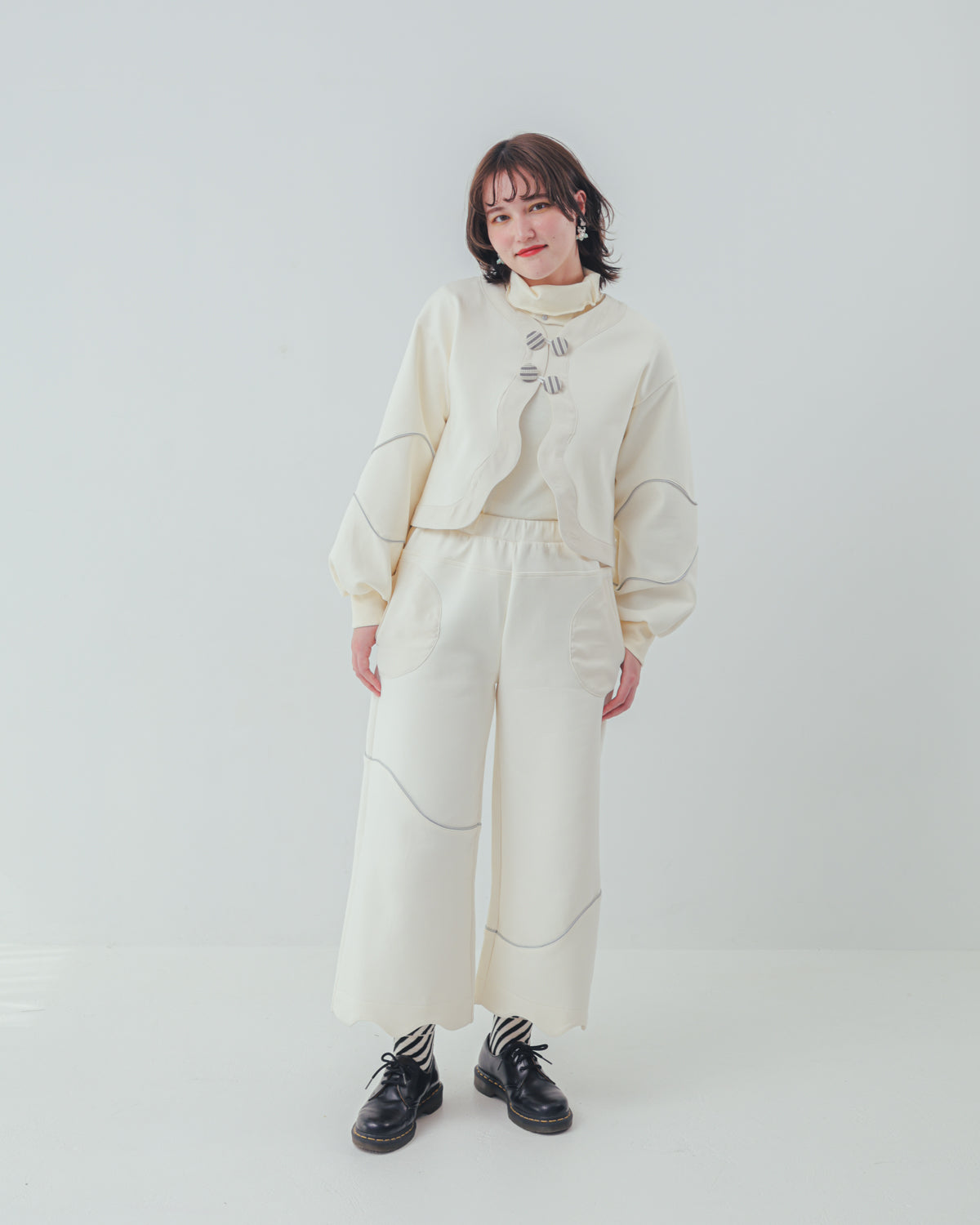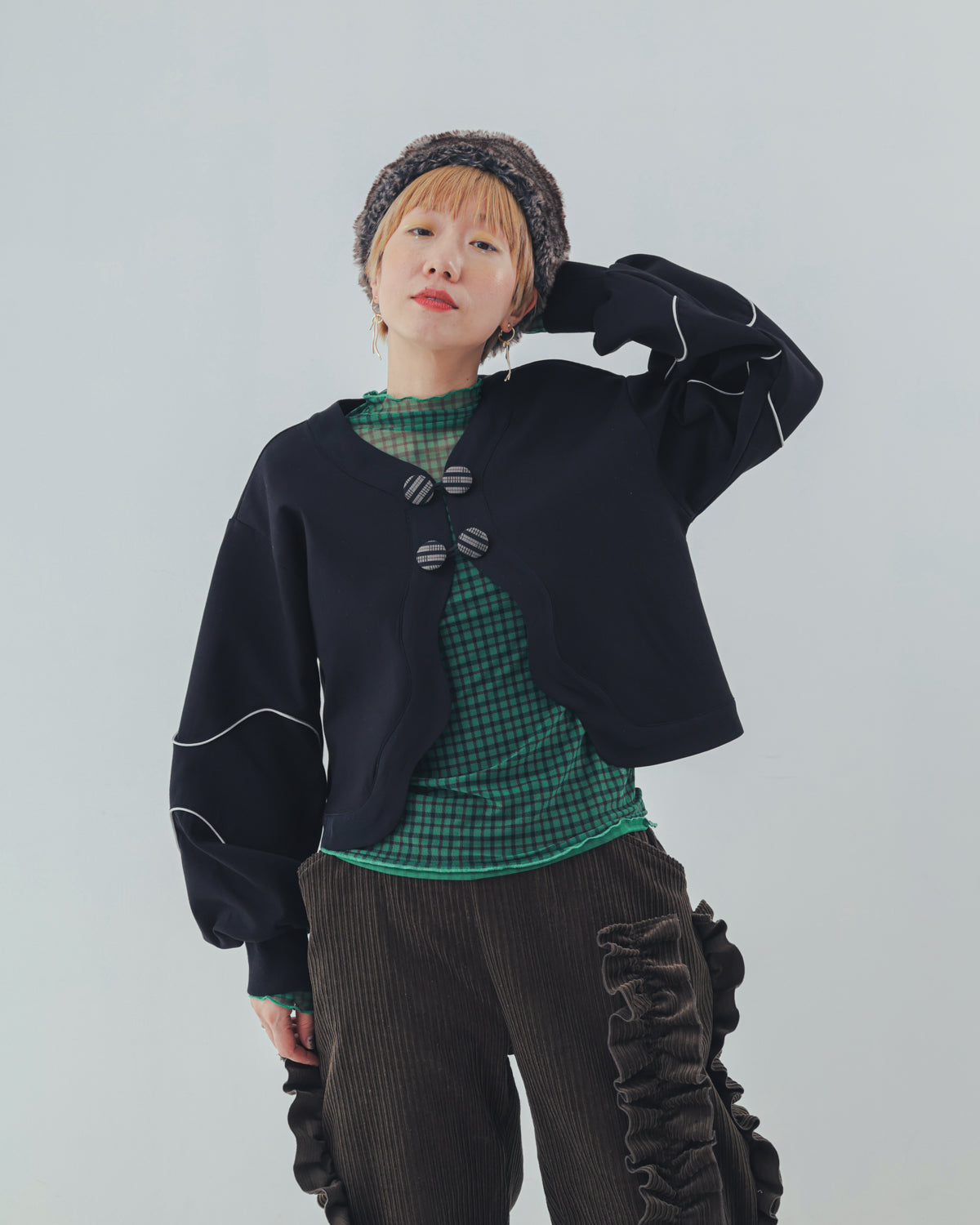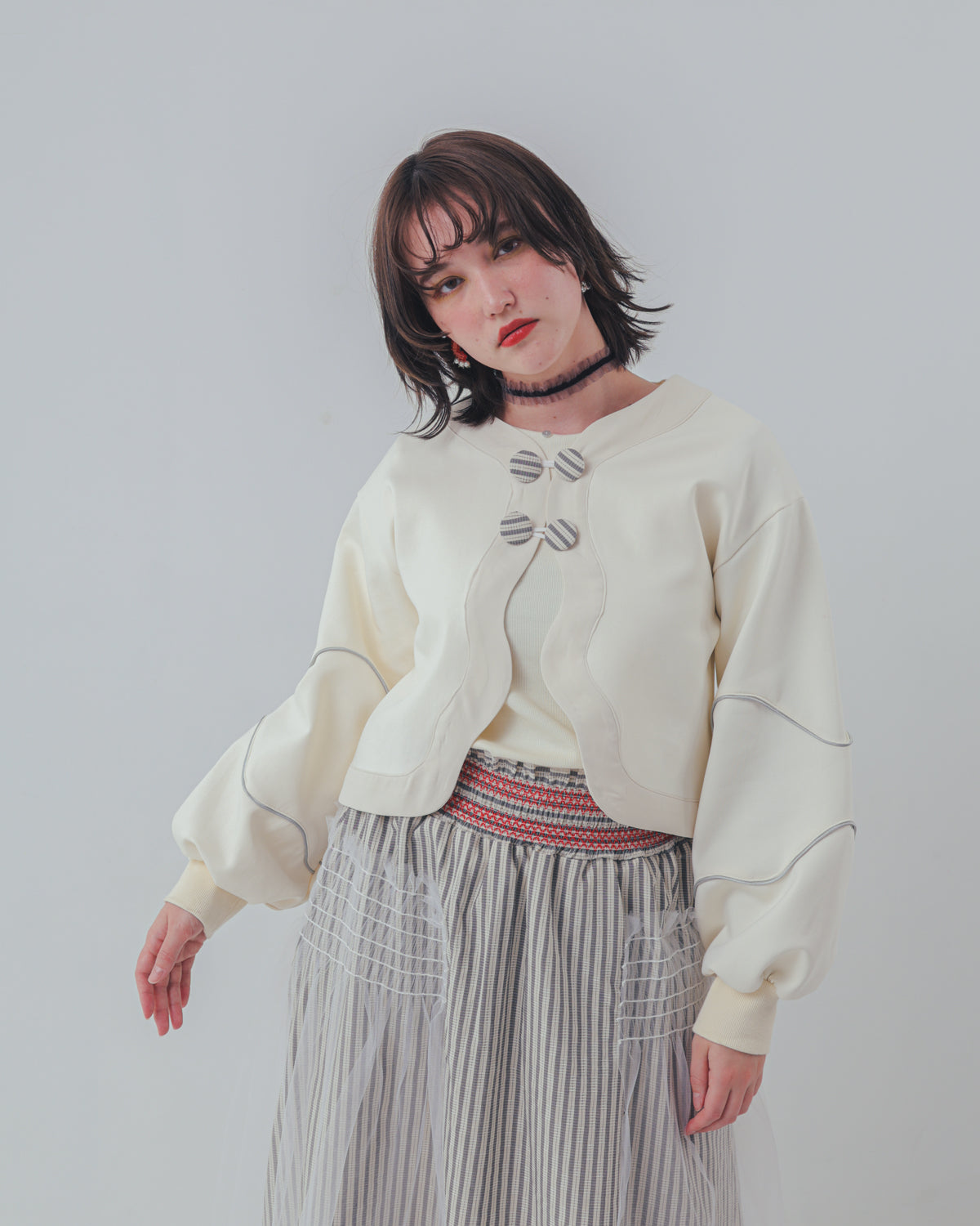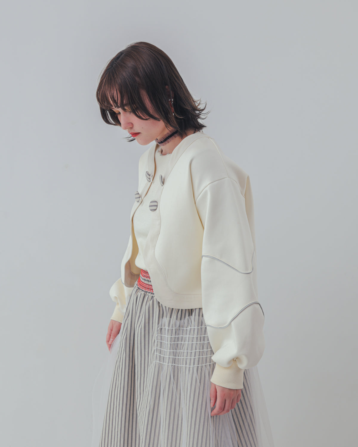前身頃や裾、袖のパイピングなど、全体的に波打つようなデザインを施したボレロは、軽くシワになりにくいボンディング生地を使用。 少し肌寒い秋口にはカットソーの上に重ねて、本格的な冬の季節にはレイヤードアイテムのひとつとして合わせるなど、活躍する機会が多いのも嬉しいポイントです。 くるみボタンで上品な印象をプラスしました。