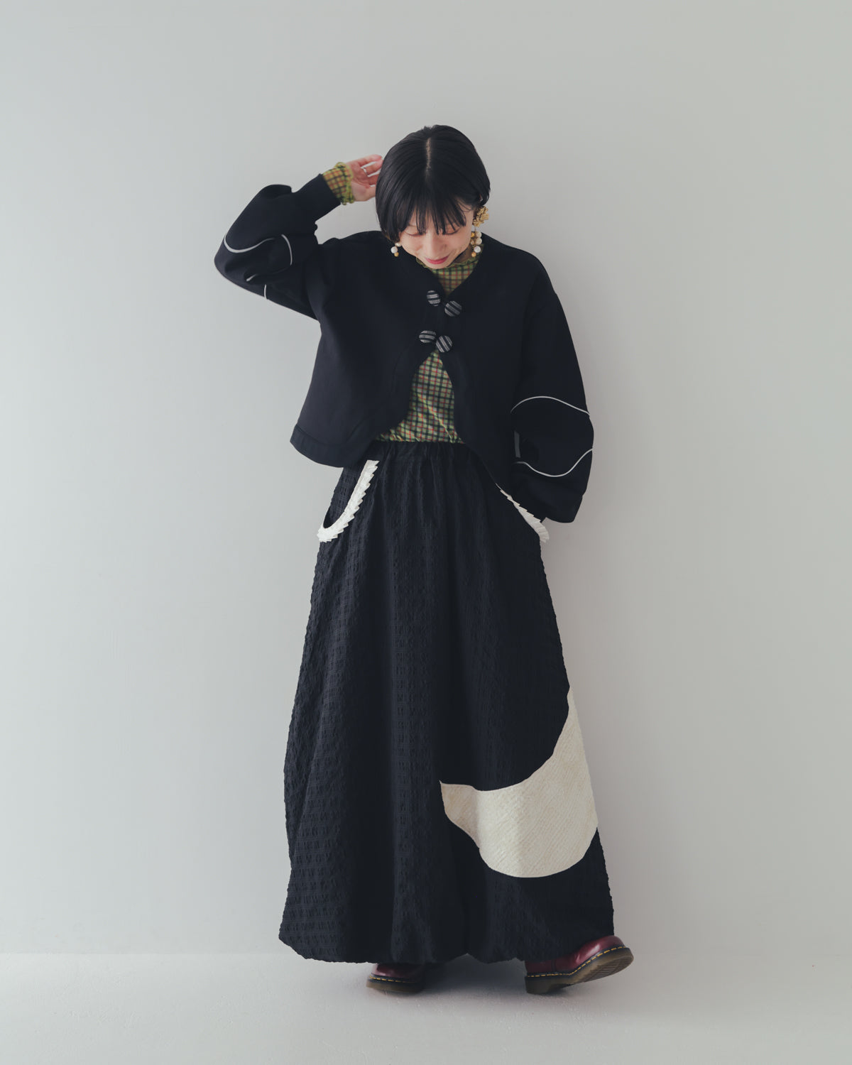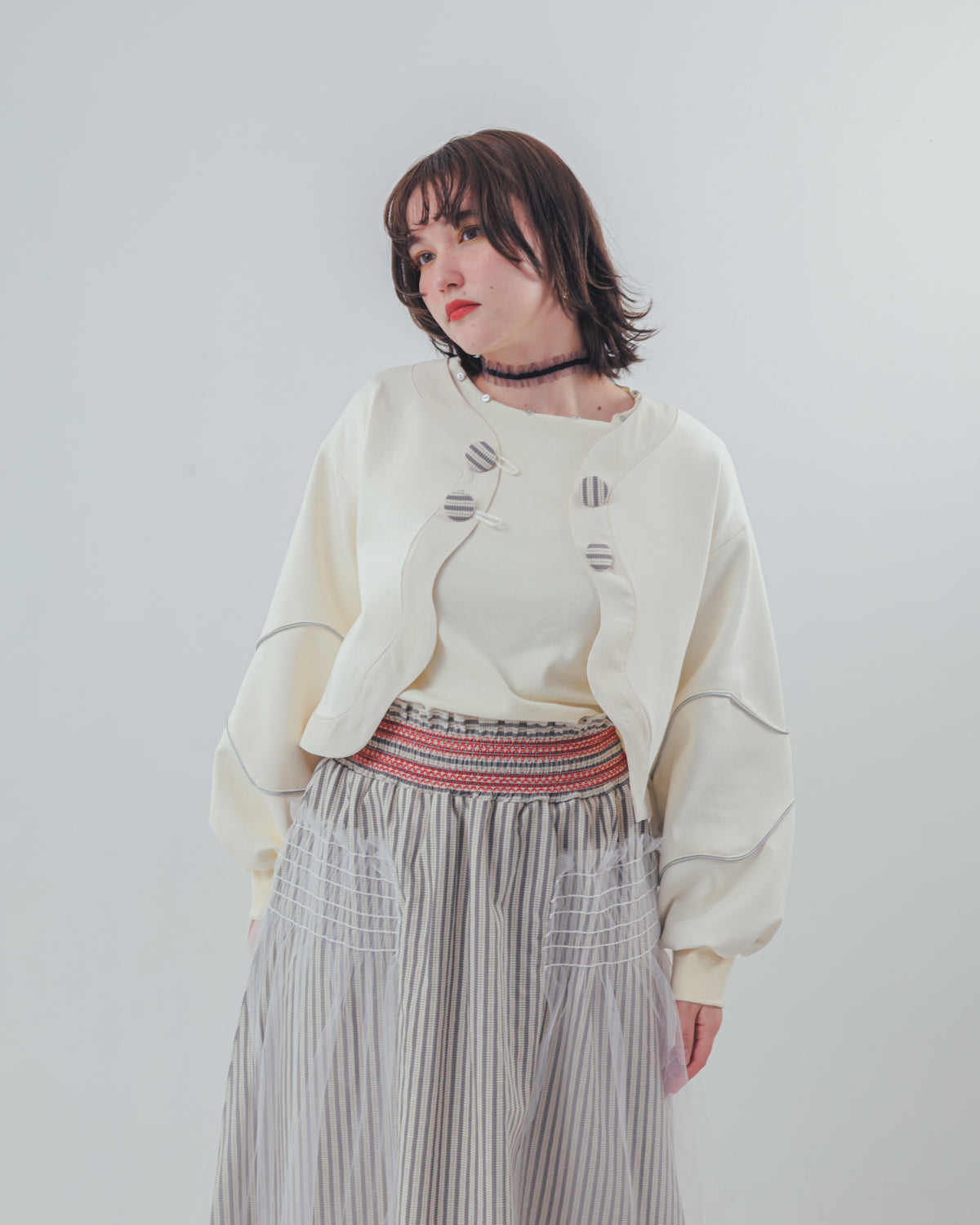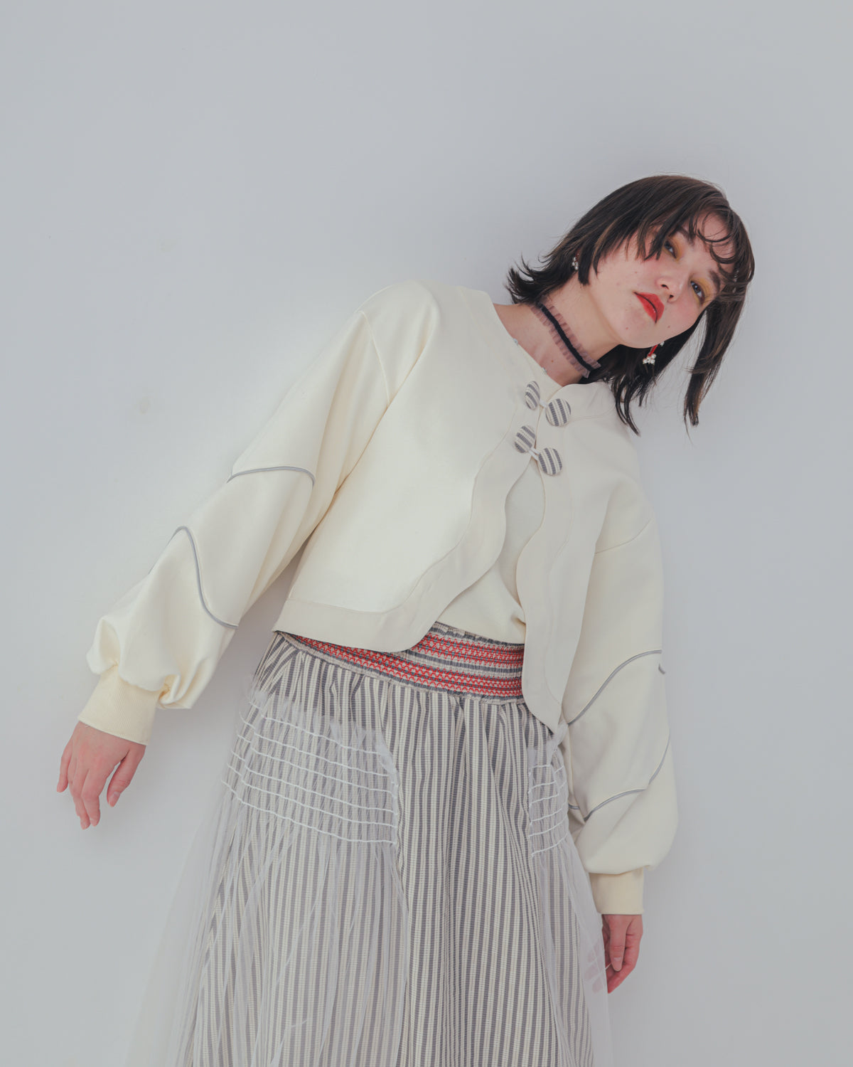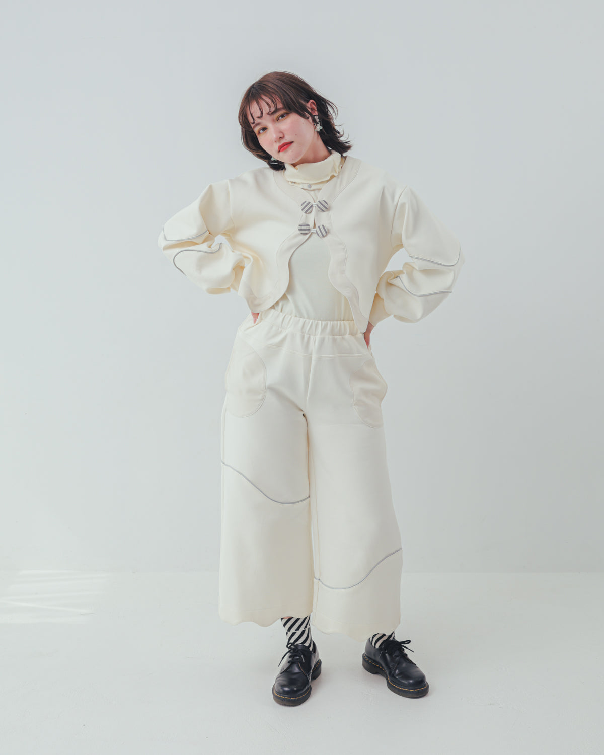 前身頃や裾、袖のパイピングなど、全体的に波打つようなデザインを施したボレロは、軽くシワになりにくいボンディング生地を使用。 少し肌寒い秋口にはカットソーの上に重ねて、本格的な冬の季節にはレイヤードアイテムのひとつとして合わせるなど、活躍する機会が多いのも嬉しいポイントです。 くるみボタンで上品な印象をプラスしました。