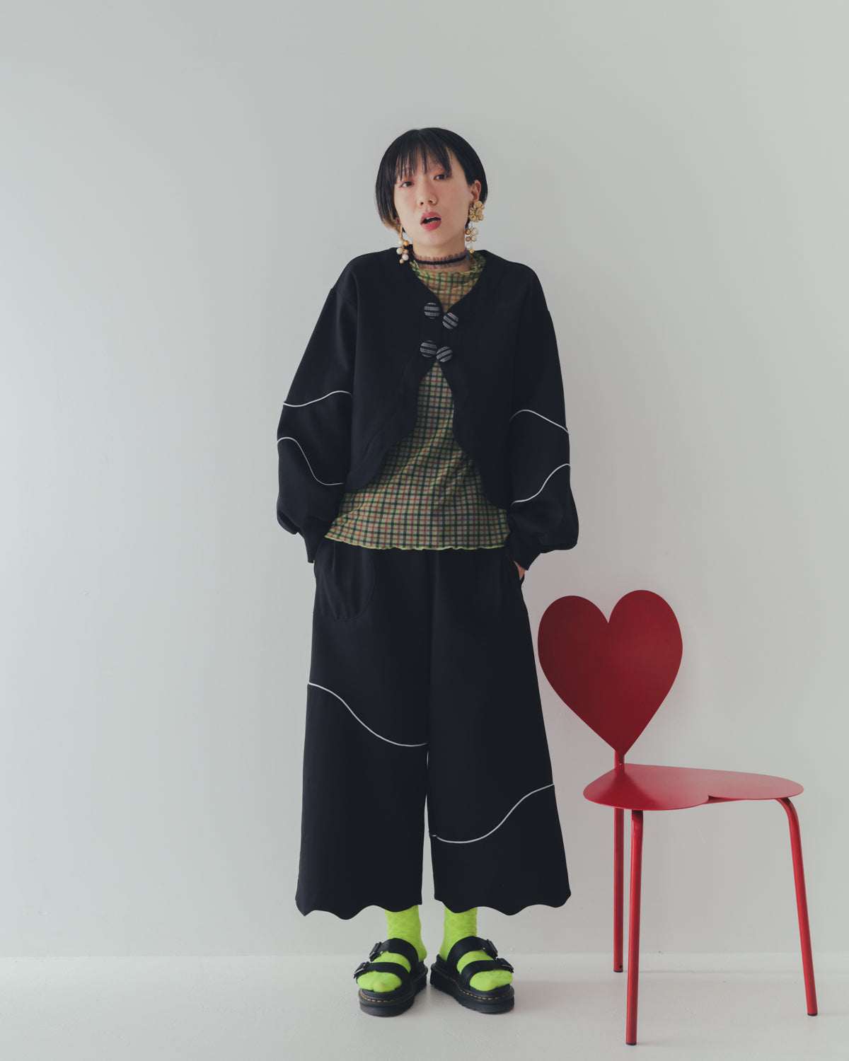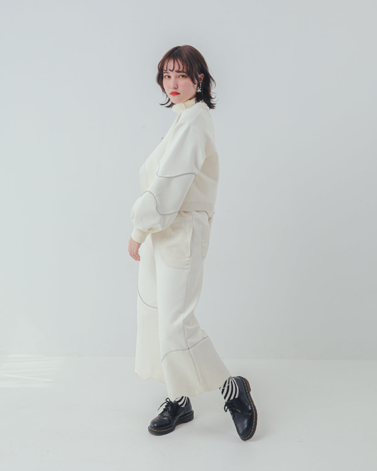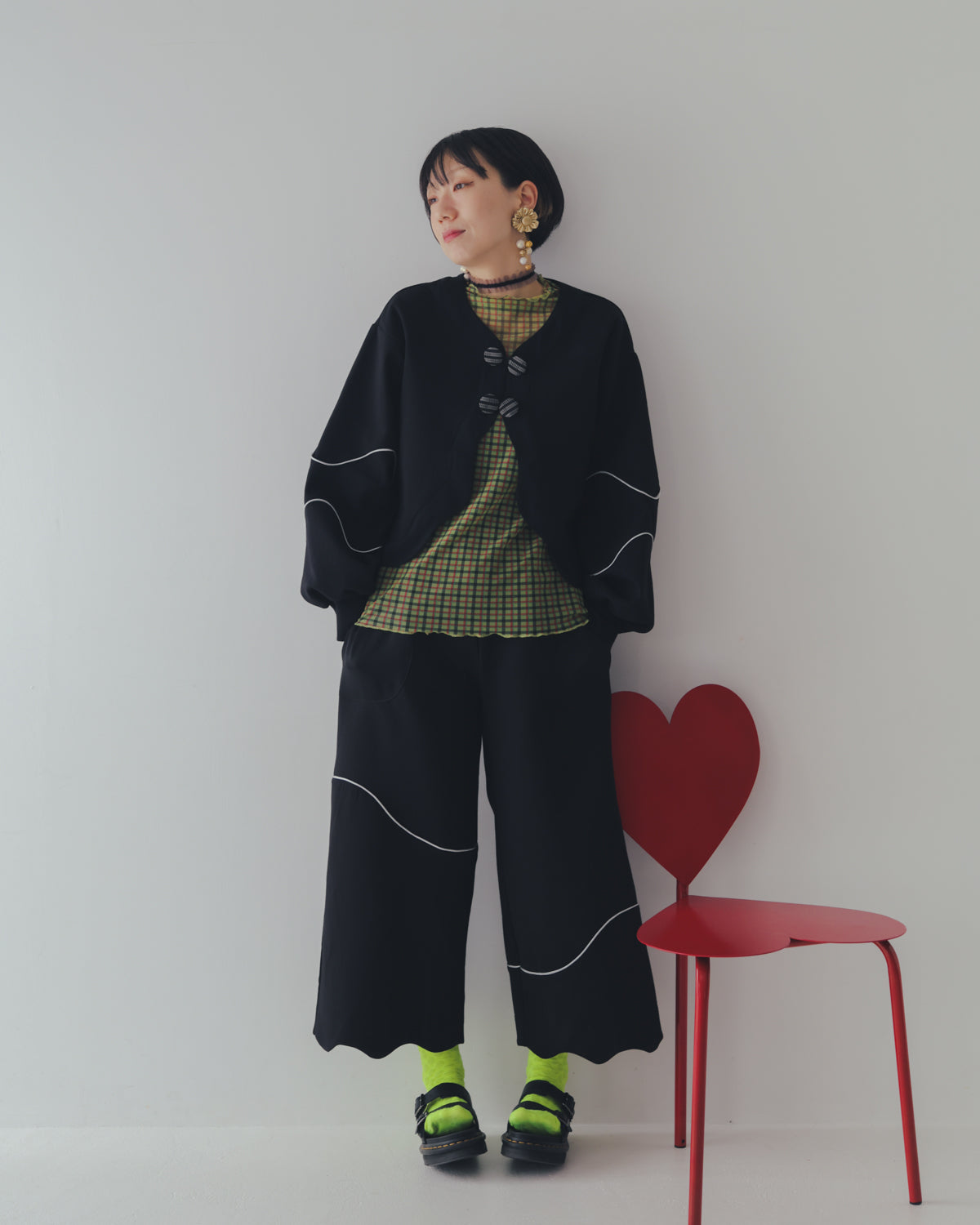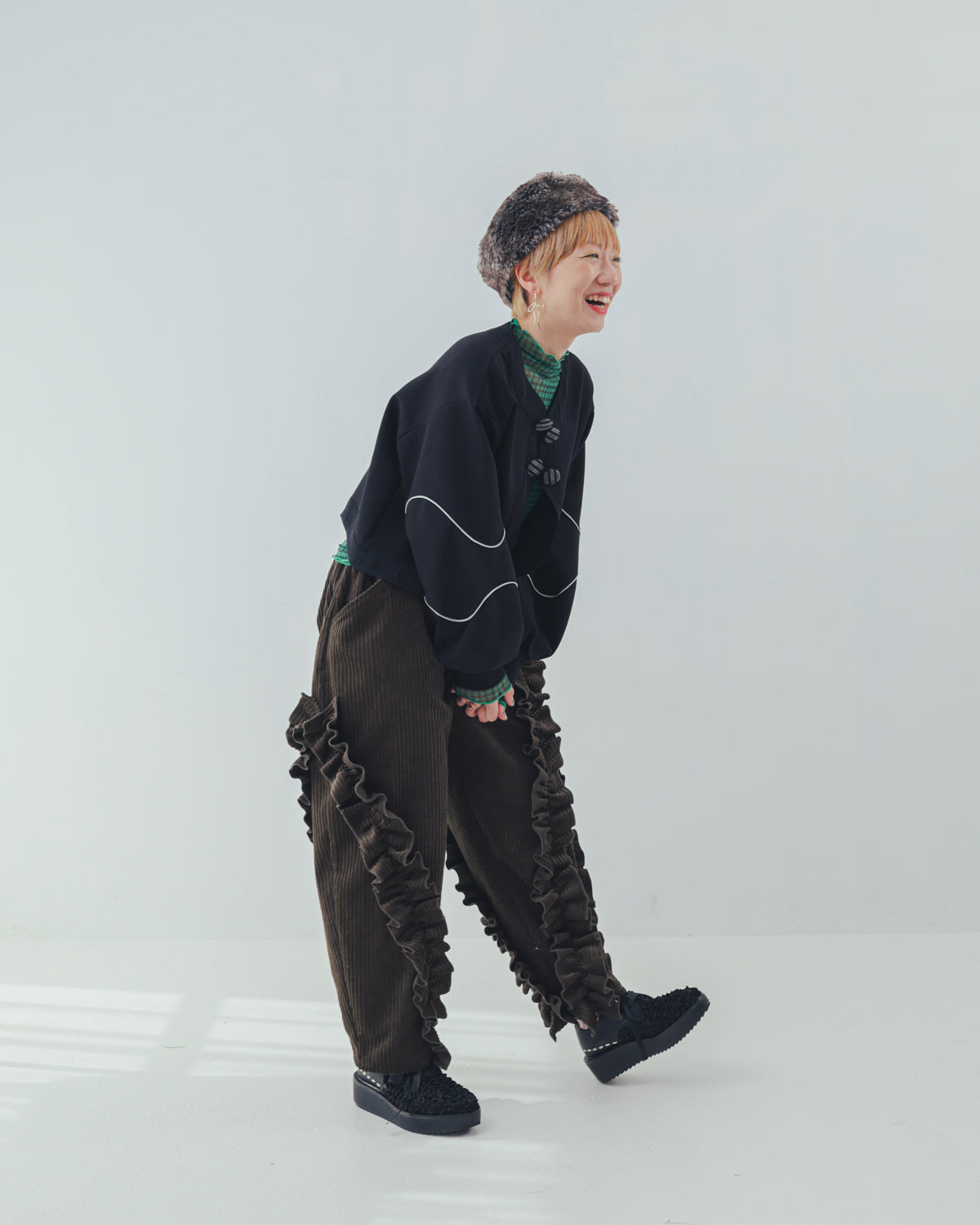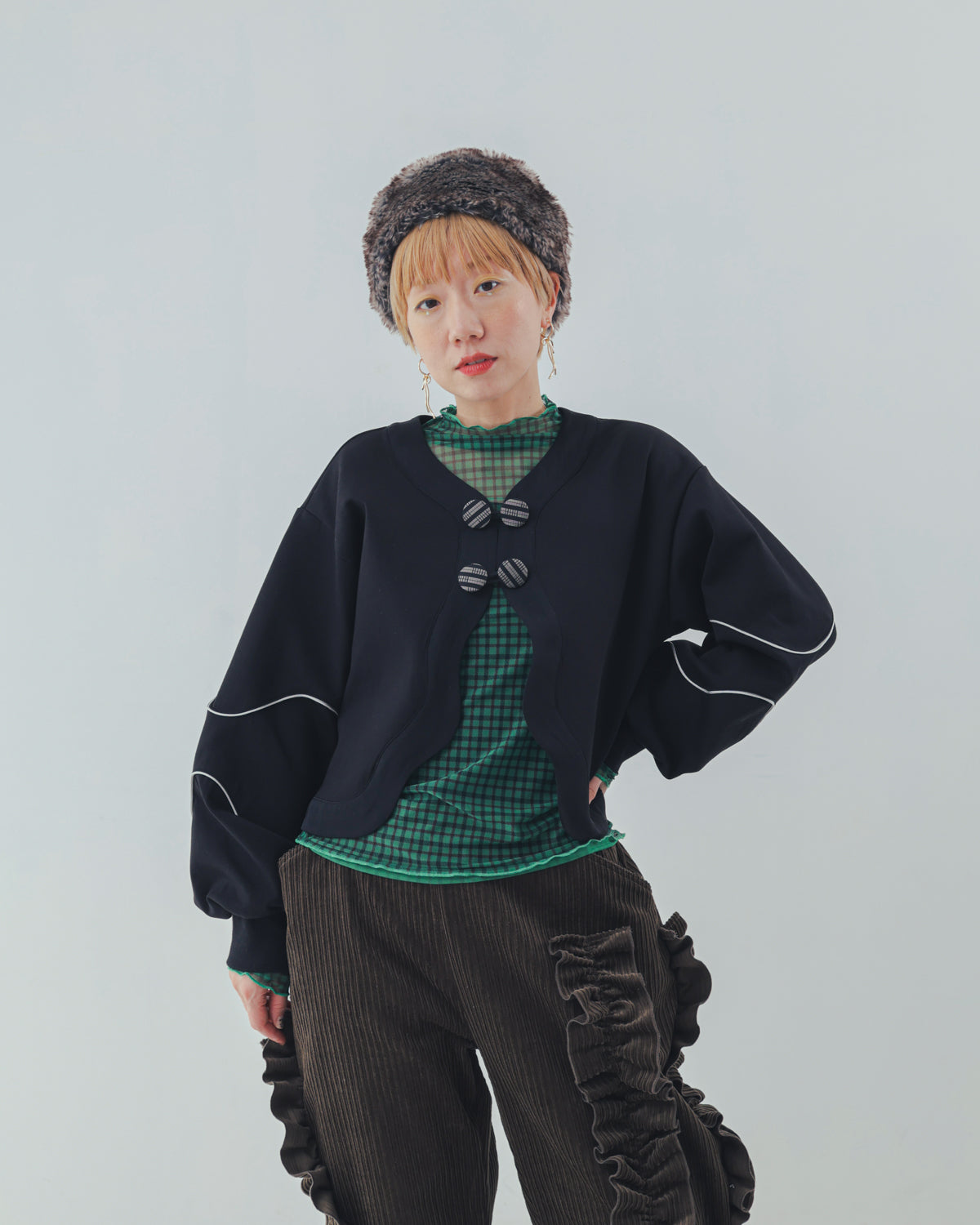前身頃や裾、袖のパイピングなど、全体的に波打つようなデザインを施したボレロは、軽くシワになりにくいボンディング生地を使用。 少し肌寒い秋口にはカットソーの上に重ねて、本格的な冬の季節にはレイヤードアイテムのひとつとして合わせるなど、活躍する機会が多いのも嬉しいポイントです。 くるみボタンで上品な印象をプラスしました。