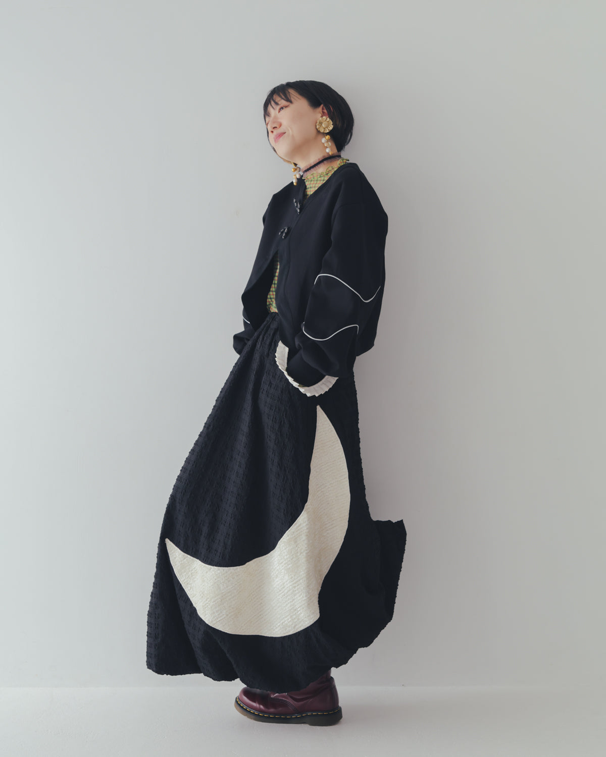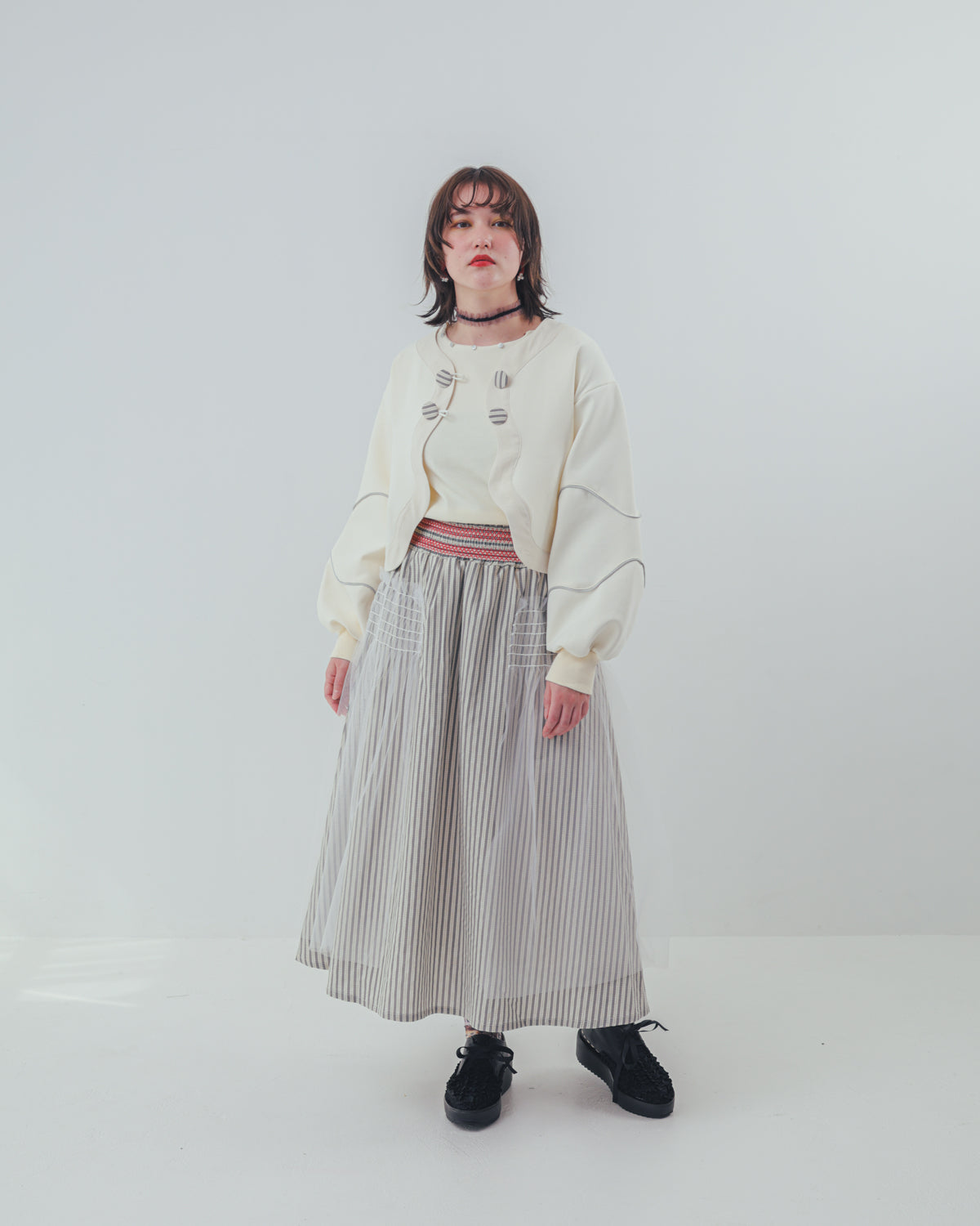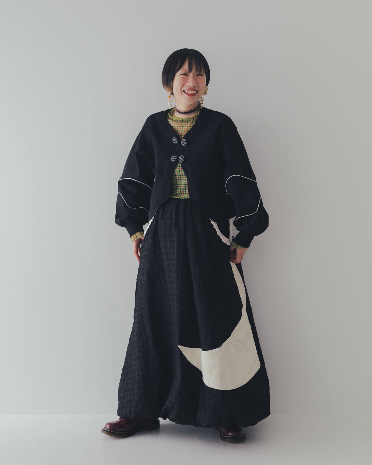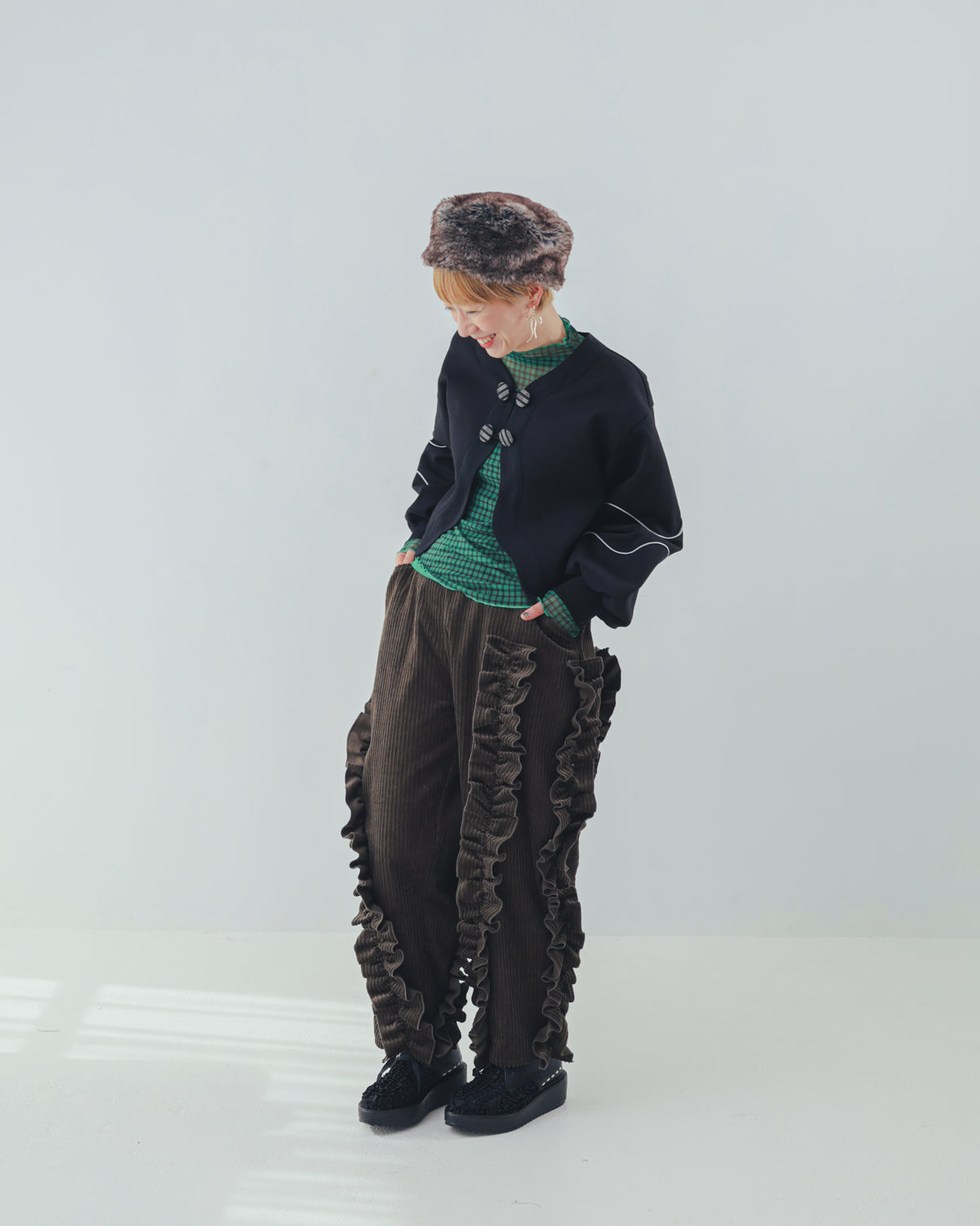 前身頃や裾、袖のパイピングなど、全体的に波打つようなデザインを施したボレロは、軽くシワになりにくいボンディング生地を使用。 少し肌寒い秋口にはカットソーの上に重ねて、本格的な冬の季節にはレイヤードアイテムのひとつとして合わせるなど、活躍する機会が多いのも嬉しいポイントです。 くるみボタンで上品な印象をプラスしました。