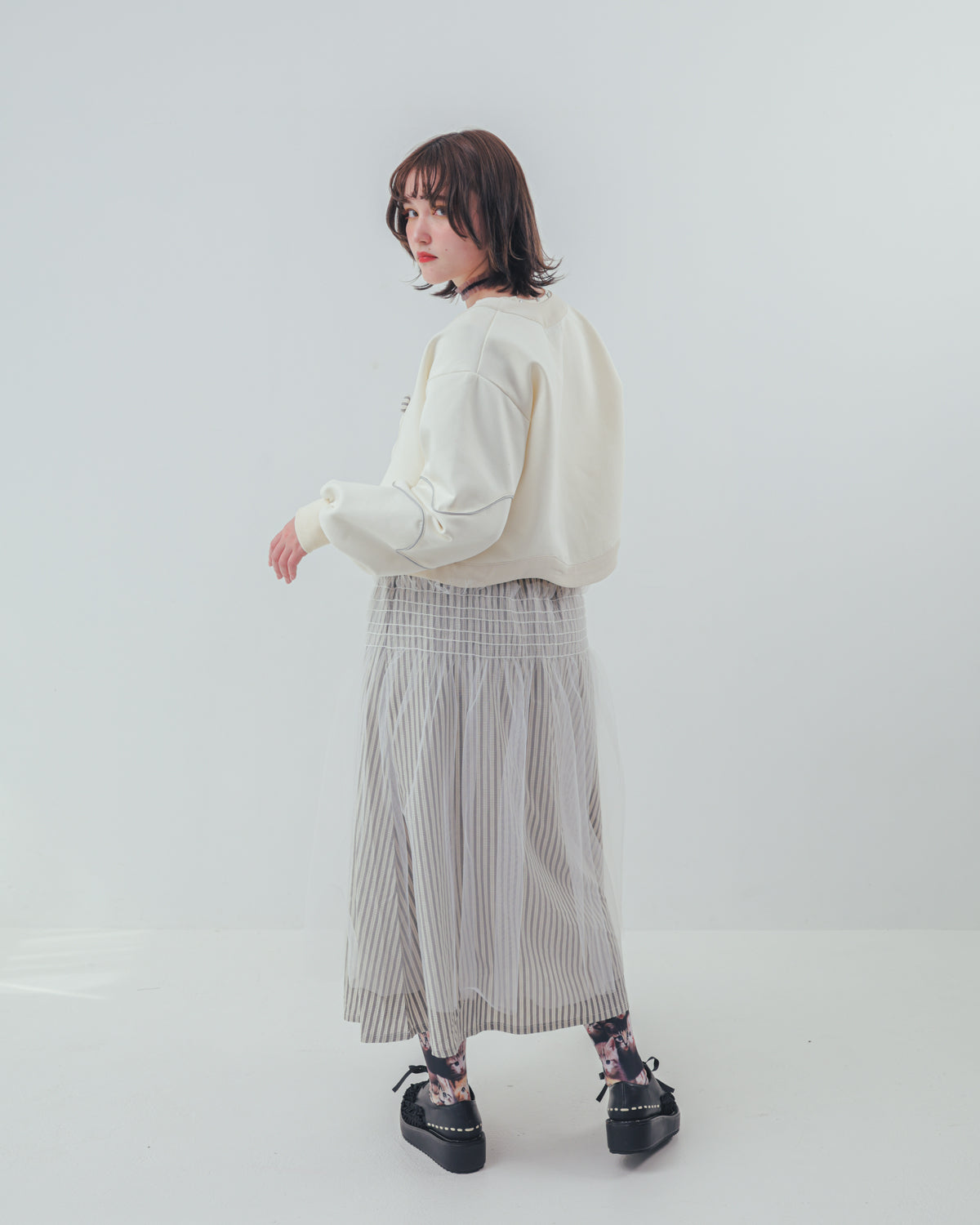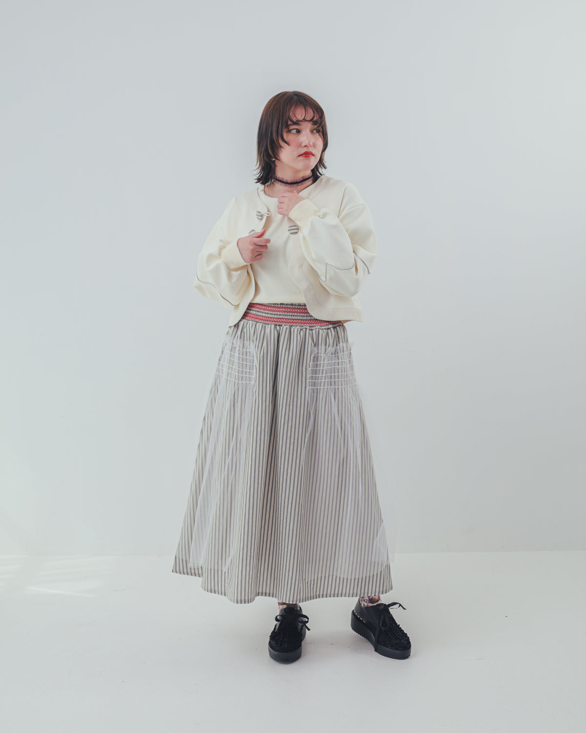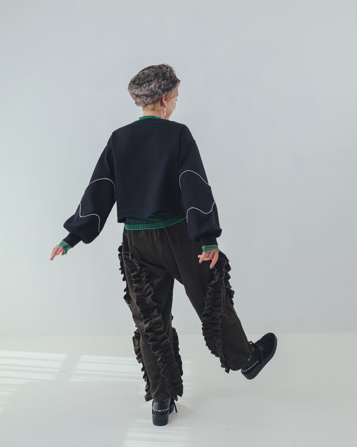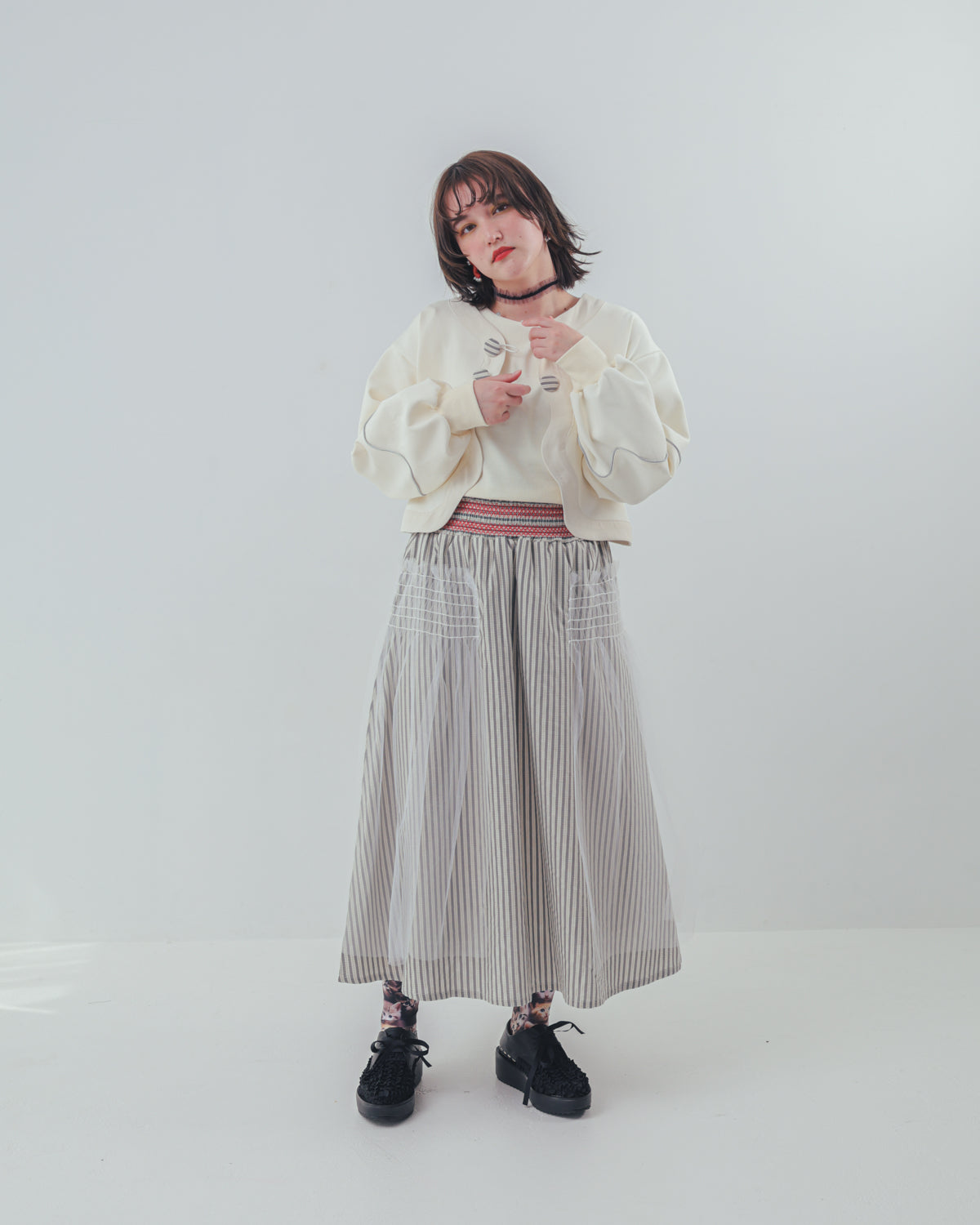 前身頃や裾、袖のパイピングなど、全体的に波打つようなデザインを施したボレロは、軽くシワになりにくいボンディング生地を使用。 少し肌寒い秋口にはカットソーの上に重ねて、本格的な冬の季節にはレイヤードアイテムのひとつとして合わせるなど、活躍する機会が多いのも嬉しいポイントです。 くるみボタンで上品な印象をプラスしました。