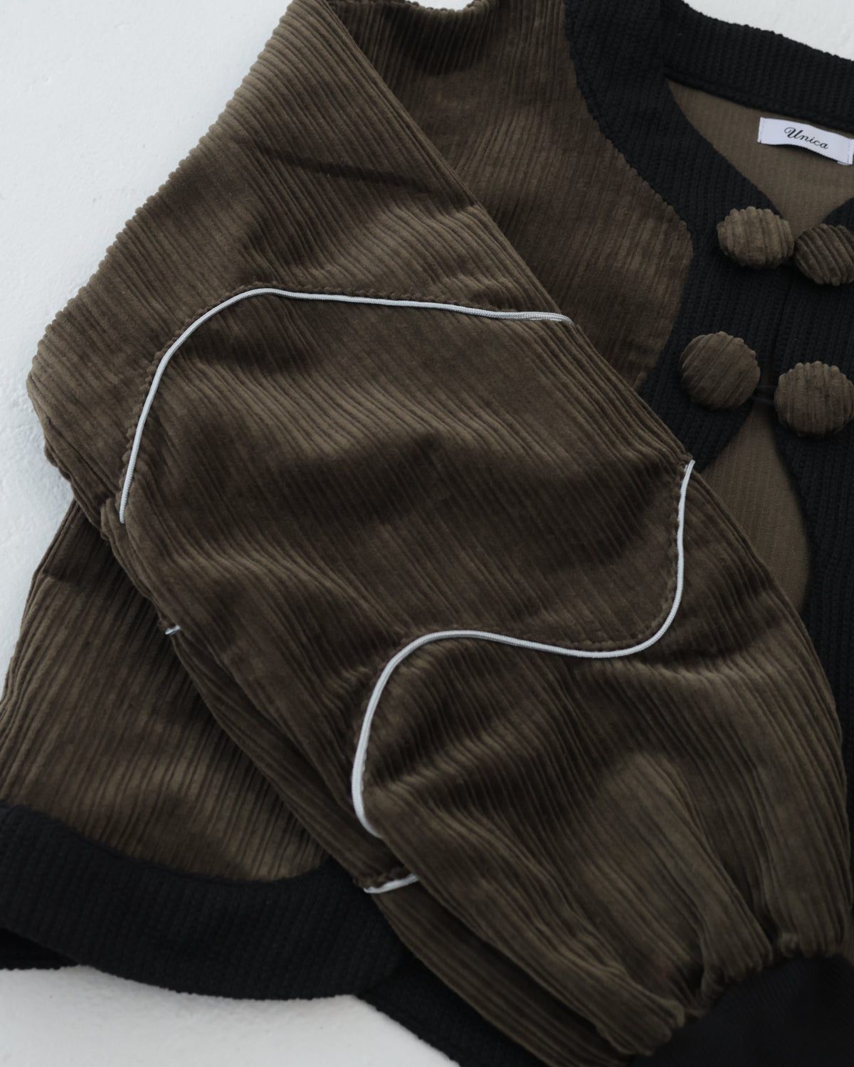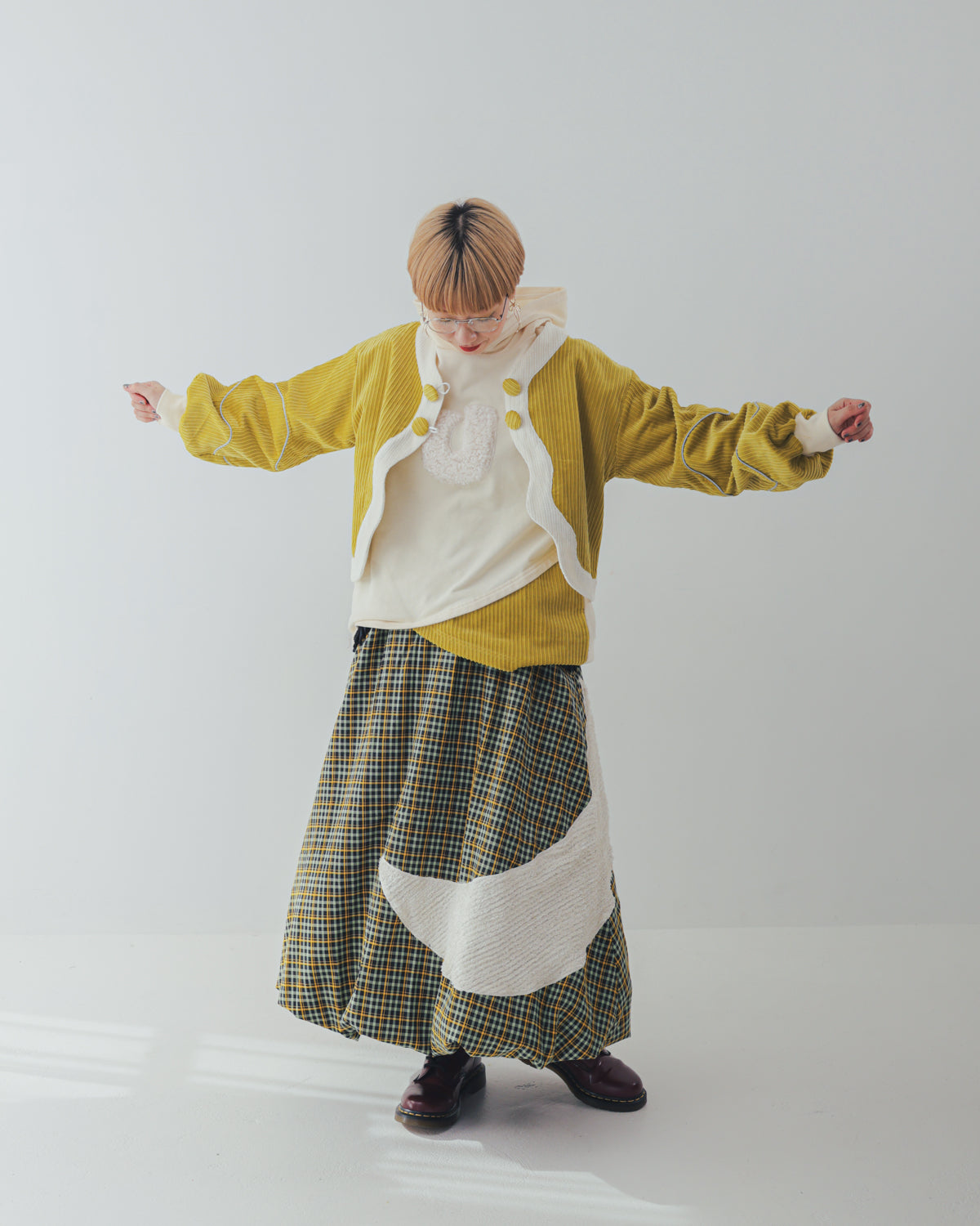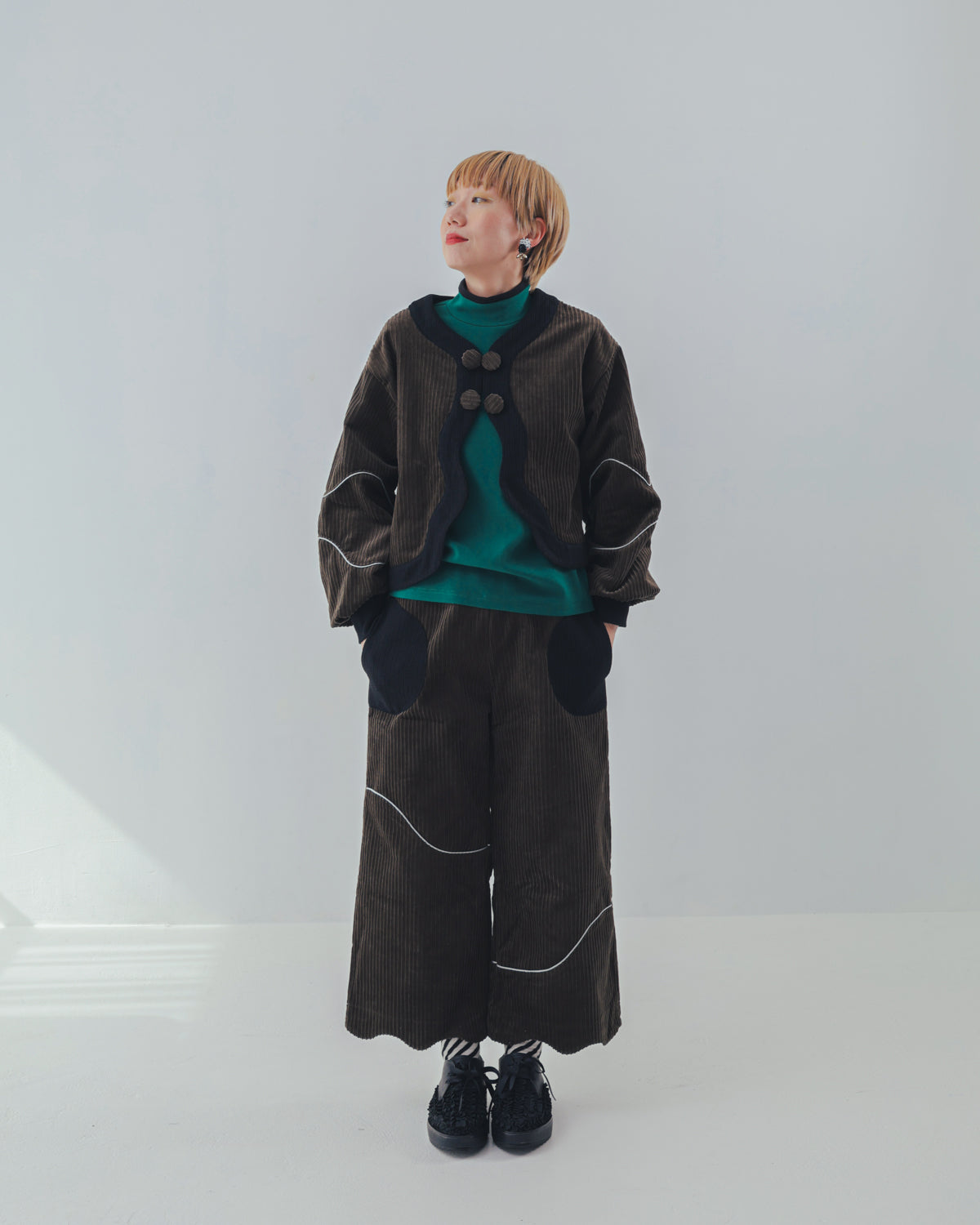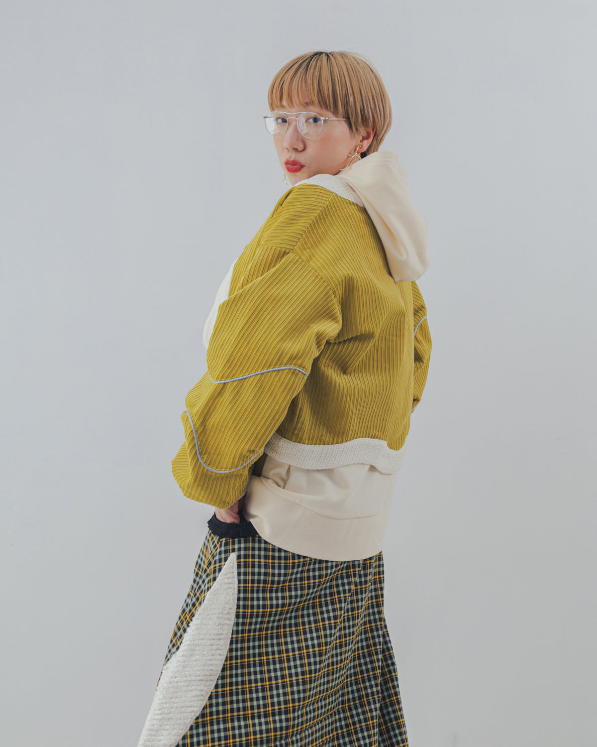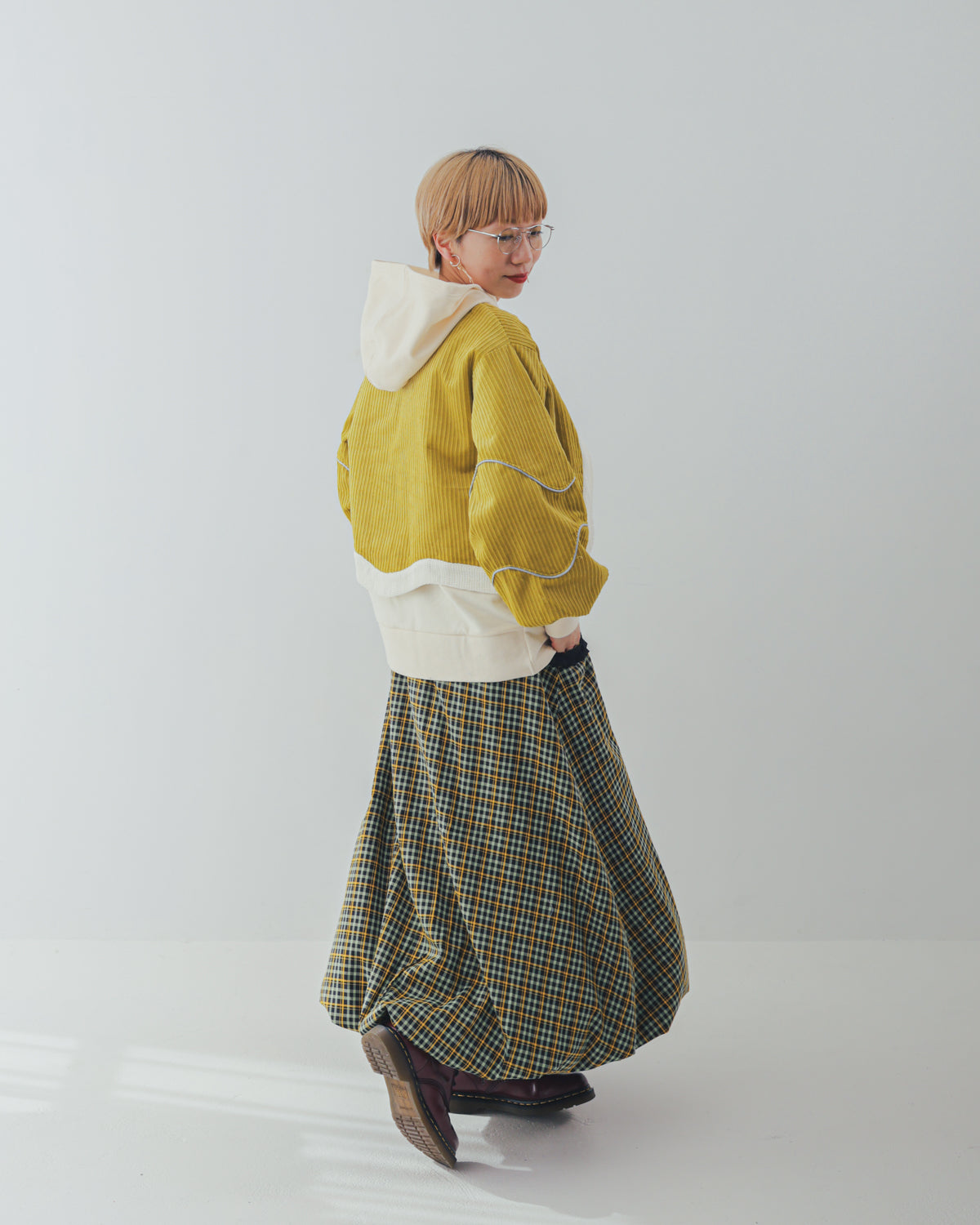 縦の畝が特徴的な秋冬ではお馴染みのコーデュロイ生地を使用したボレロは、差し色として使いやすいイエローとカーキの2色展開。ワンピースとの相性はもちろん、丈の短さを活かしたメリハリのあるコーディネイトが楽しめるのはボレロならでは。裾や袖のパイピングなどに波のようなデザインを施すことで、視覚的にも目を引くアイテムに仕上げました。