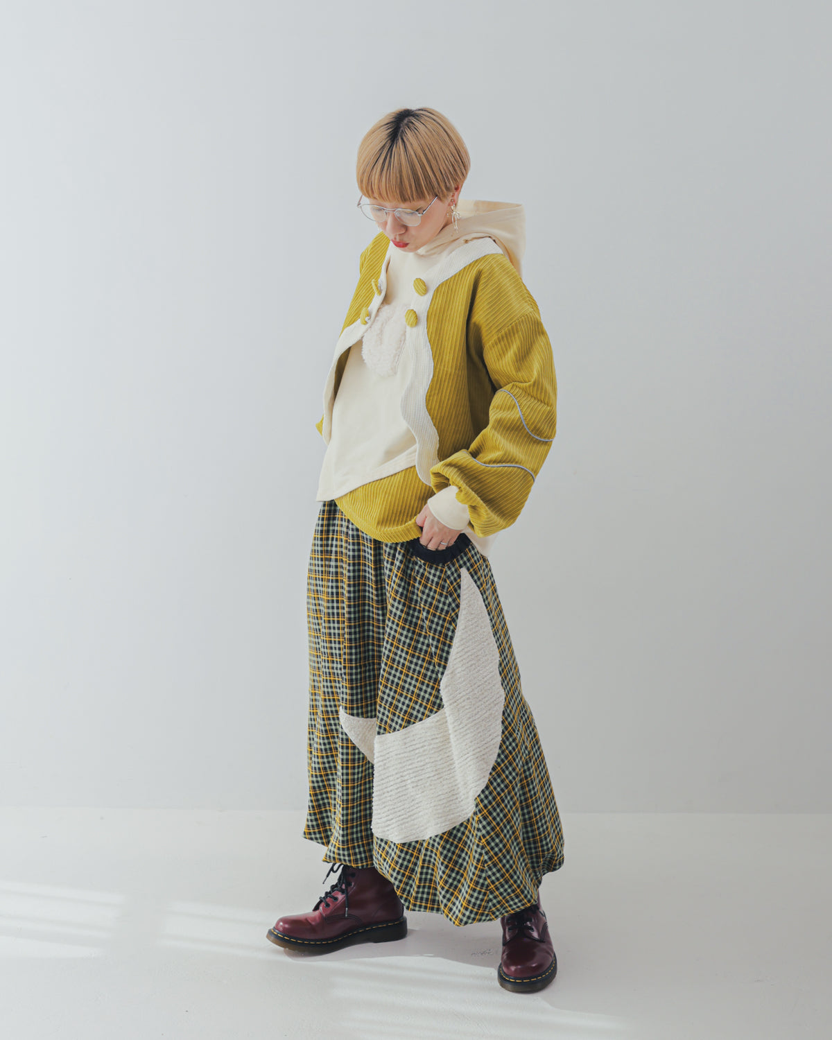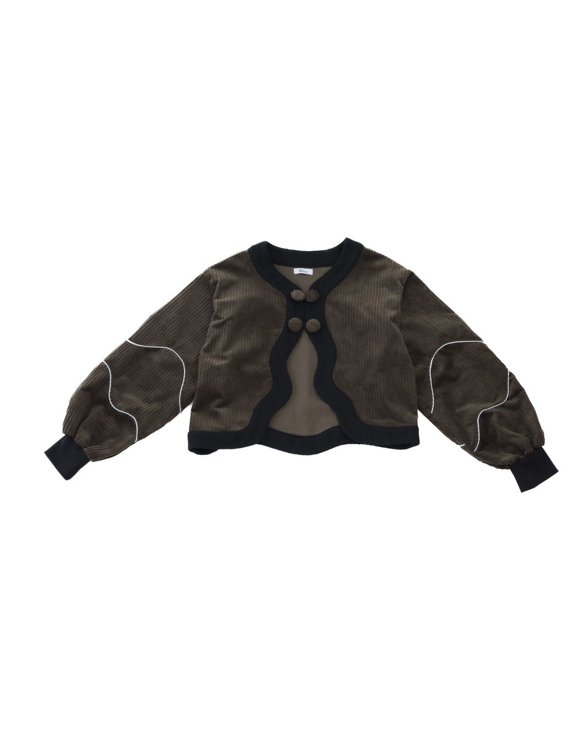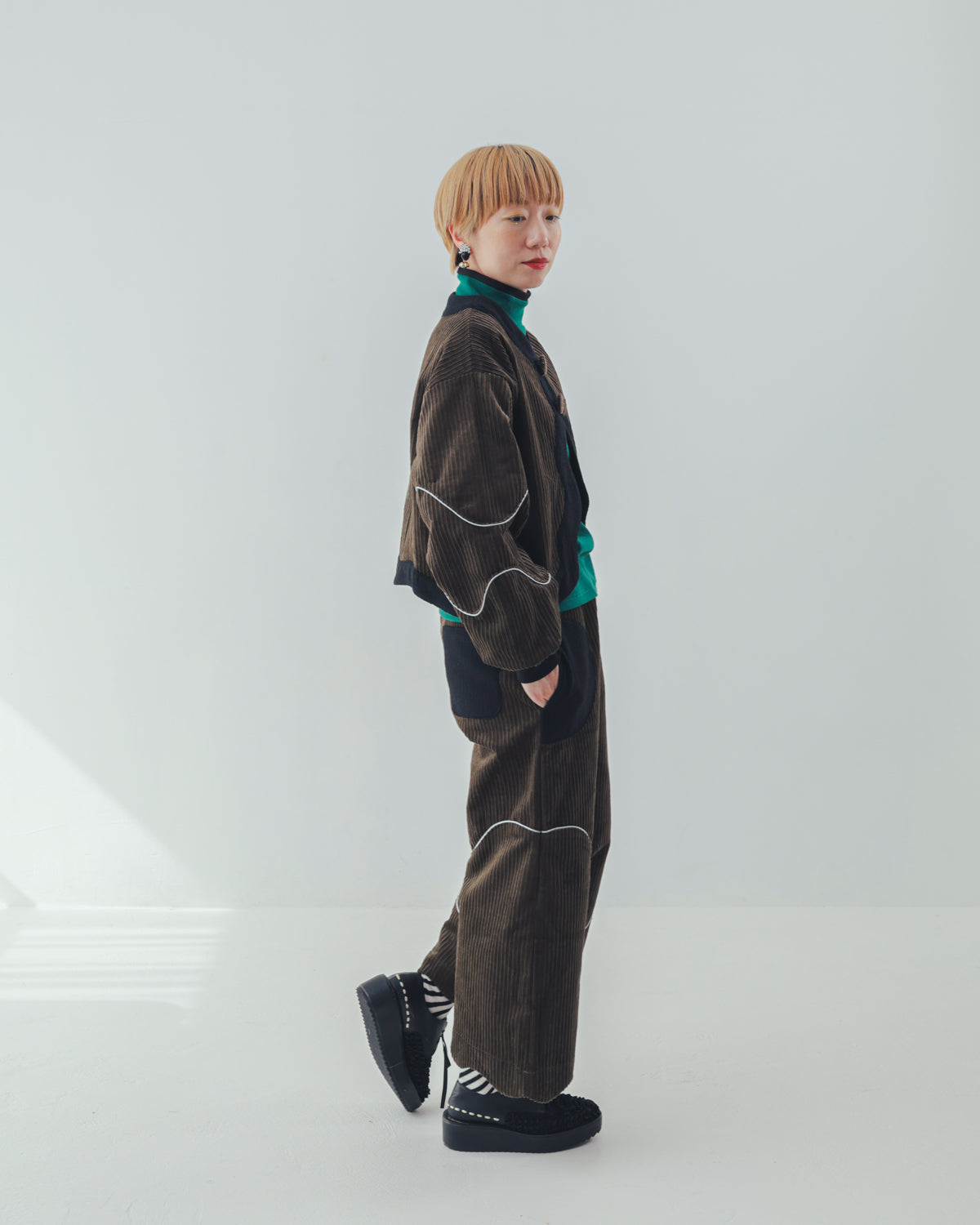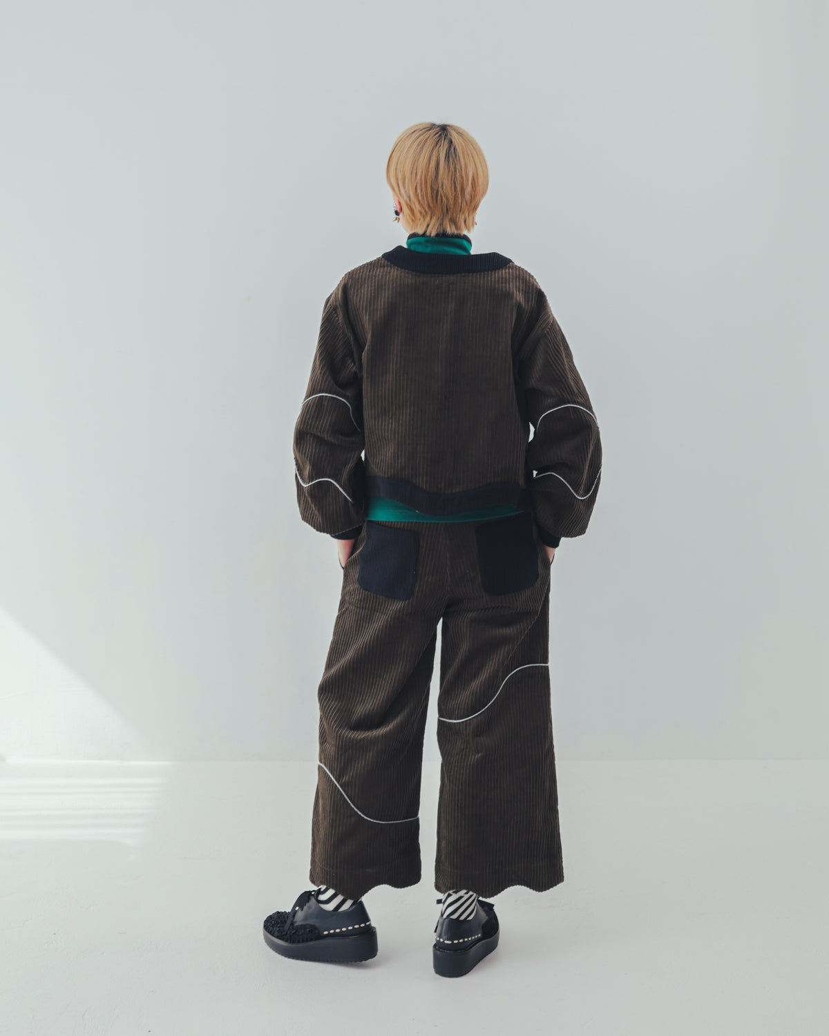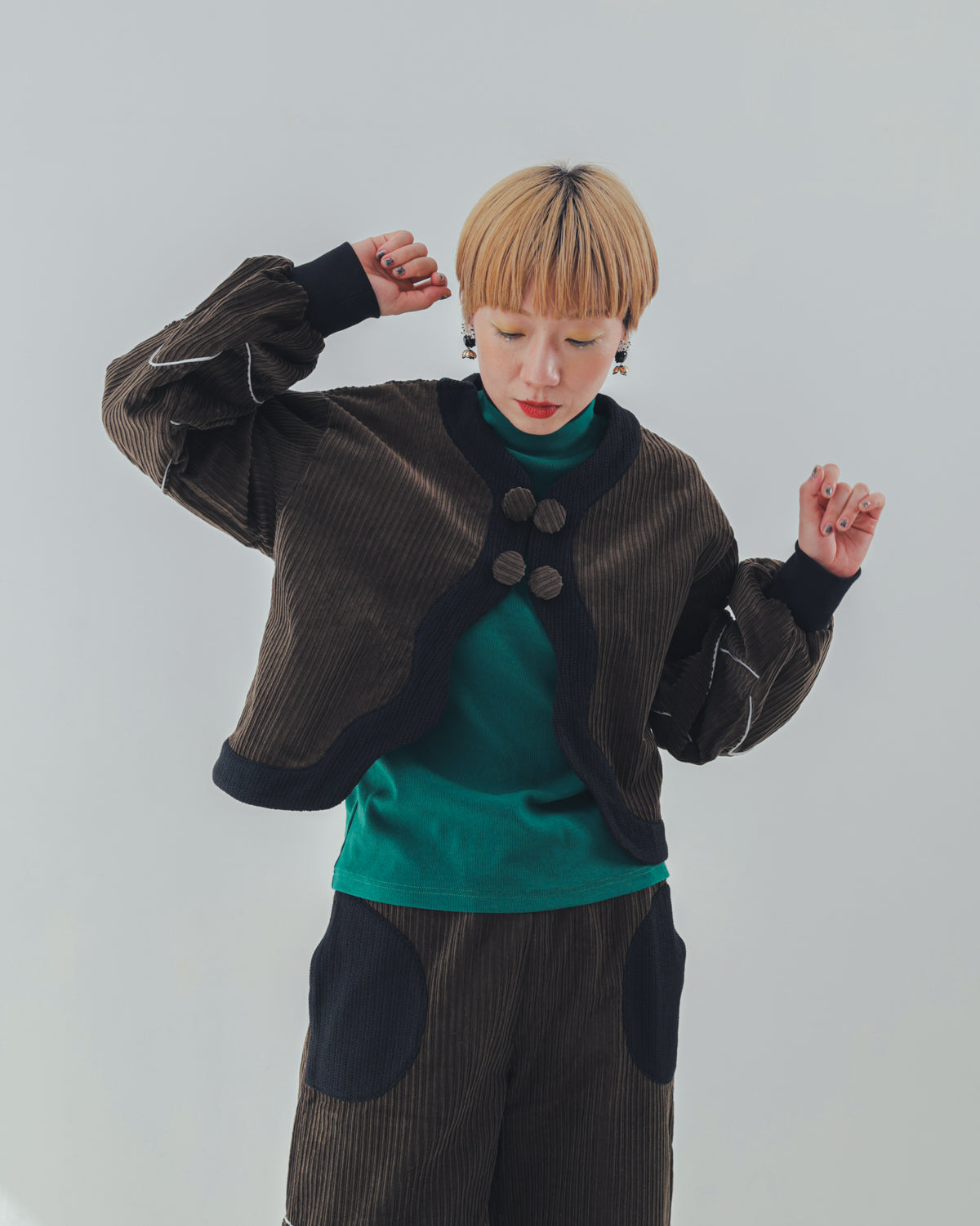 縦の畝が特徴的な秋冬ではお馴染みのコーデュロイ生地を使用したボレロは、差し色として使いやすいイエローとカーキの2色展開。ワンピースとの相性はもちろん、丈の短さを活かしたメリハリのあるコーディネイトが楽しめるのはボレロならでは。裾や袖のパイピングなどに波のようなデザインを施すことで、視覚的にも目を引くアイテムに仕上げました。