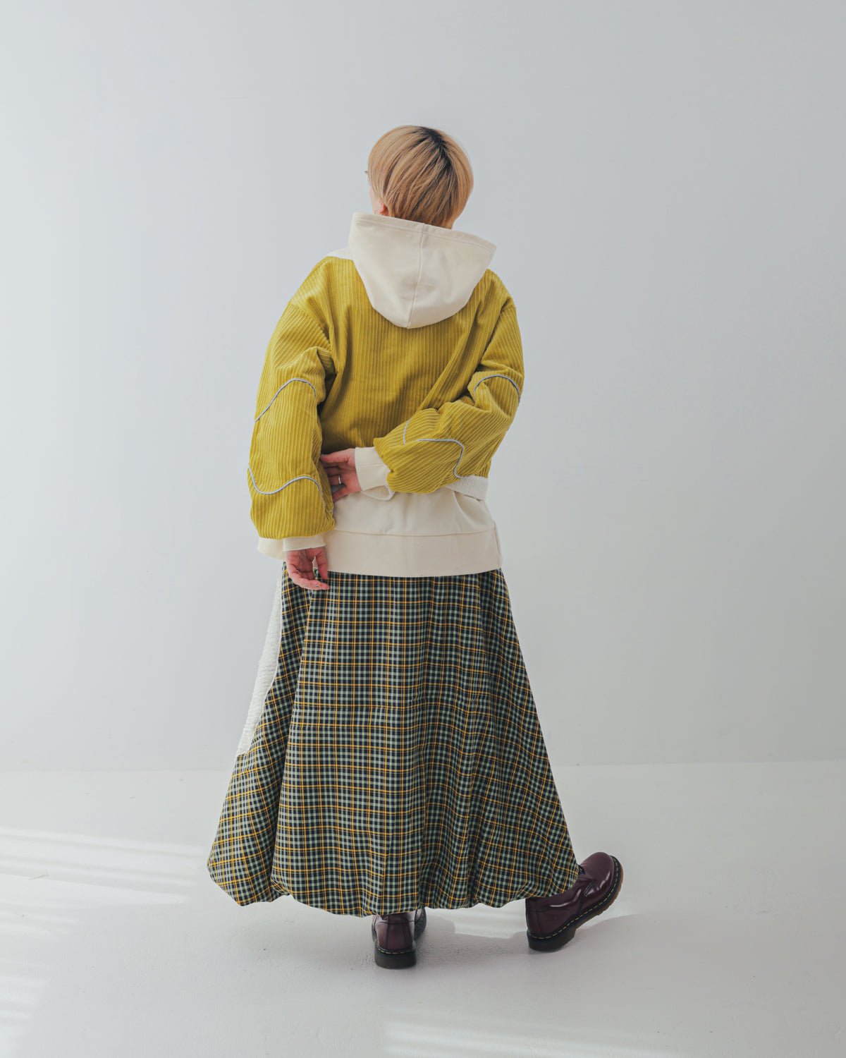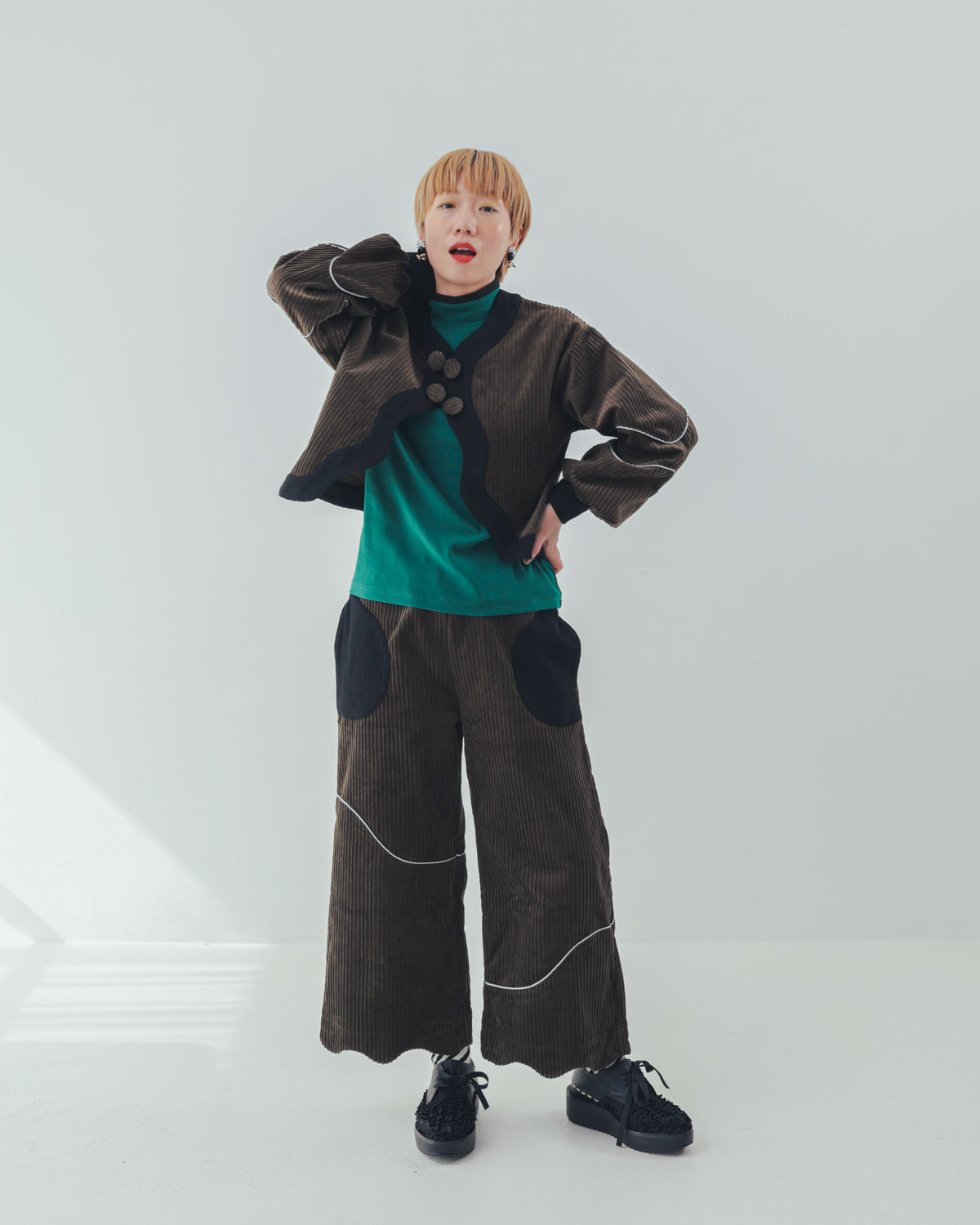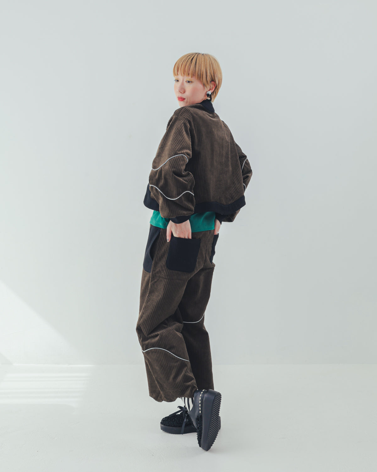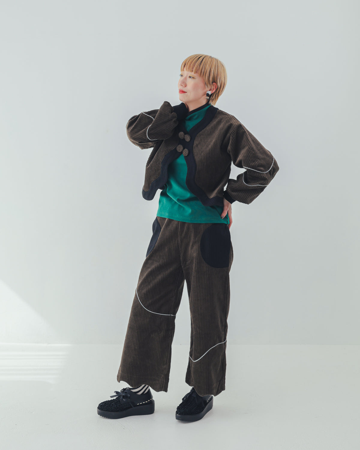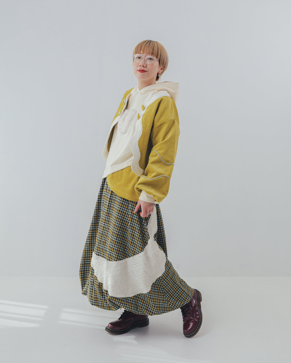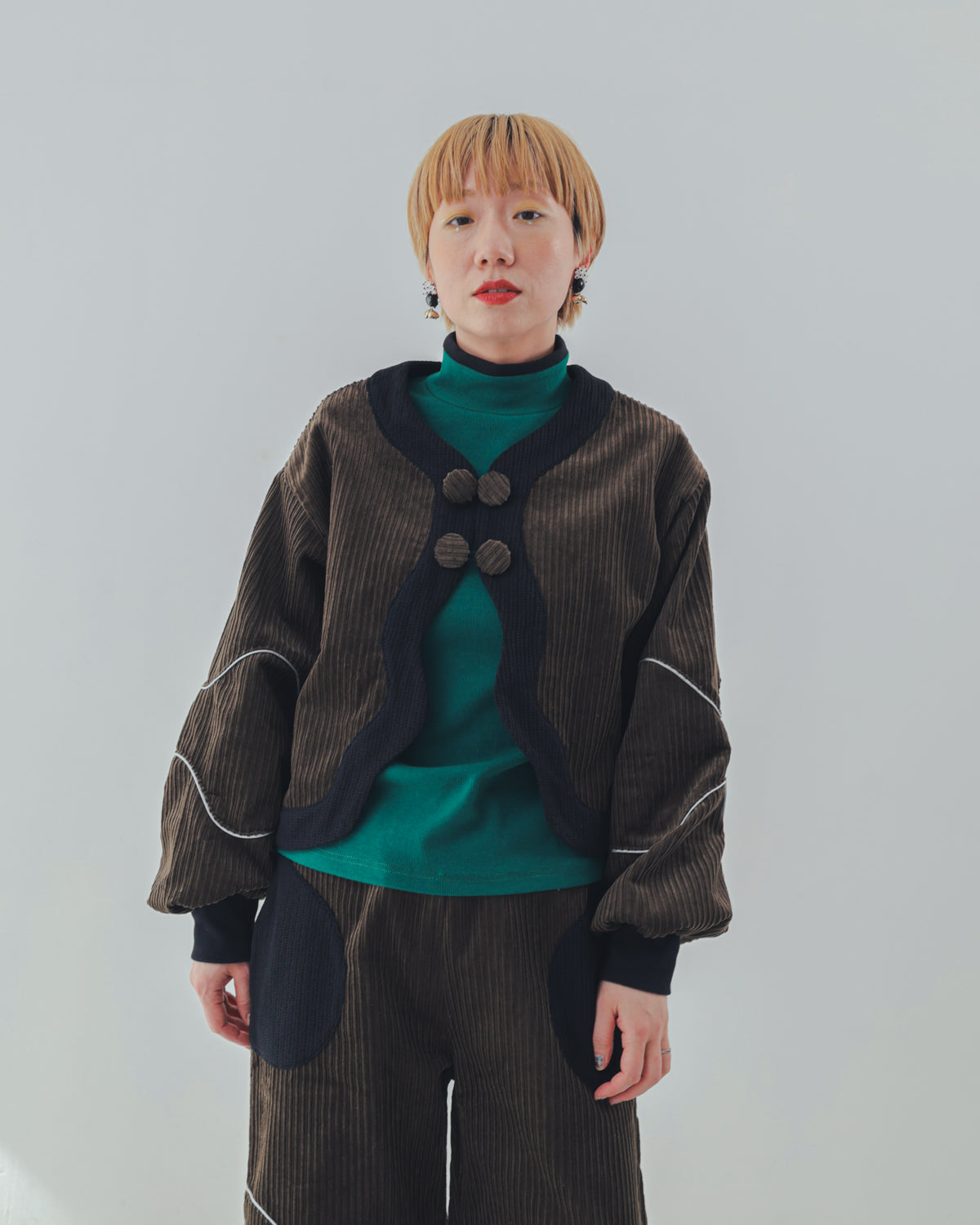 縦の畝が特徴的な秋冬ではお馴染みのコーデュロイ生地を使用したボレロは、差し色として使いやすいイエローとカーキの2色展開。ワンピースとの相性はもちろん、丈の短さを活かしたメリハリのあるコーディネイトが楽しめるのはボレロならでは。裾や袖のパイピングなどに波のようなデザインを施すことで、視覚的にも目を引くアイテムに仕上げました。