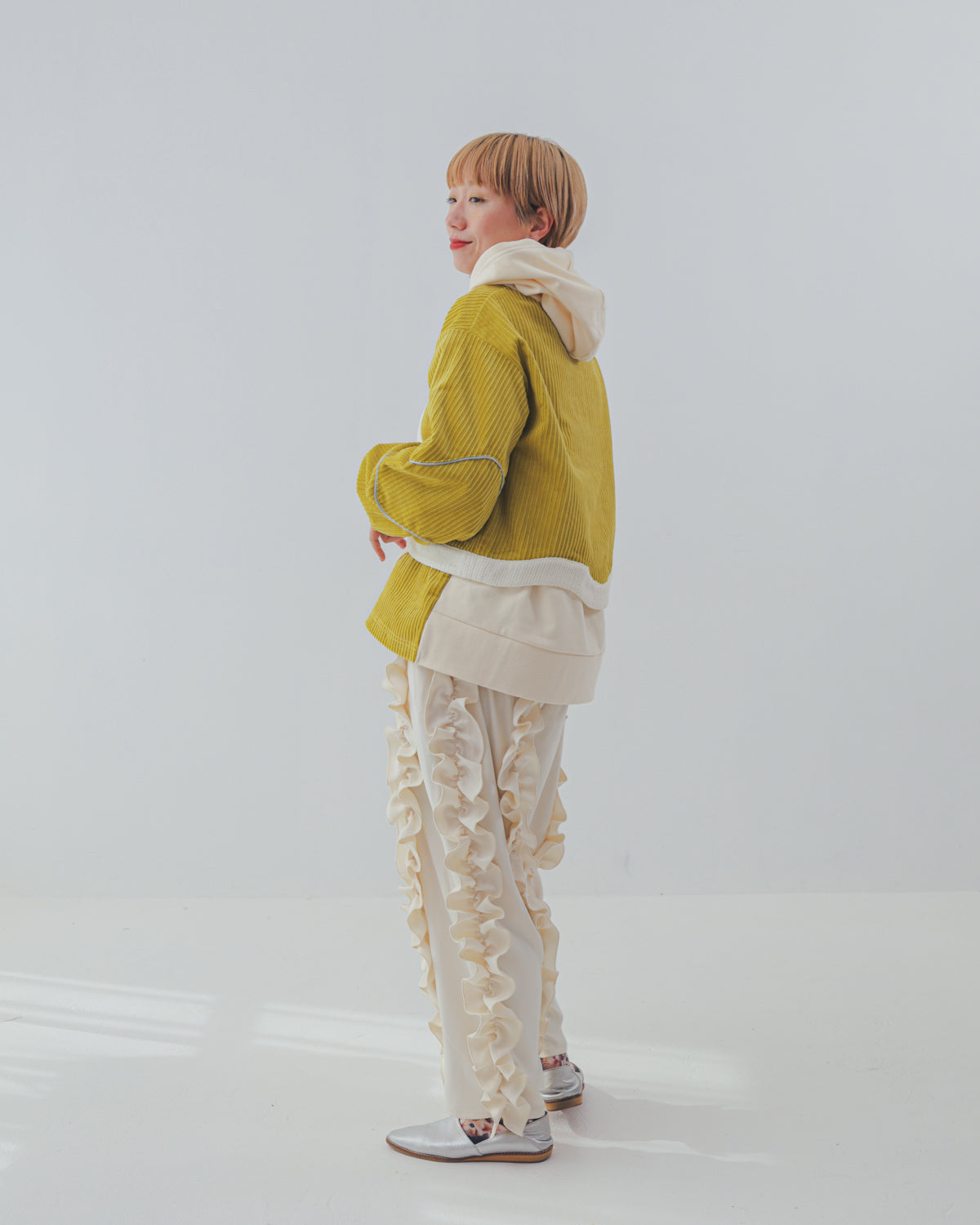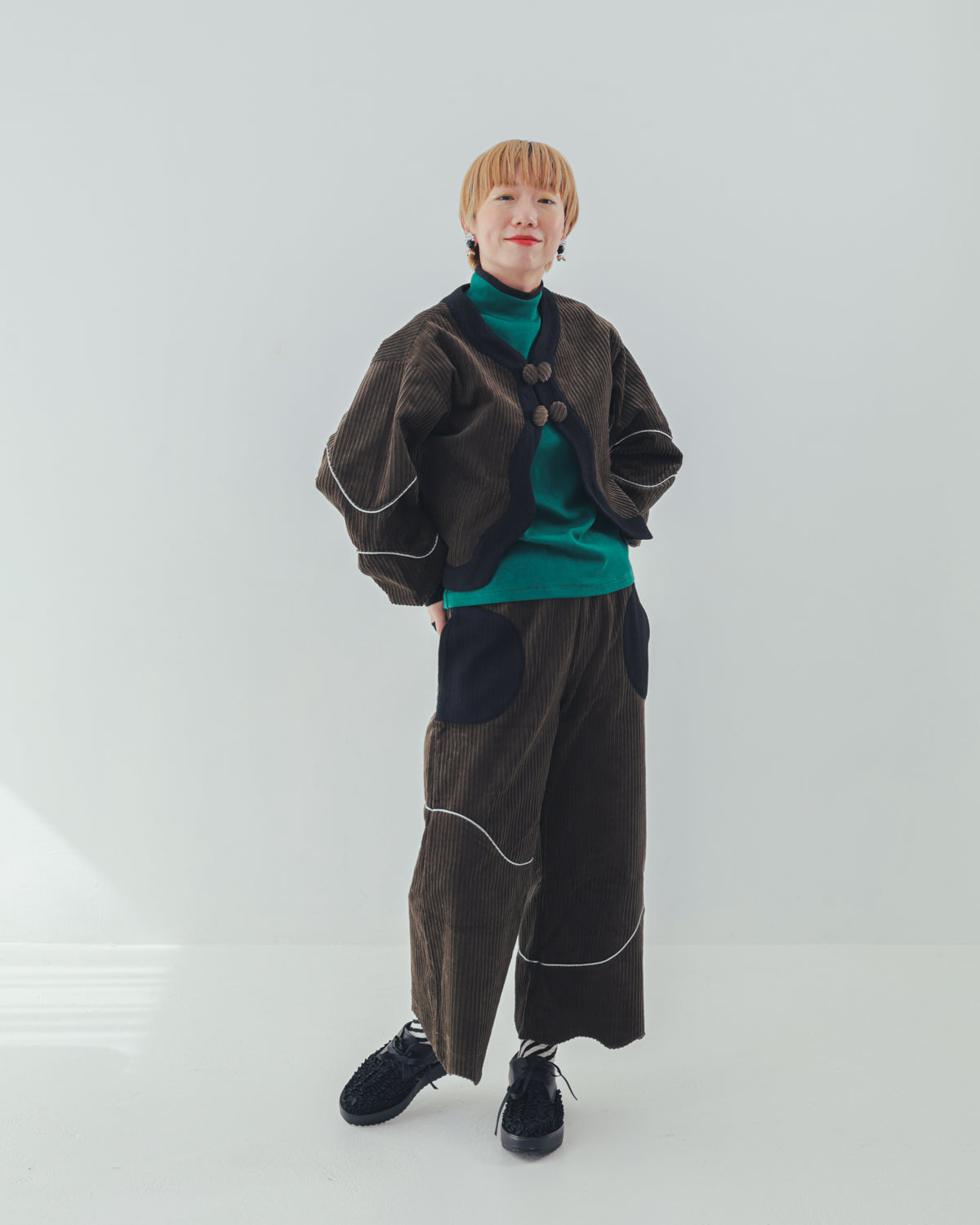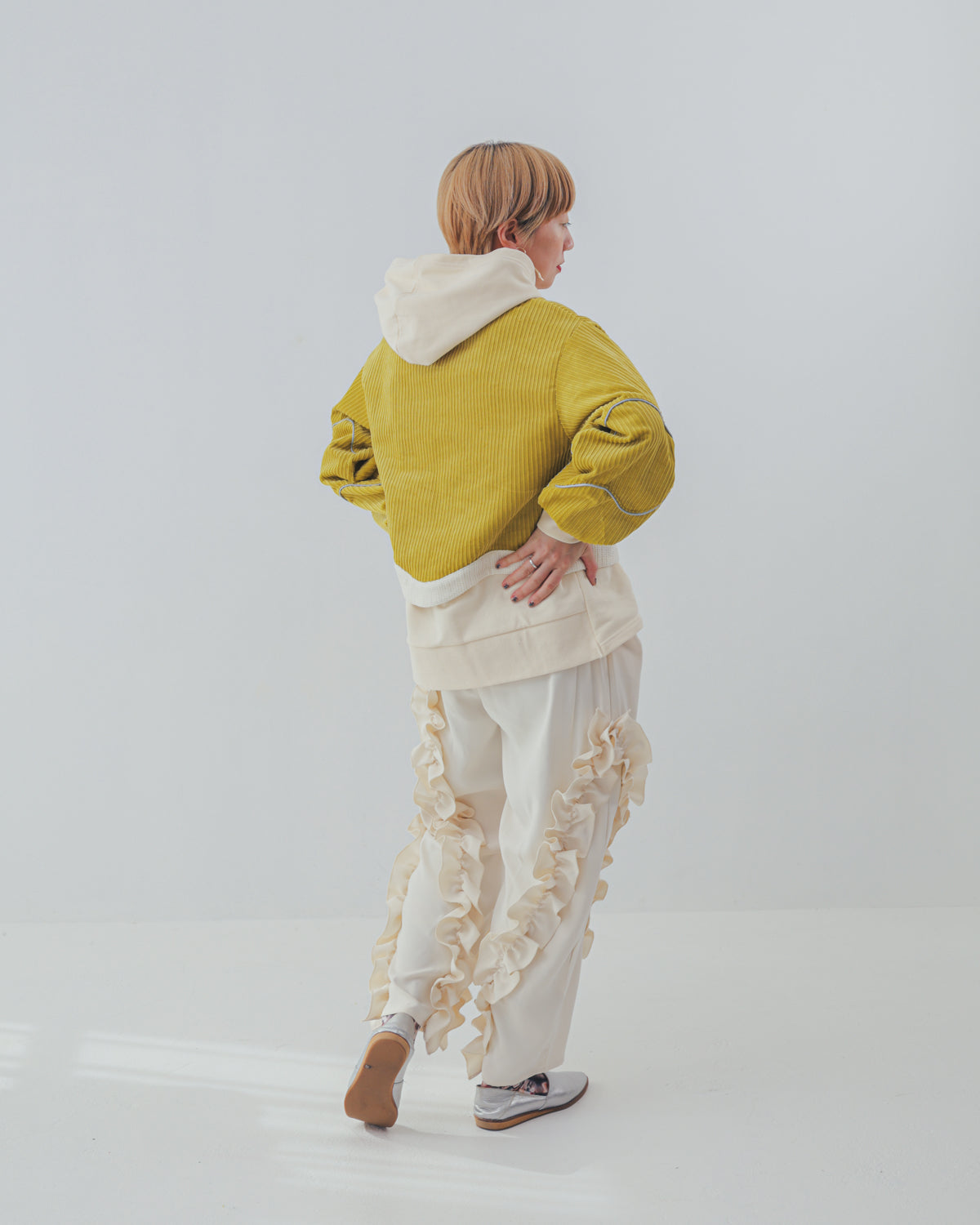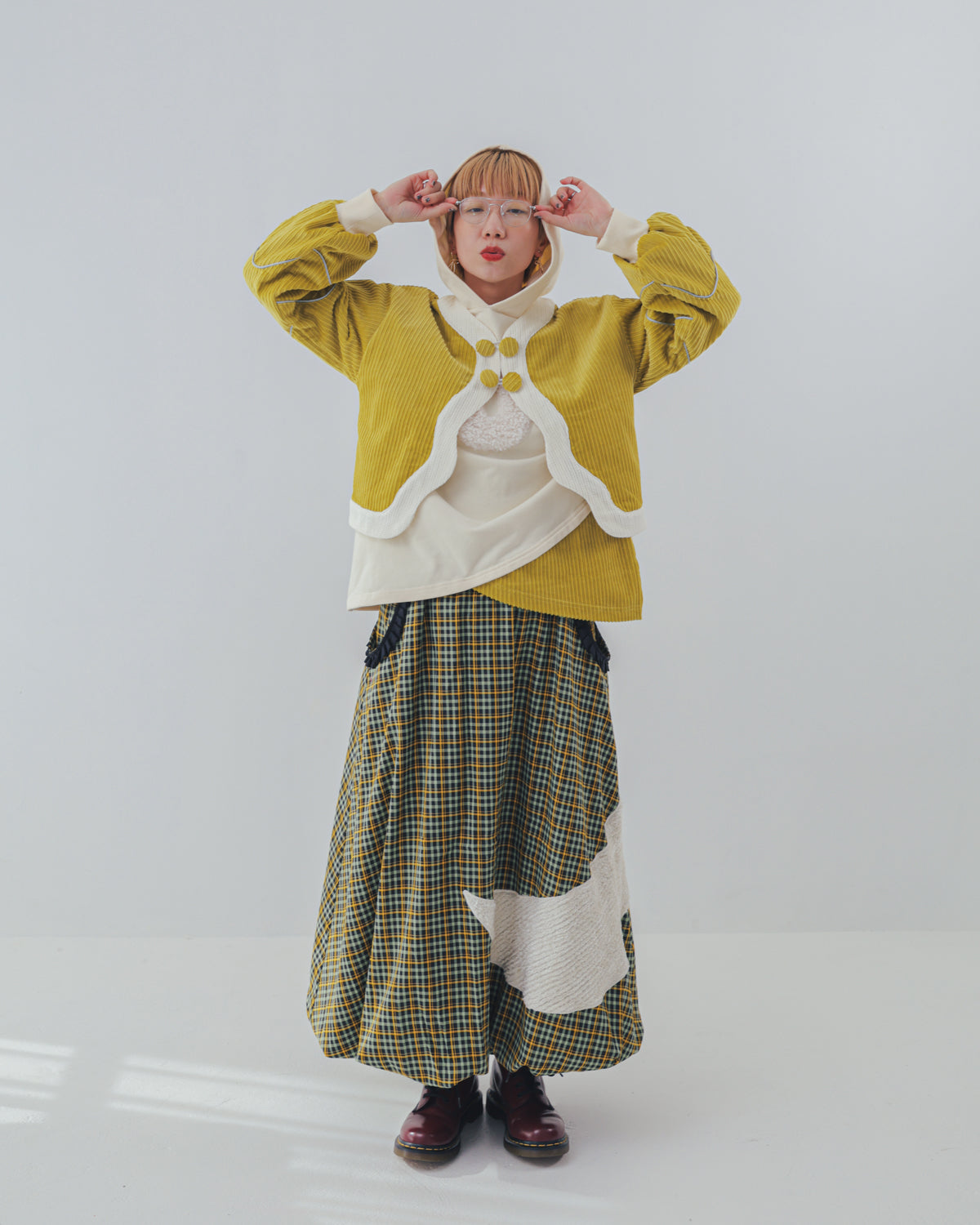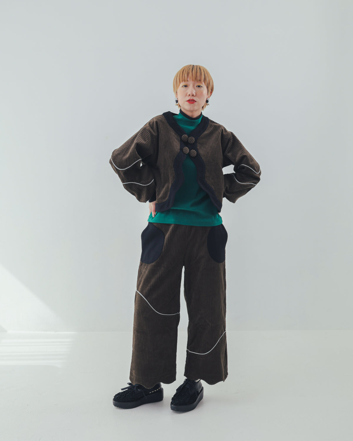 縦の畝が特徴的な秋冬ではお馴染みのコーデュロイ生地を使用したボレロは、差し色として使いやすいイエローとカーキの2色展開。ワンピースとの相性はもちろん、丈の短さを活かしたメリハリのあるコーディネイトが楽しめるのはボレロならでは。裾や袖のパイピングなどに波のようなデザインを施すことで、視覚的にも目を引くアイテムに仕上げました。