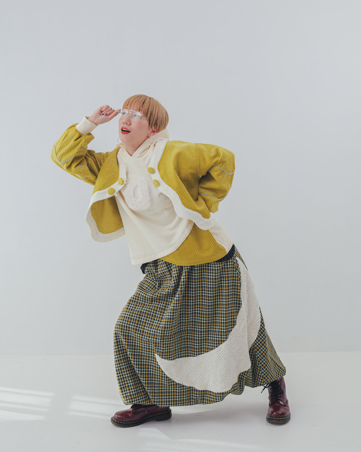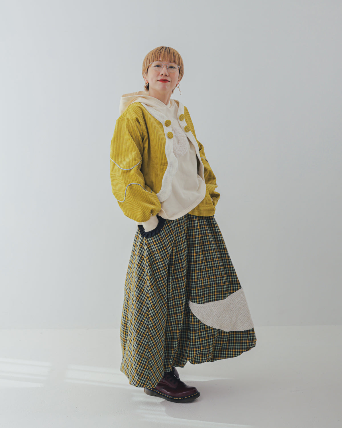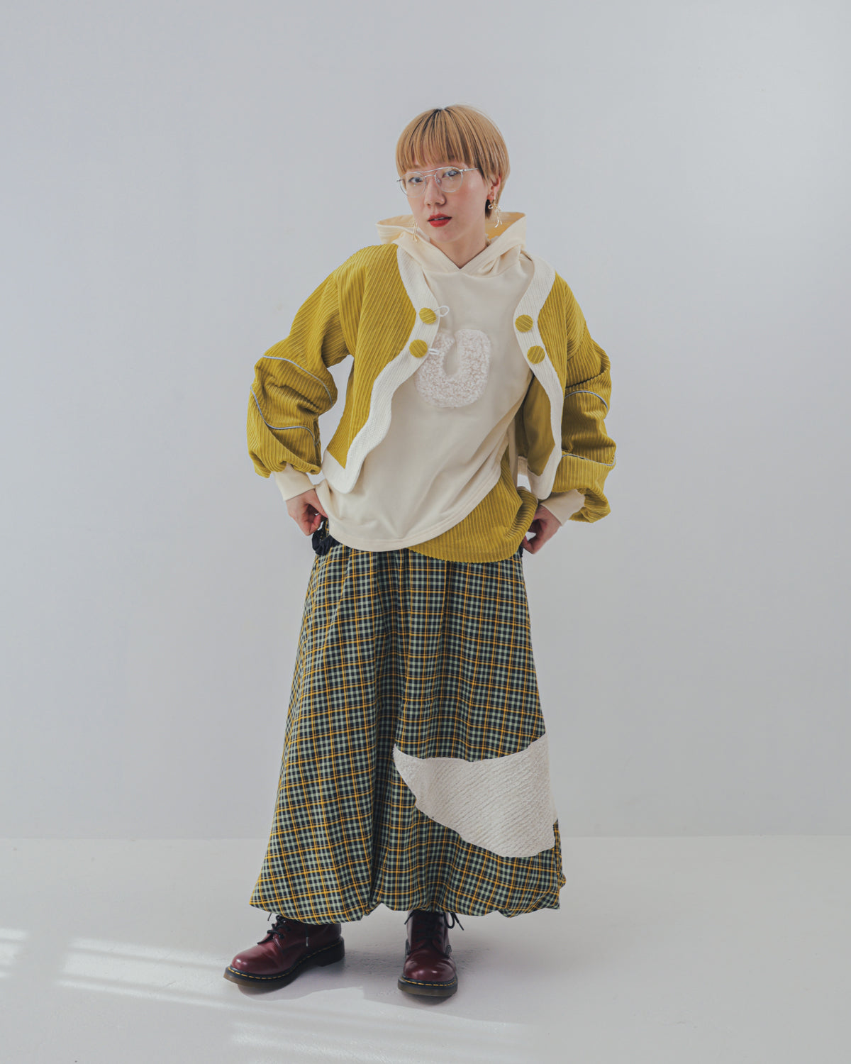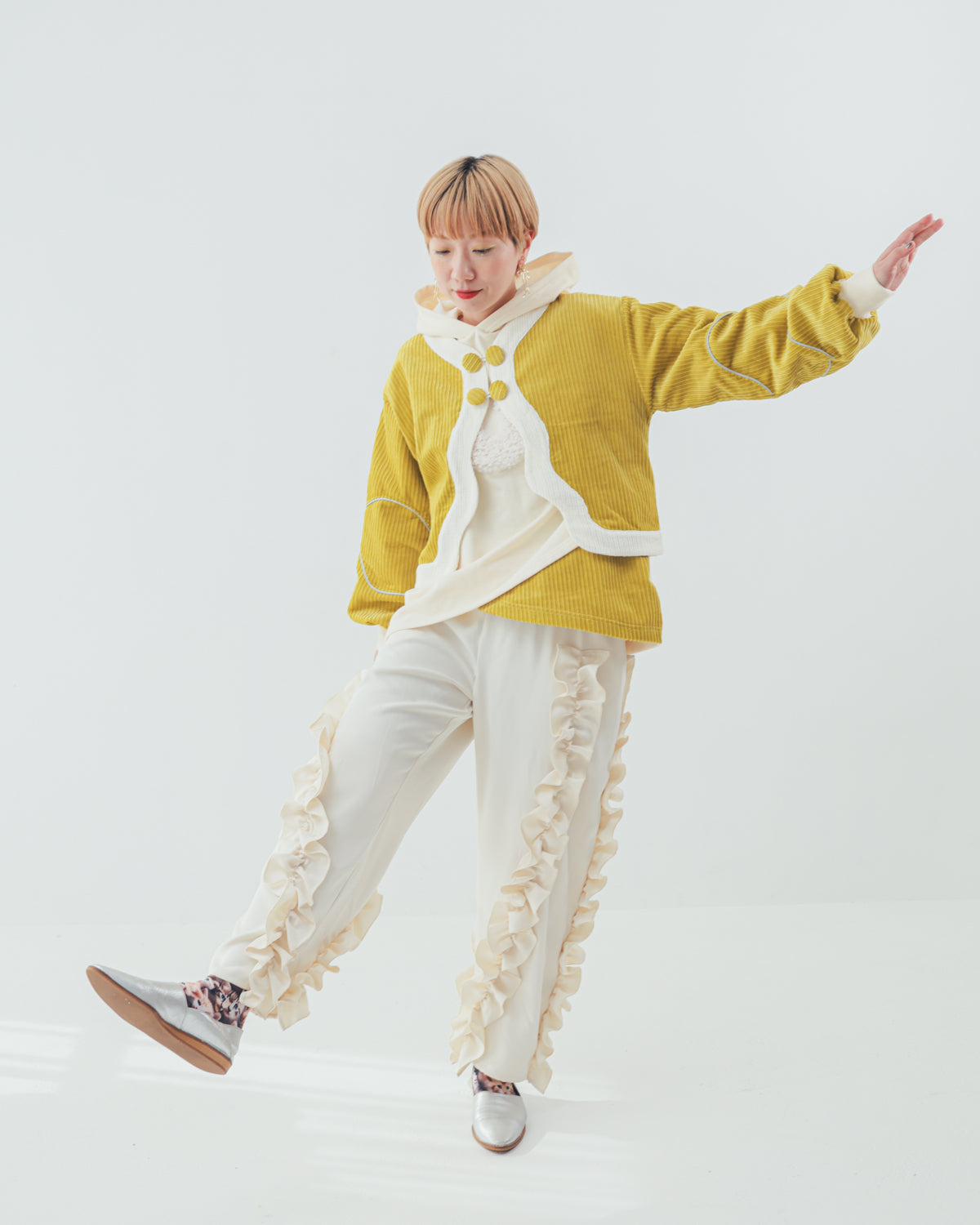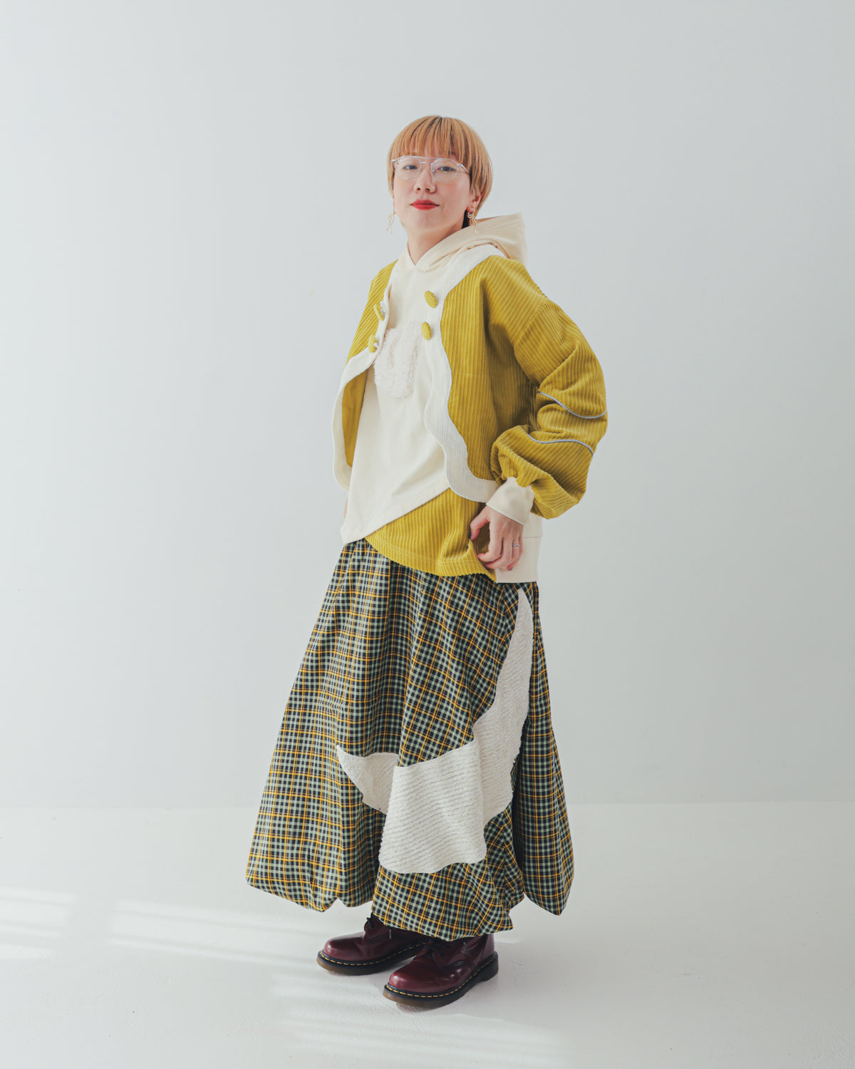 縦の畝が特徴的な秋冬ではお馴染みのコーデュロイ生地を使用したボレロは、差し色として使いやすいイエローとカーキの2色展開。ワンピースとの相性はもちろん、丈の短さを活かしたメリハリのあるコーディネイトが楽しめるのはボレロならでは。裾や袖のパイピングなどに波のようなデザインを施すことで、視覚的にも目を引くアイテムに仕上げました。