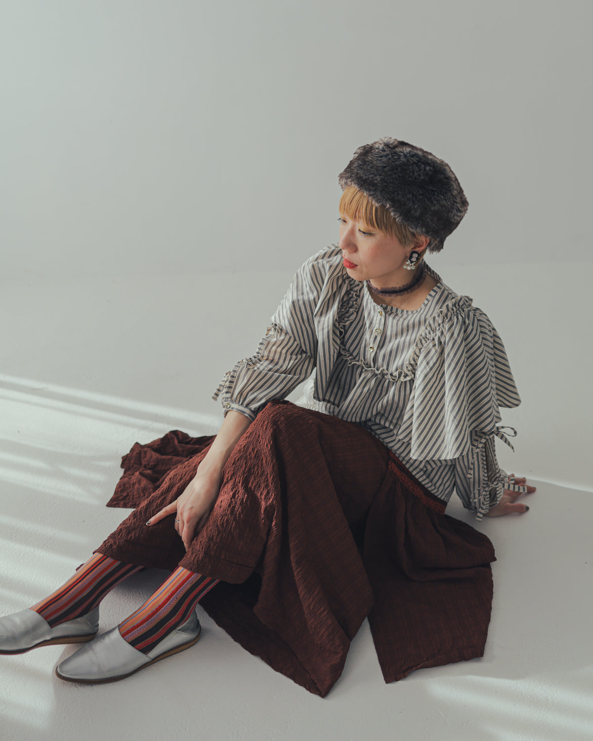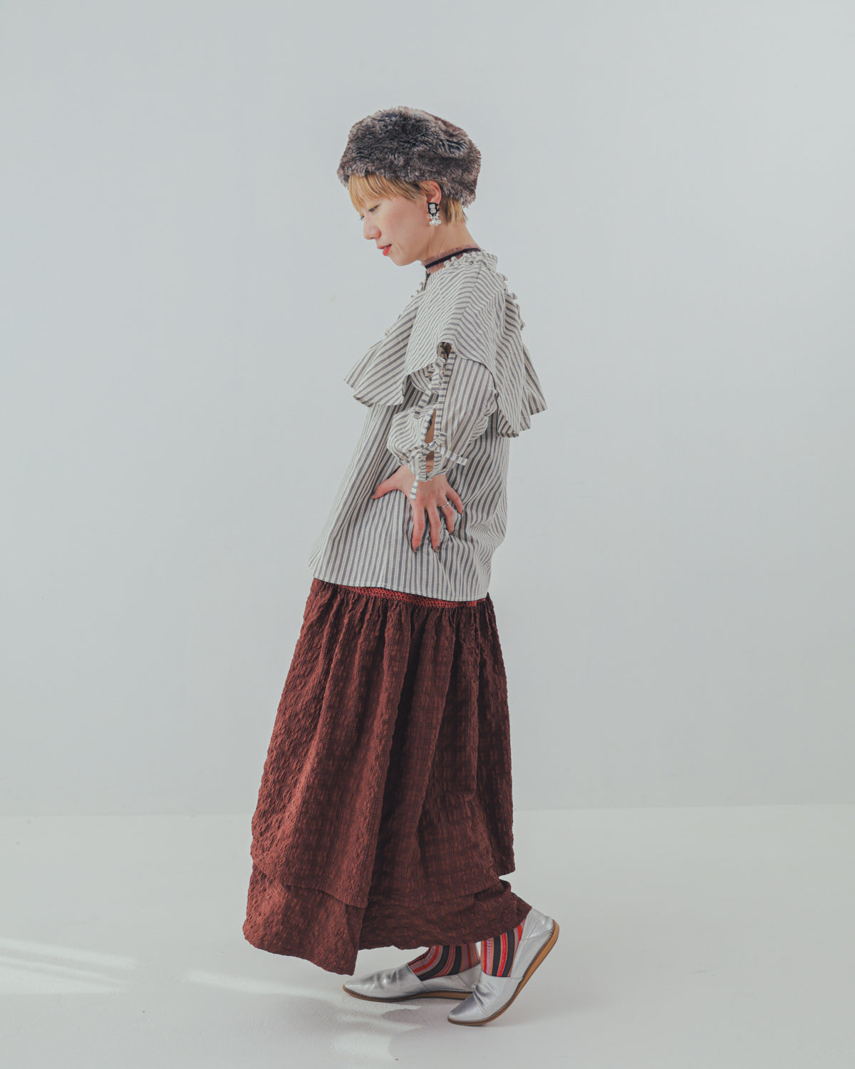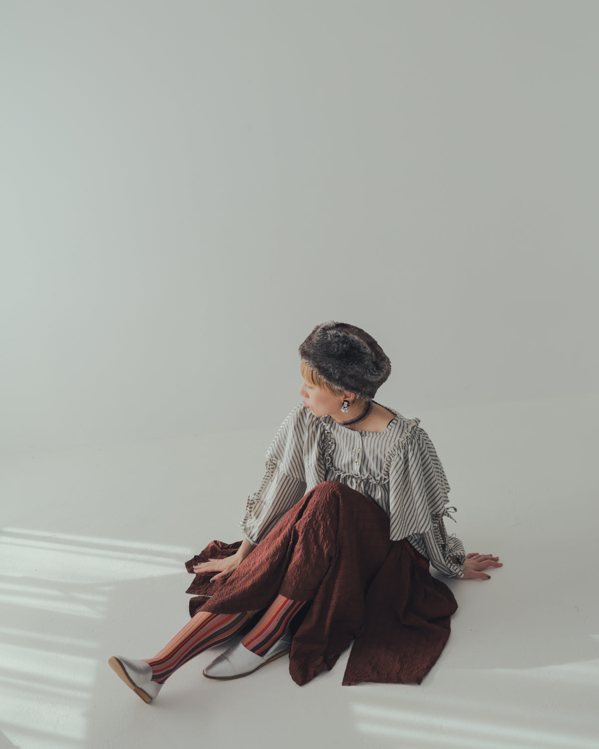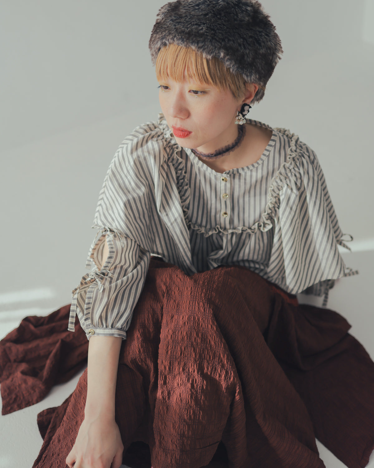 大ぶりのフリルがレディな印象のブラウスは、ストライプ柄にすることで品の良さを引き立たせました。下に重ねたアイテムの色をチラ見せして遊ぶことも出来るよう、袖はカットアウト仕様に。サラリとした生地感のため、秋冬を終えた春先にもお使いいただけます。