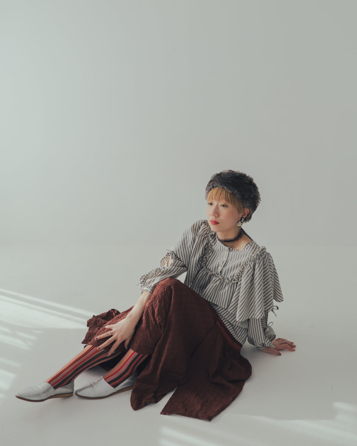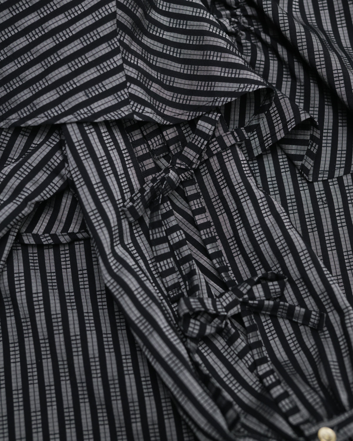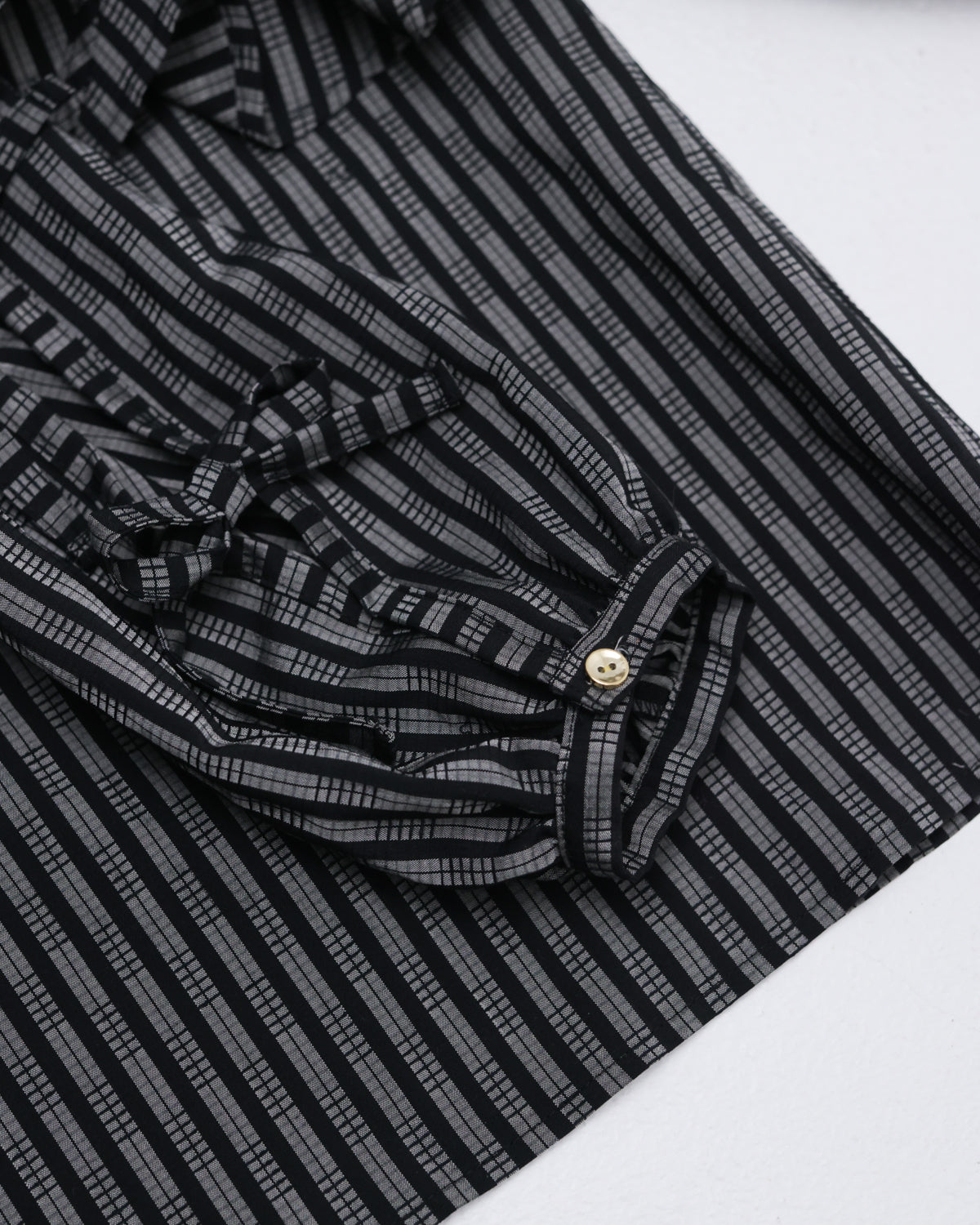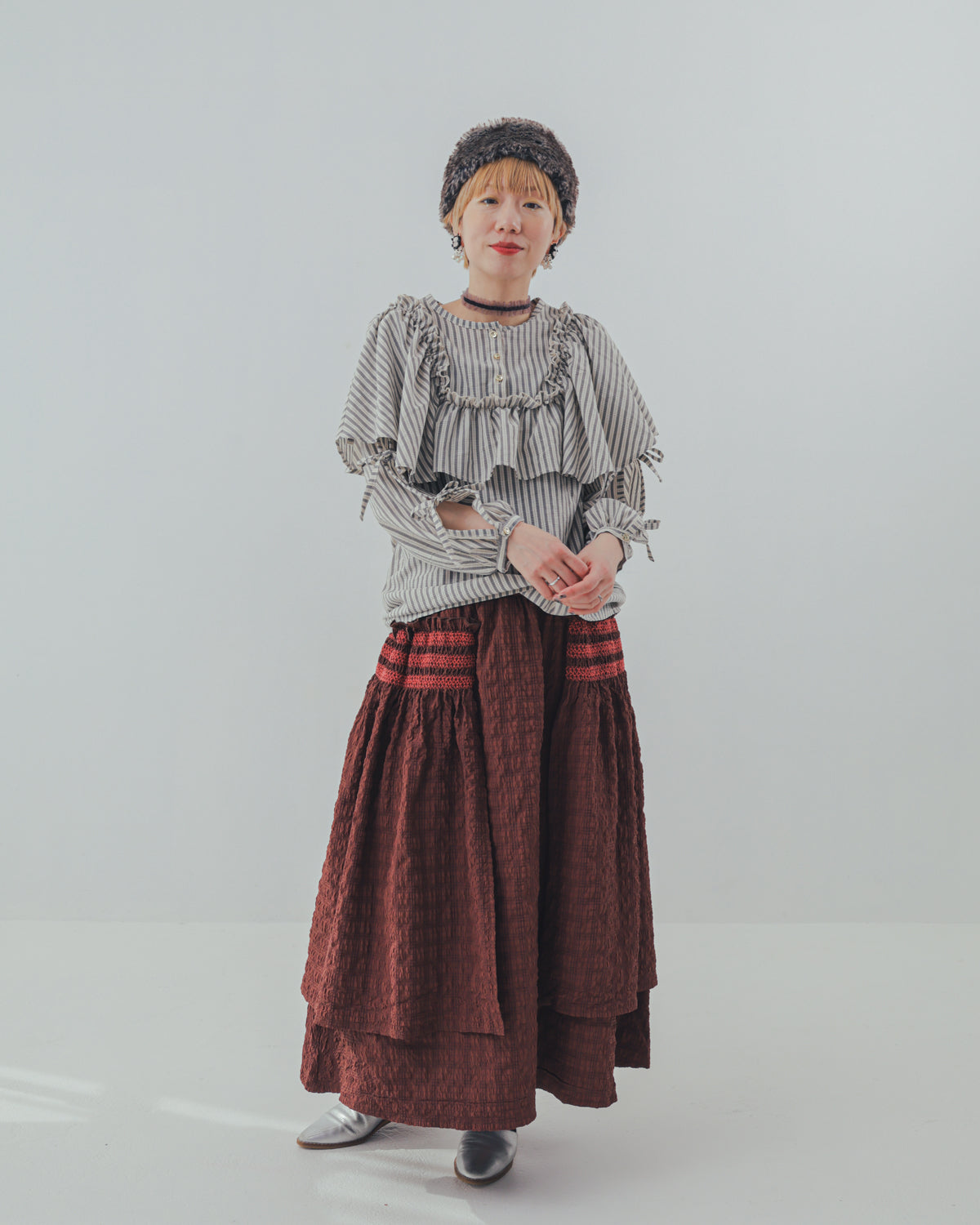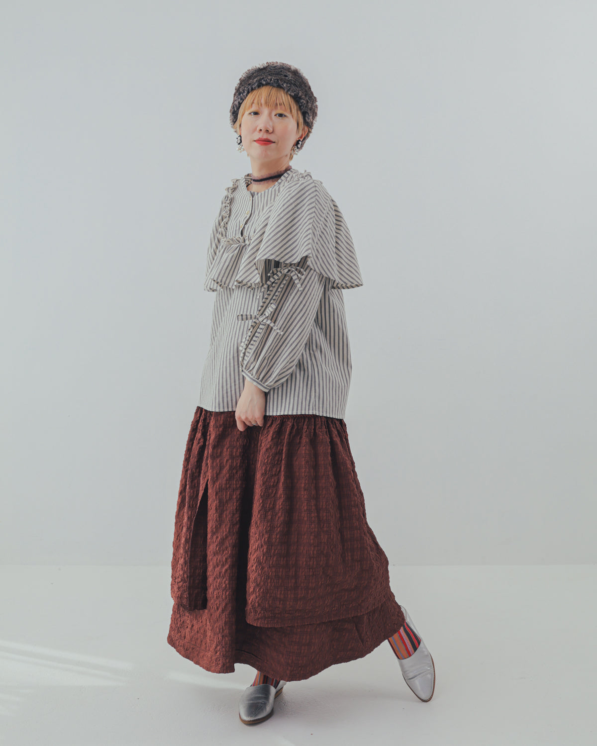 大ぶりのフリルがレディな印象のブラウスは、ストライプ柄にすることで品の良さを引き立たせました。下に重ねたアイテムの色をチラ見せして遊ぶことも出来るよう、袖はカットアウト仕様に。サラリとした生地感のため、秋冬を終えた春先にもお使いいただけます。