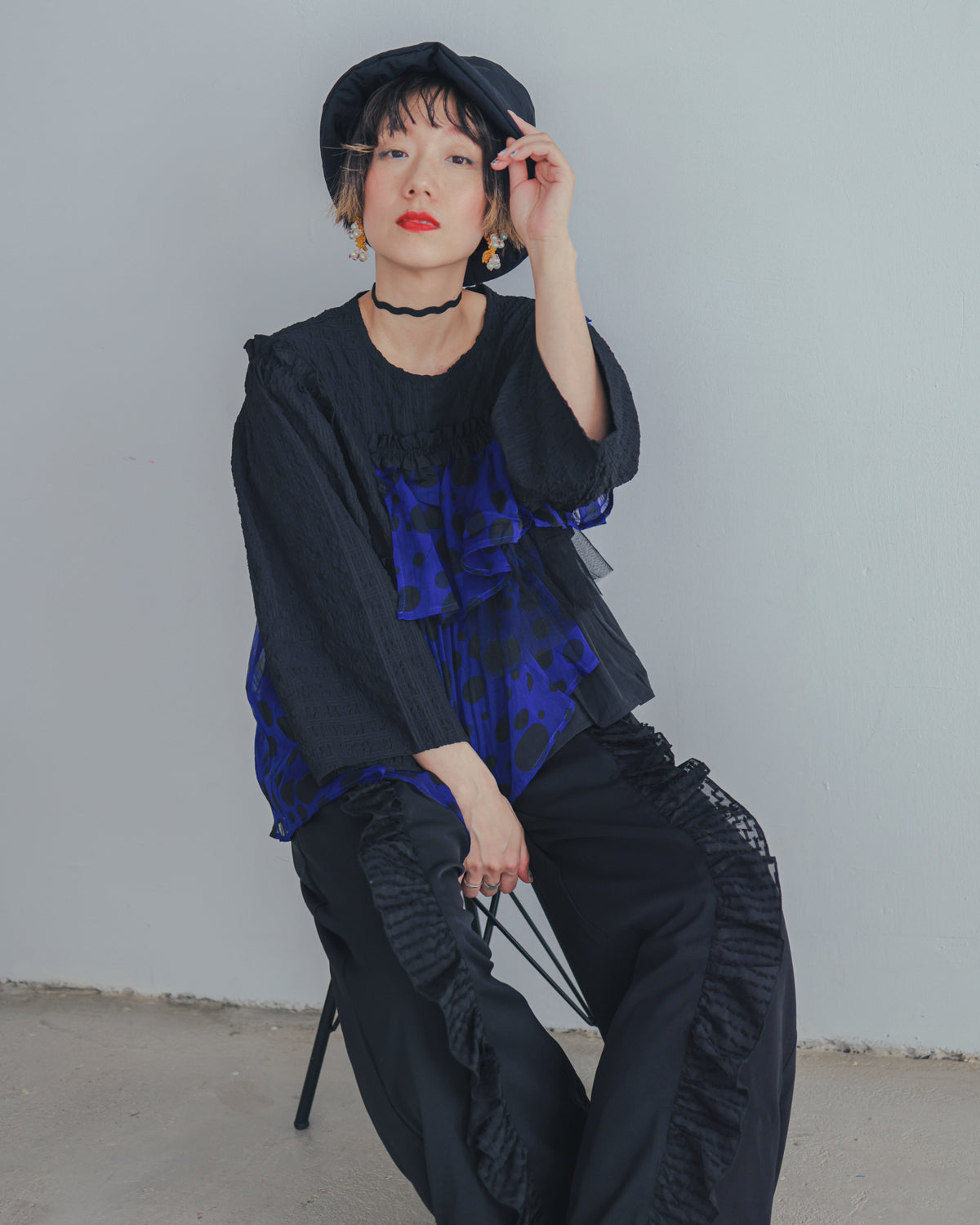 水滴のように大きさの違うドットがランダムに配置された、ポップな水玉模様が目を引くカットソー。一枚なのにまるで重ね着しているかのように見えるのは、質感の異なる生地を絶妙な位置で層のように重ねているから。 フリルのテープを添えることで、存在感のあるトップスに仕上げました。