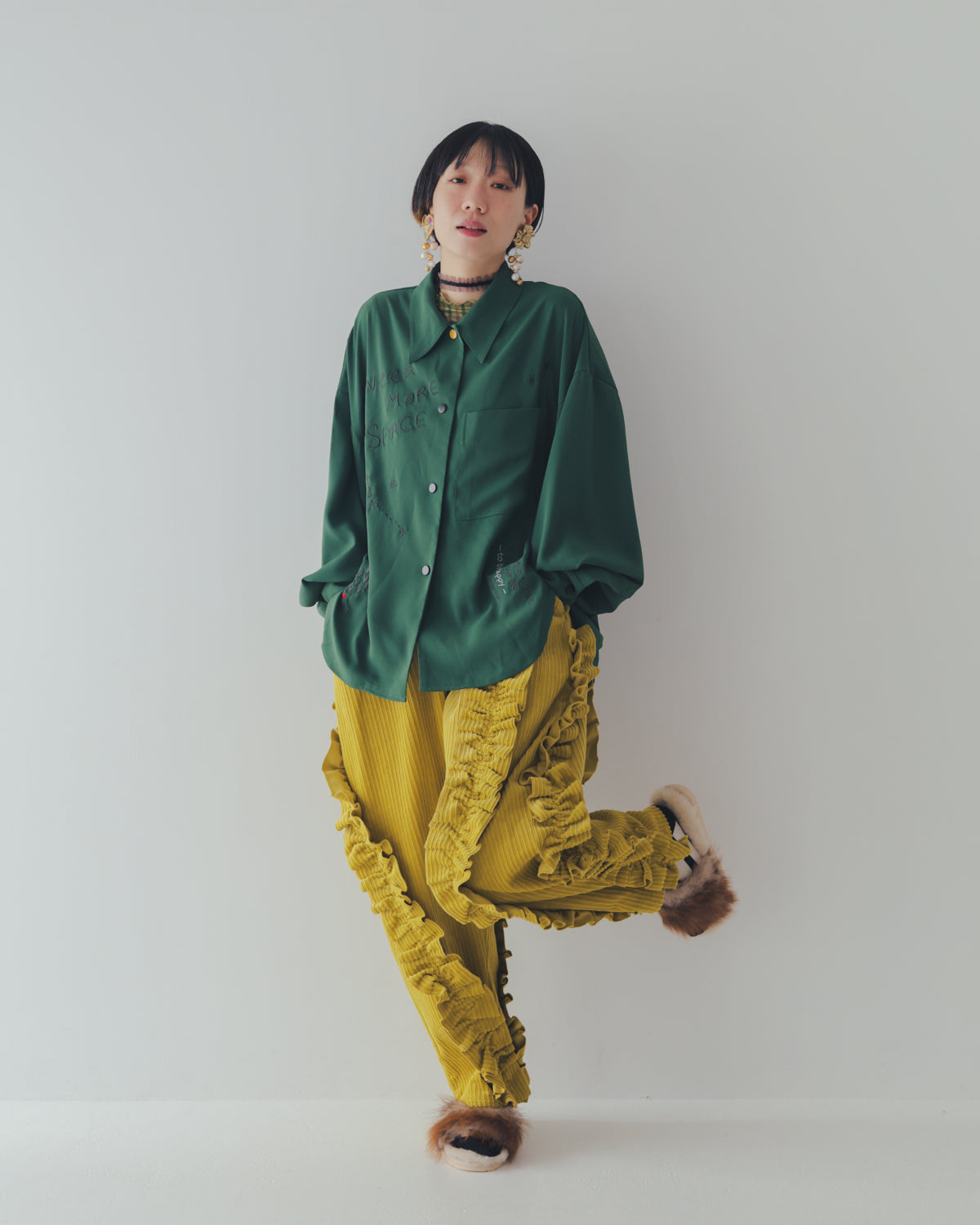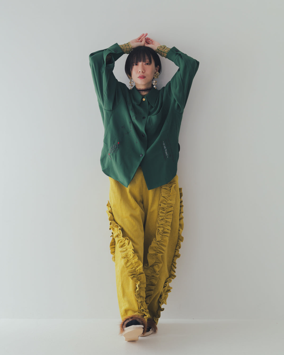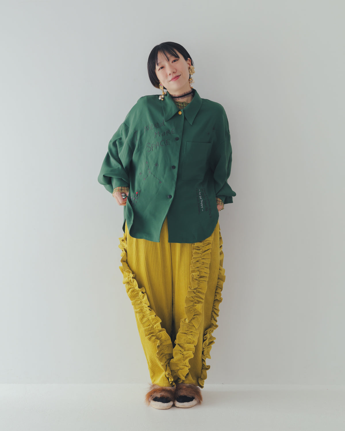 きちんと感のある角襟と、ラフに描かれた星空や英字が心地良いアンバランスを生み出すシャツは、使い勝手の良いオフとブラックにグリーンを加えた3色展開。肩の位置を落としたドロップショルダーがこなれ感を演出するなど、サラッと羽織るだけでもコーディネートに表情が生まれます。留め外しが楽なスナップボタンは、配色に遊び心を持たせました。