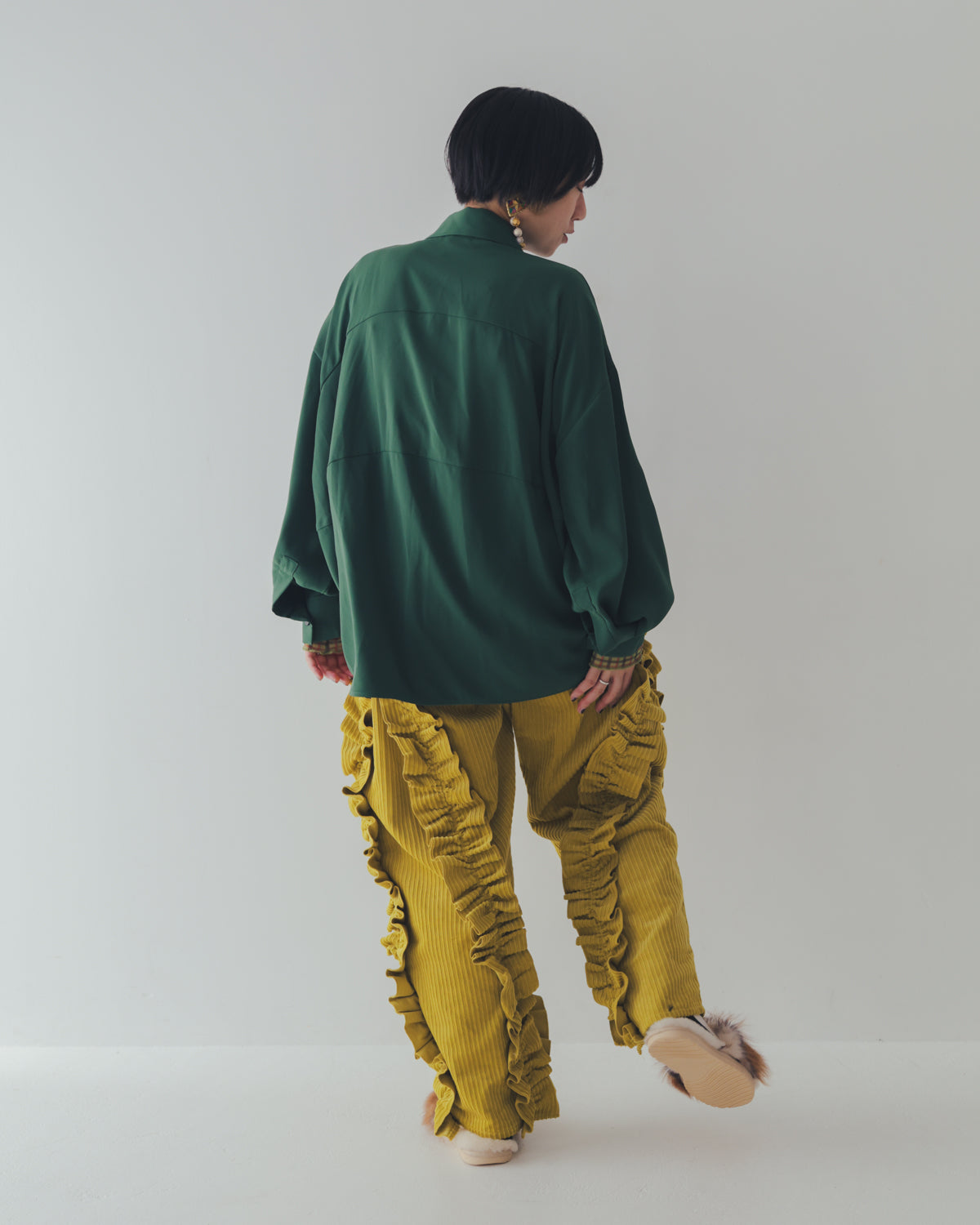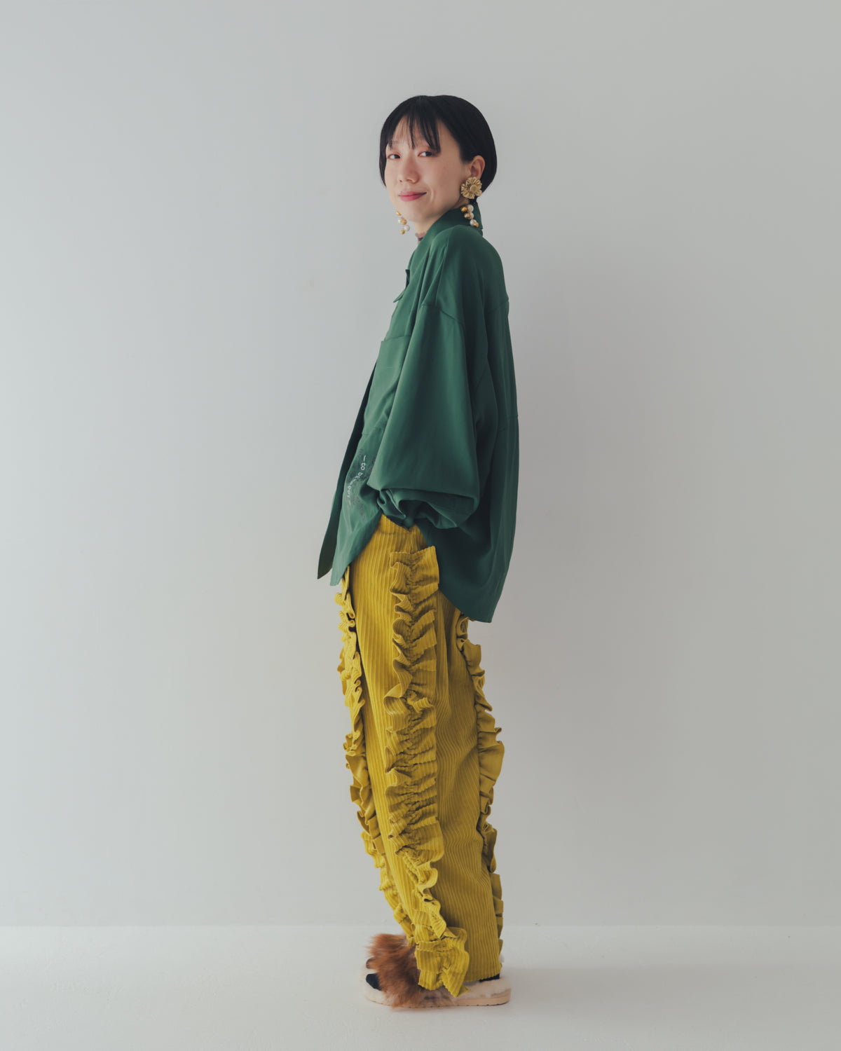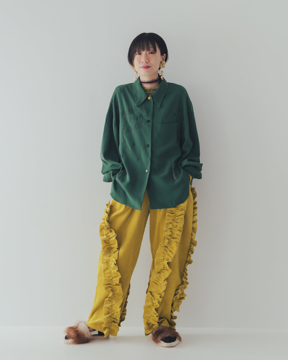 きちんと感のある角襟と、ラフに描かれた星空や英字が心地良いアンバランスを生み出すシャツは、使い勝手の良いオフとブラックにグリーンを加えた3色展開。肩の位置を落としたドロップショルダーがこなれ感を演出するなど、サラッと羽織るだけでもコーディネートに表情が生まれます。留め外しが楽なスナップボタンは、配色に遊び心を持たせました。