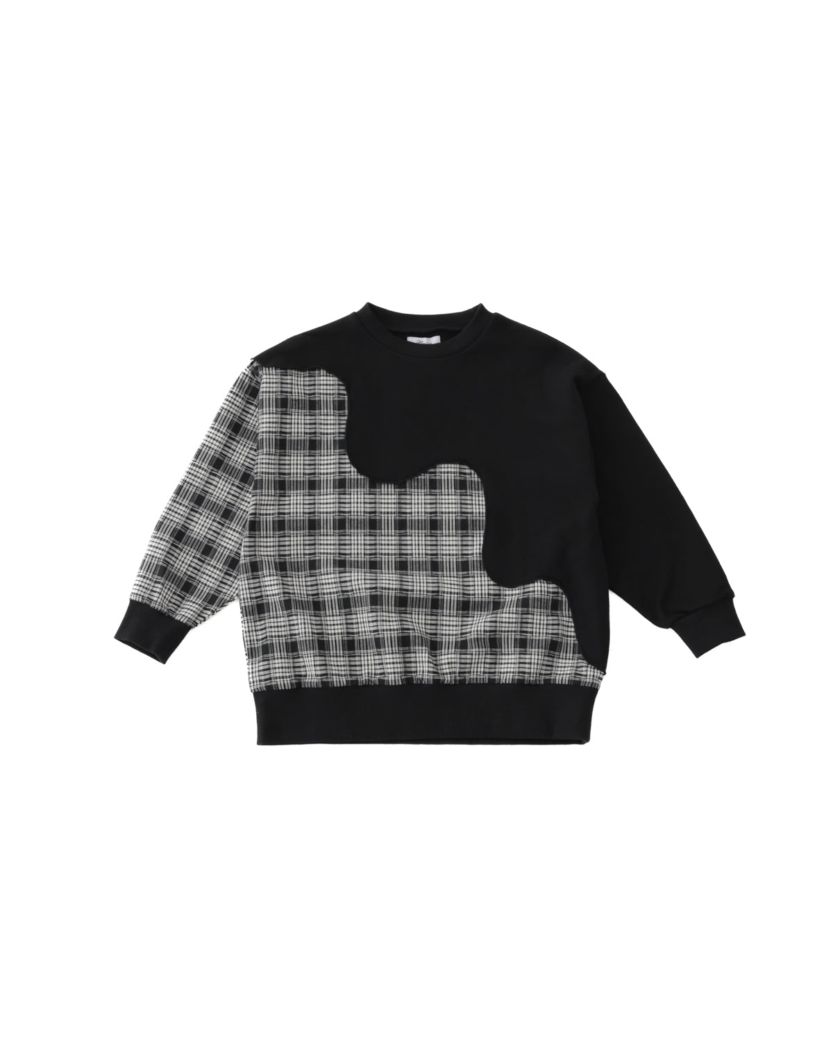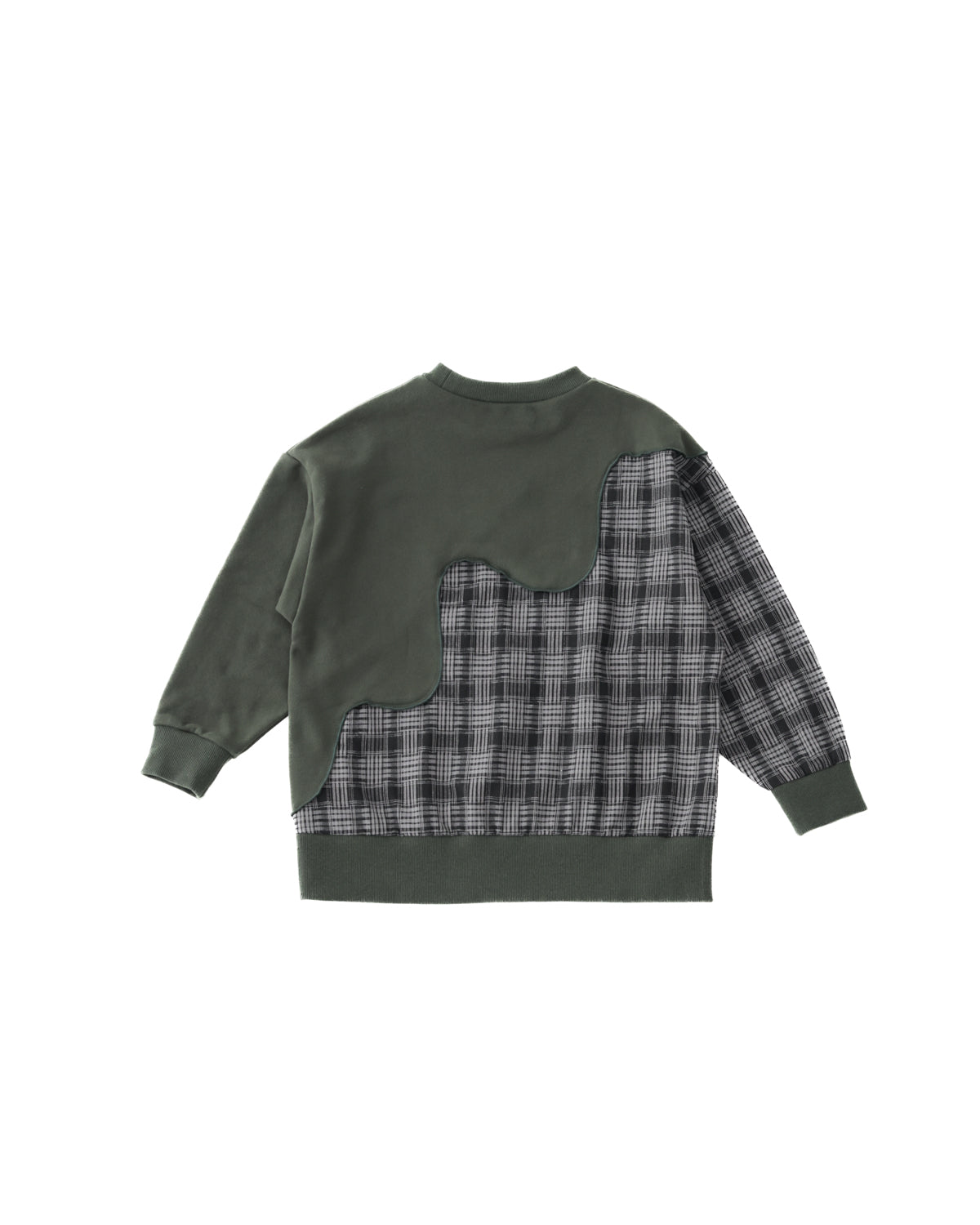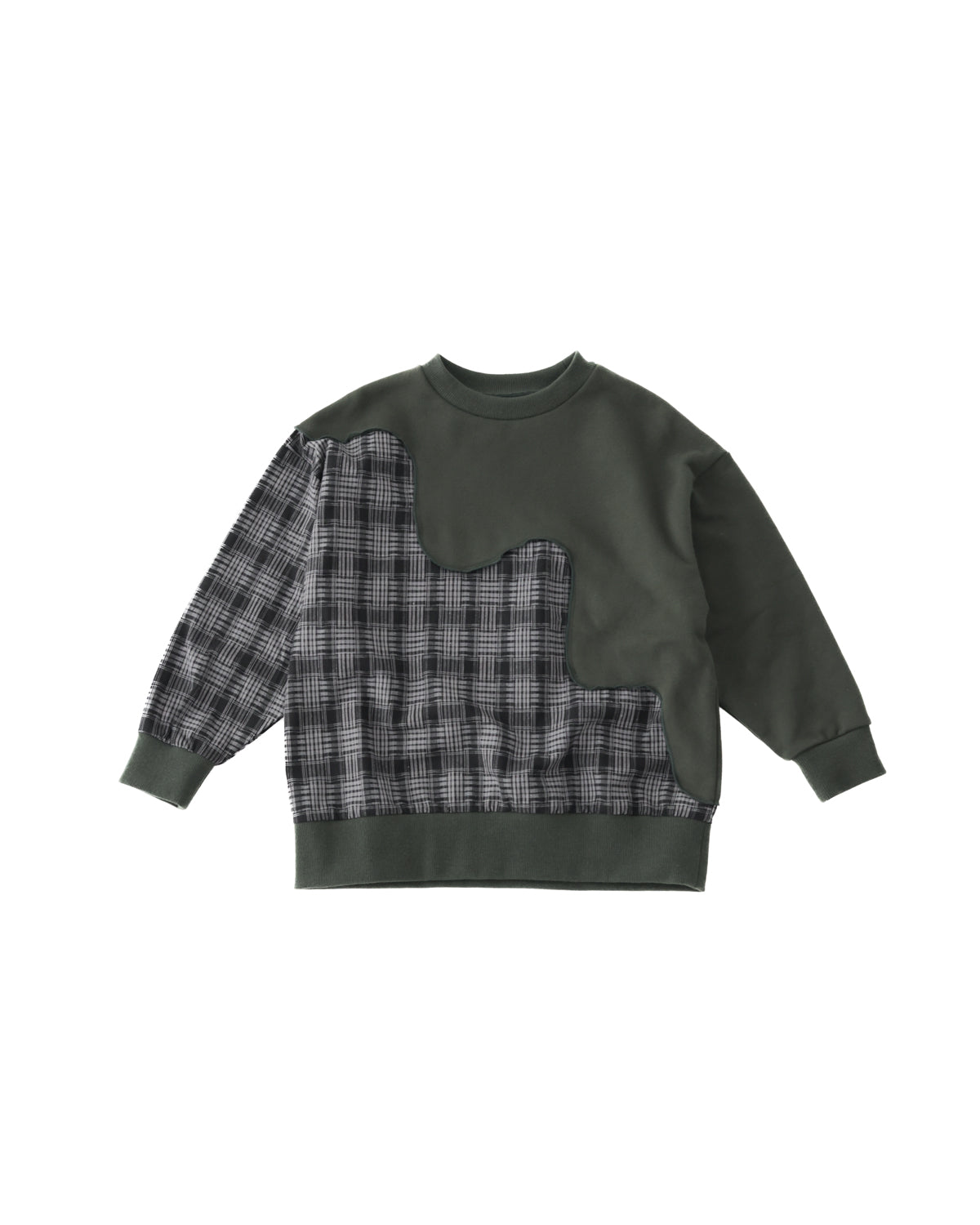 シンプルな無地と、秋冬でお馴染みのチェック柄との組み合わせがユニークなトレーナーです。 斜めに走るゆるやかな波のような切り替えの効果で、シンプルなシルエットでも視覚的にインパクトのある一着に。 カジュアルでありつつもトラッドなコーディネイトにも一役買うアイテムです。
