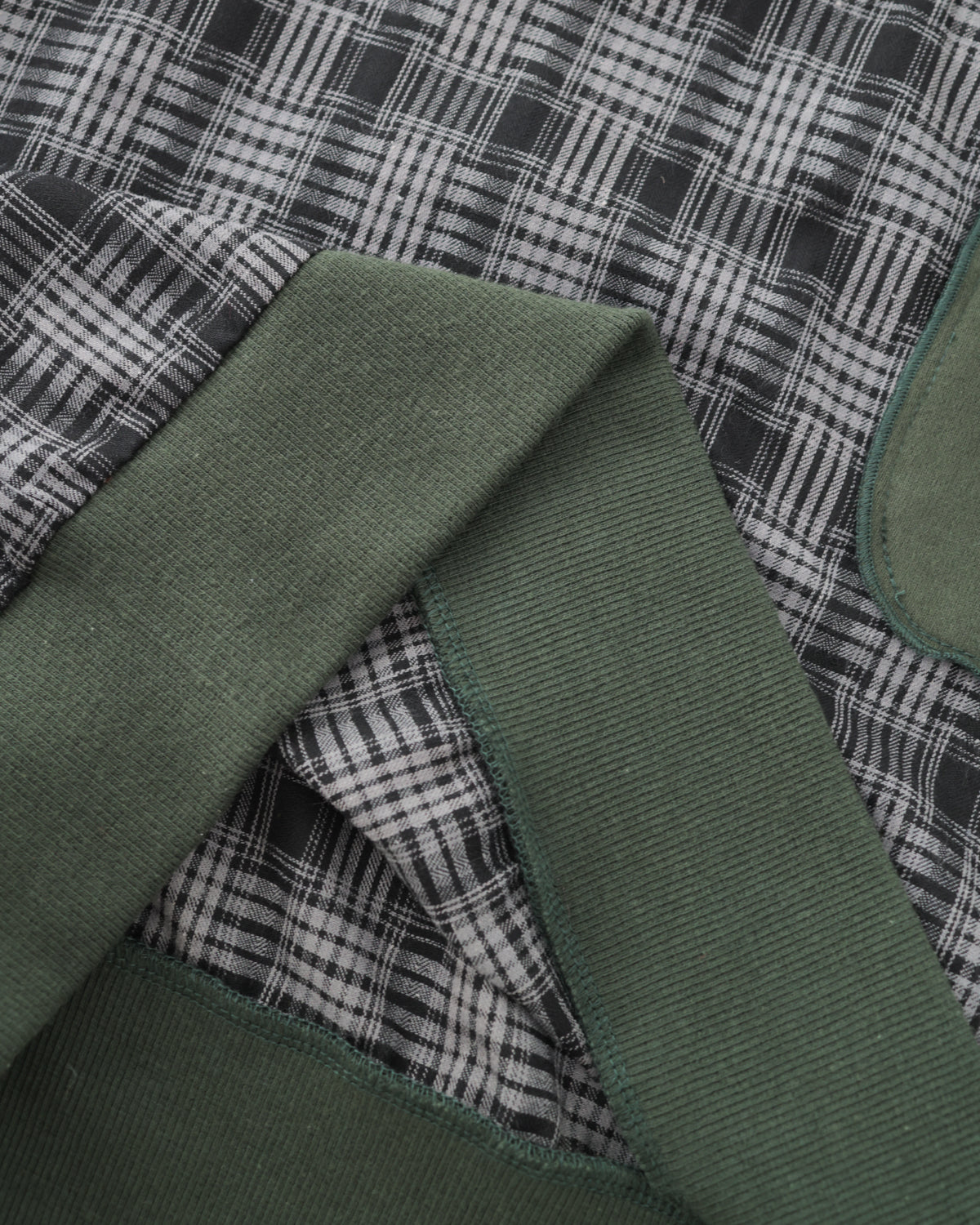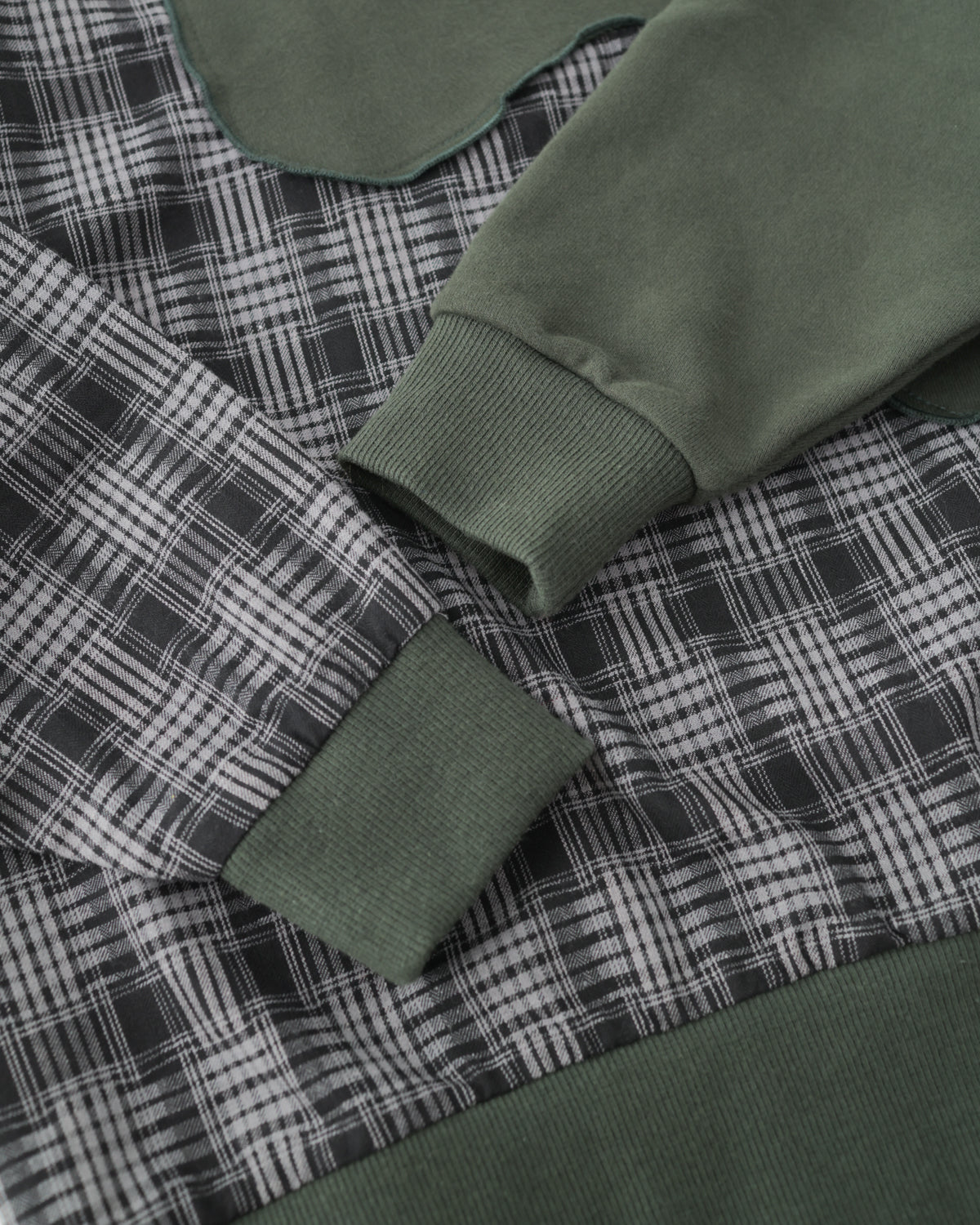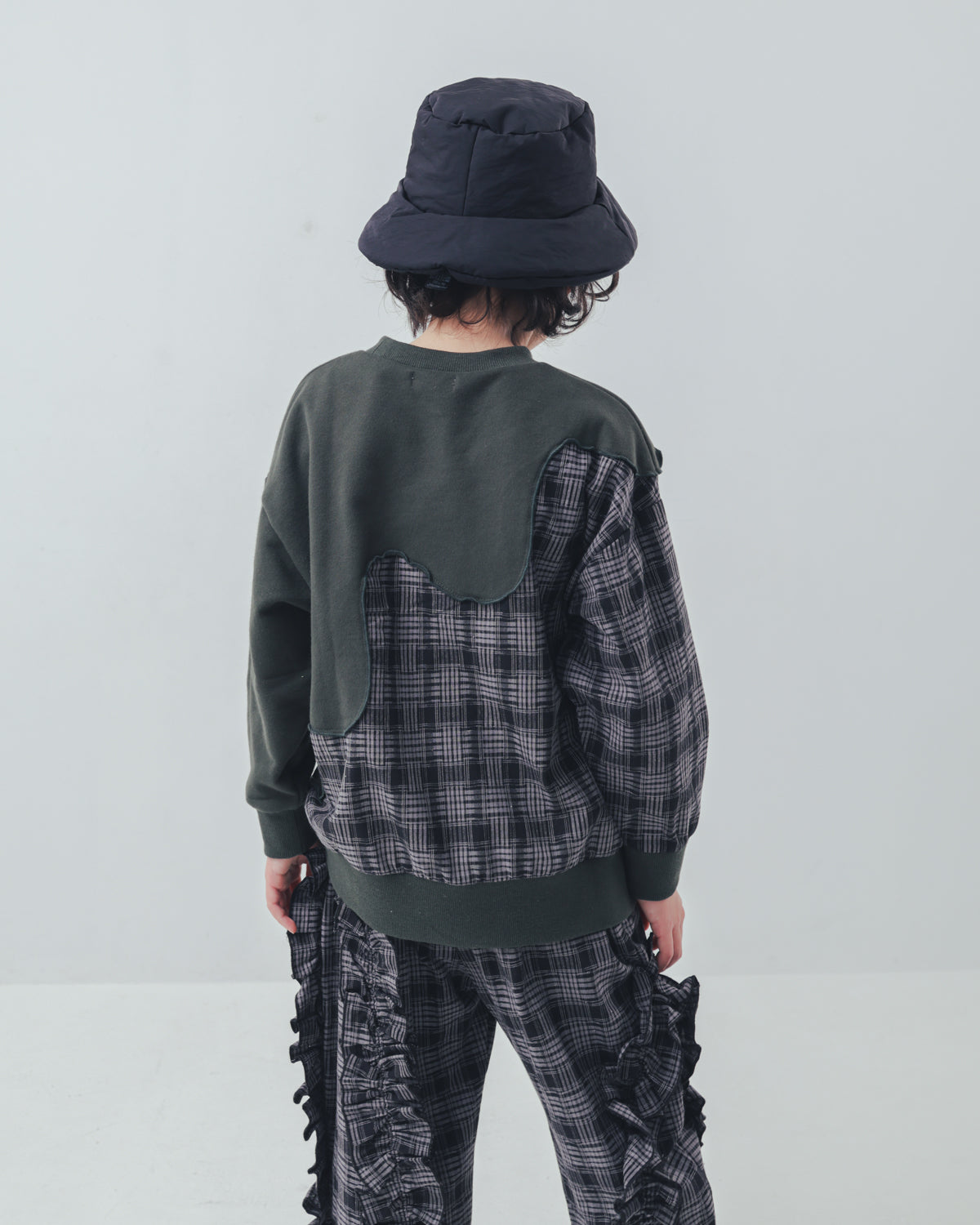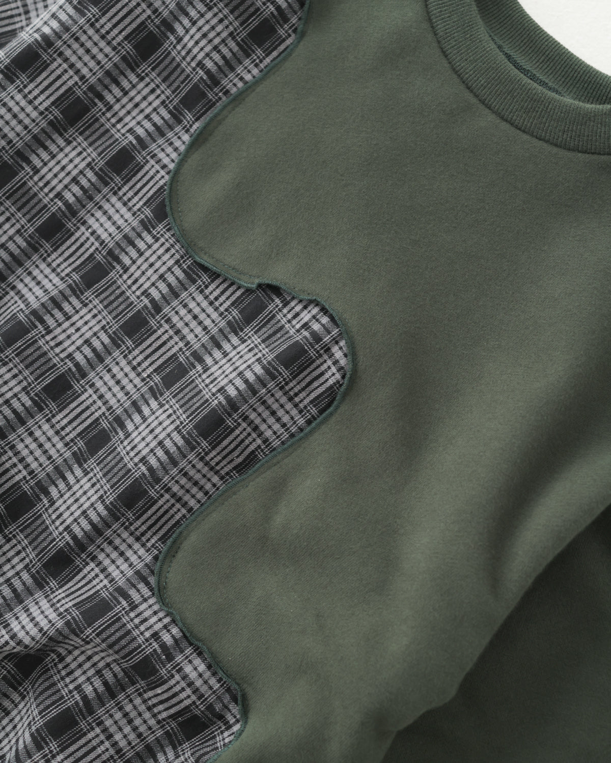 シンプルな無地と、秋冬でお馴染みのチェック柄との組み合わせがユニークなトレーナーです。 斜めに走るゆるやかな波のような切り替えの効果で、シンプルなシルエットでも視覚的にインパクトのある一着に。 カジュアルでありつつもトラッドなコーディネイトにも一役買うアイテムです。