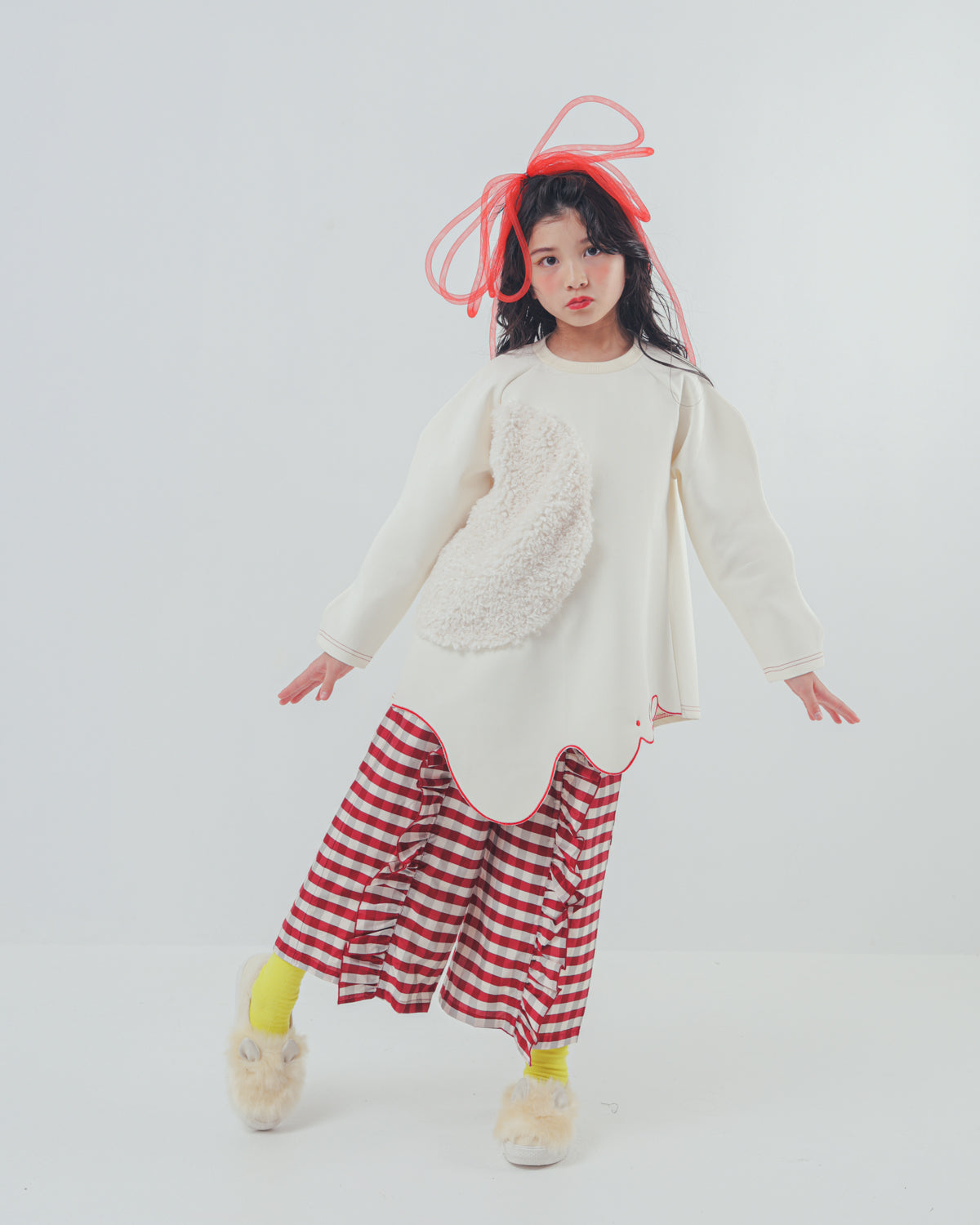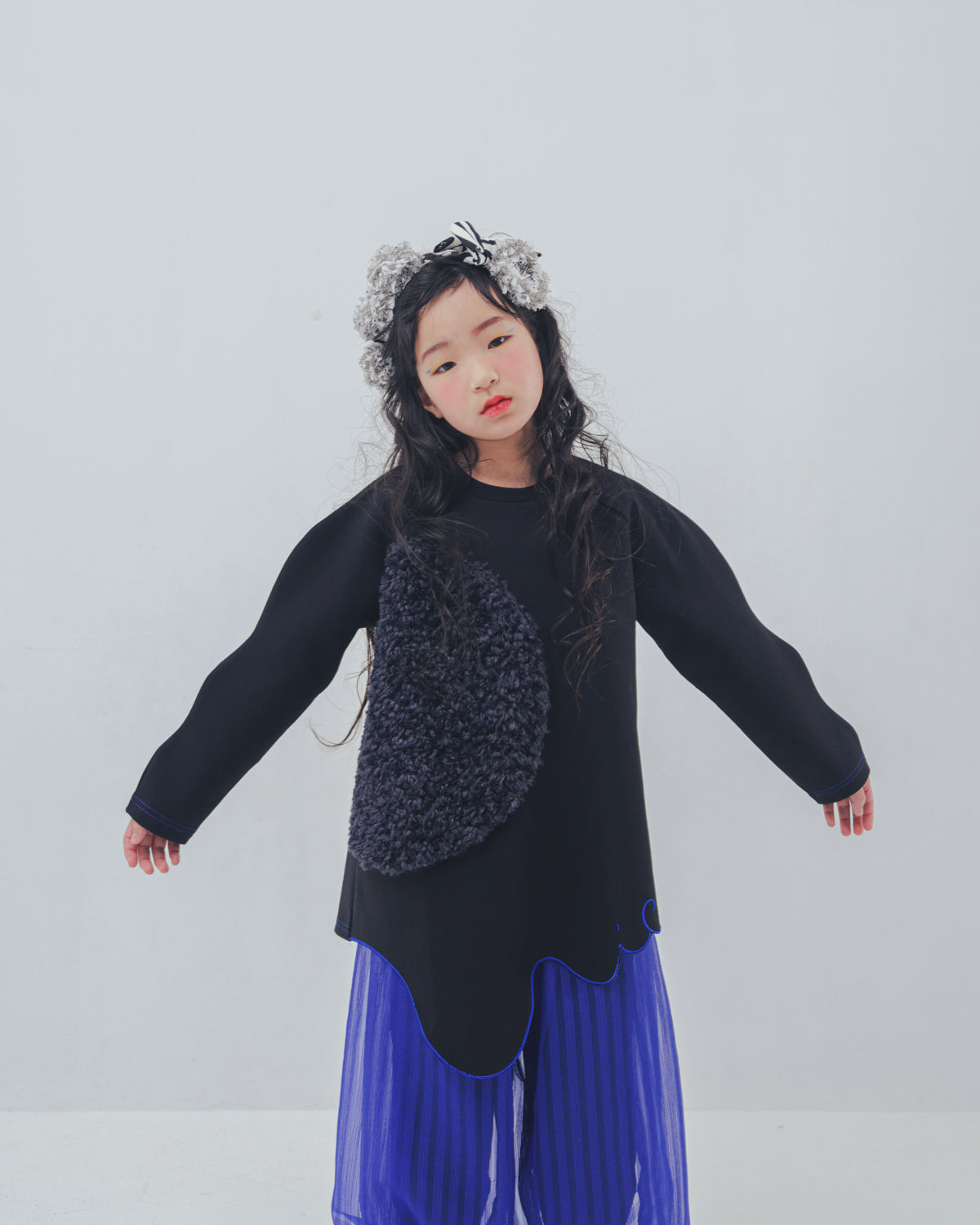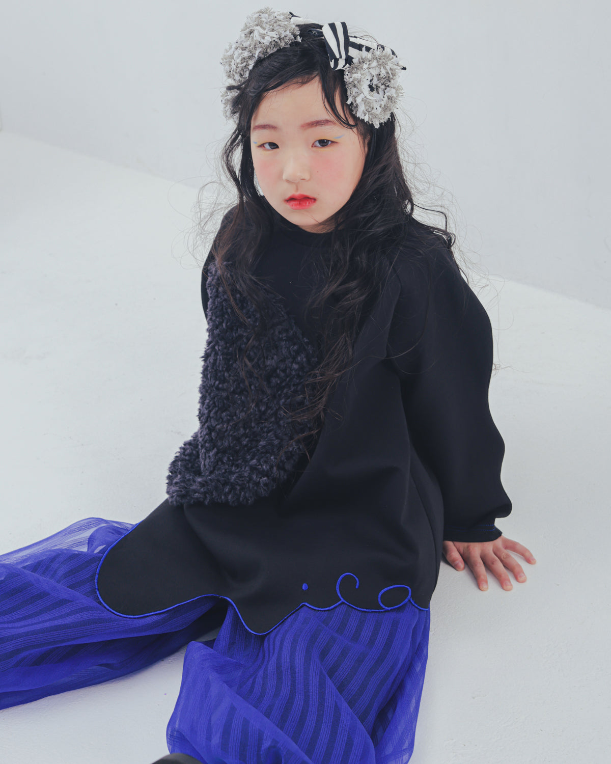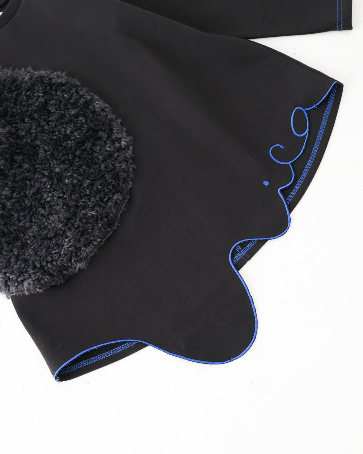 コーディネイトの要としても活躍する、個性派トップスです。前面に大きくデザインされた半円はふかふかのボア素材で、見た目にもあたたか。ユニークなカッティングの裾には、よく見るとブランドネームの刺繍が。波のようにうねった袖など、随所にひねりを効かせました。