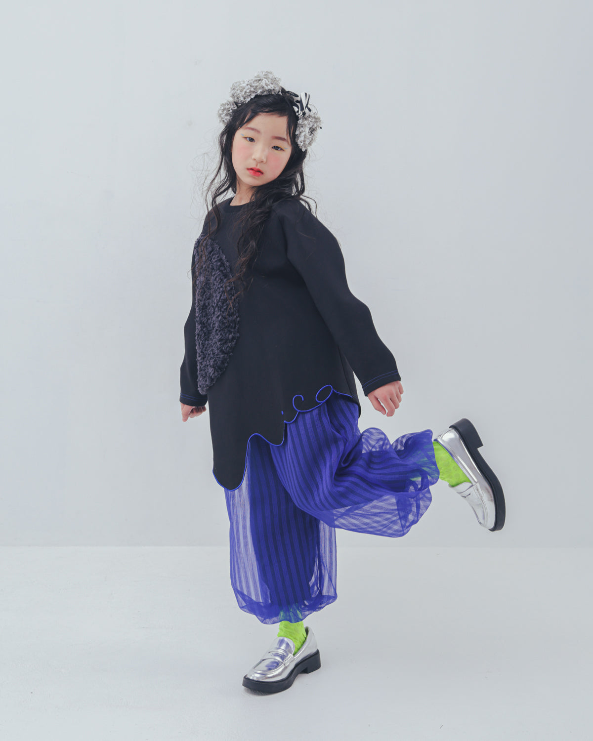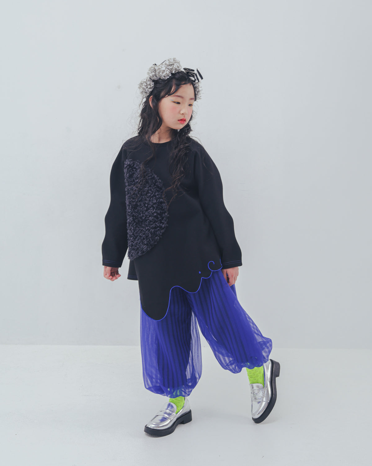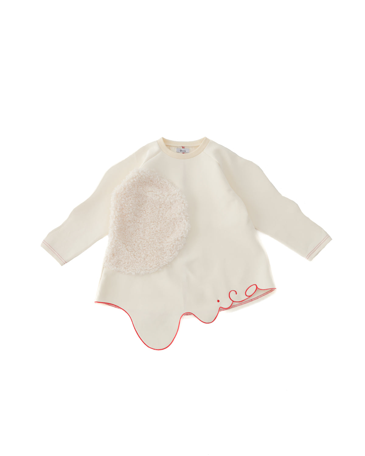 コーディネイトの要としても活躍する、個性派トップスです。前面に大きくデザインされた半円はふかふかのボア素材で、見た目にもあたたか。ユニークなカッティングの裾には、よく見るとブランドネームの刺繍が。波のようにうねった袖など、随所にひねりを効かせました。