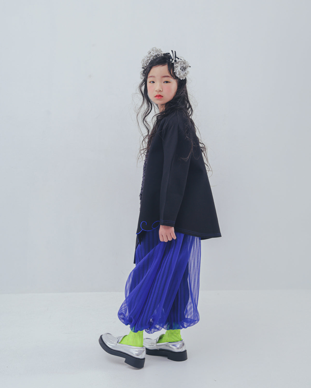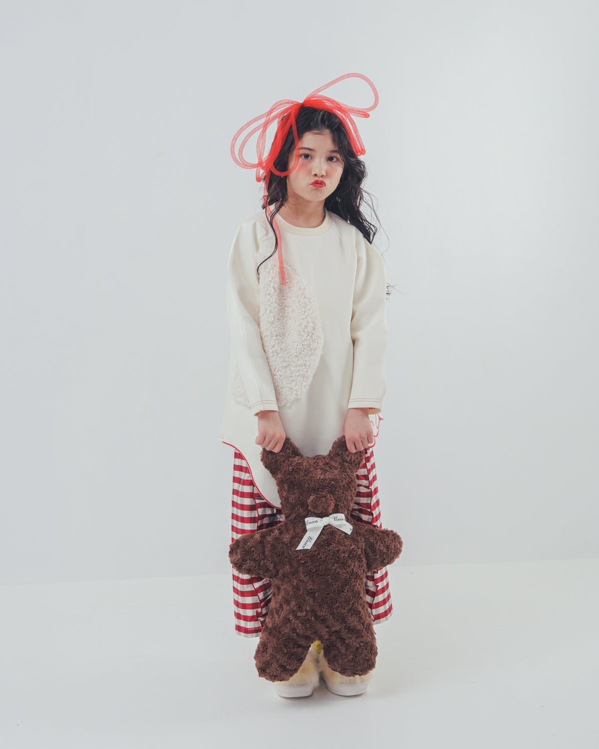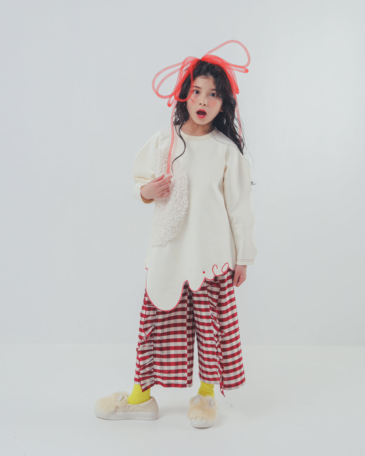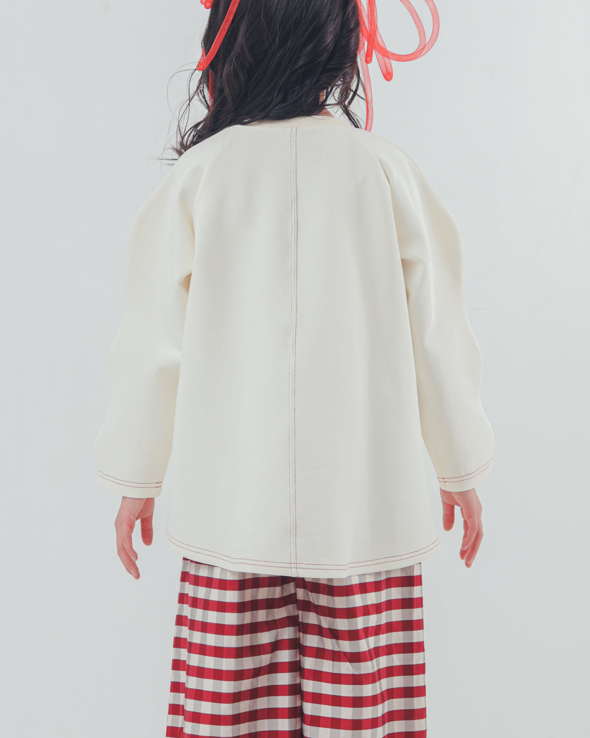 コーディネイトの要としても活躍する、個性派トップスです。前面に大きくデザインされた半円はふかふかのボア素材で、見た目にもあたたか。ユニークなカッティングの裾には、よく見るとブランドネームの刺繍が。波のようにうねった袖など、随所にひねりを効かせました。