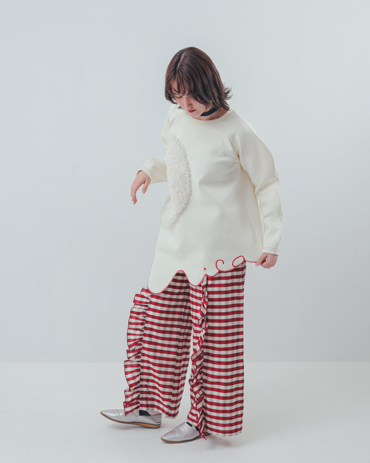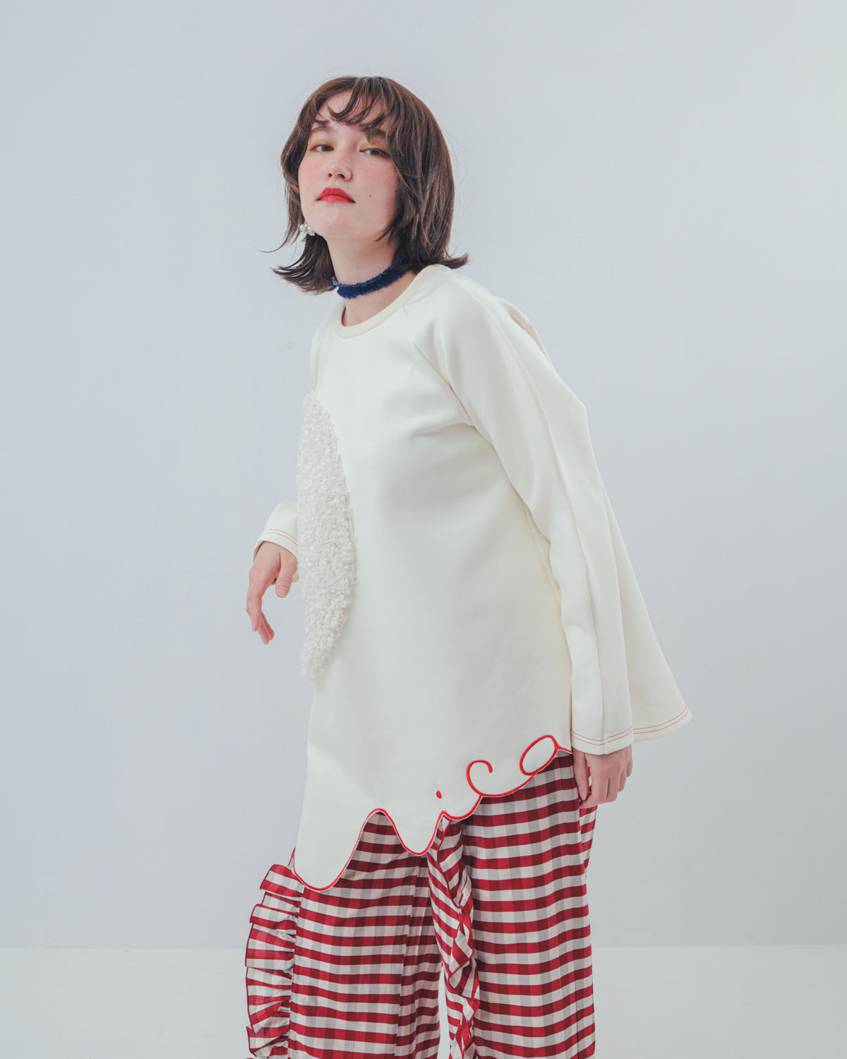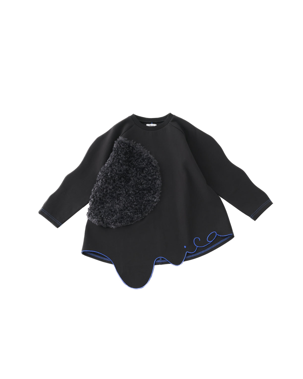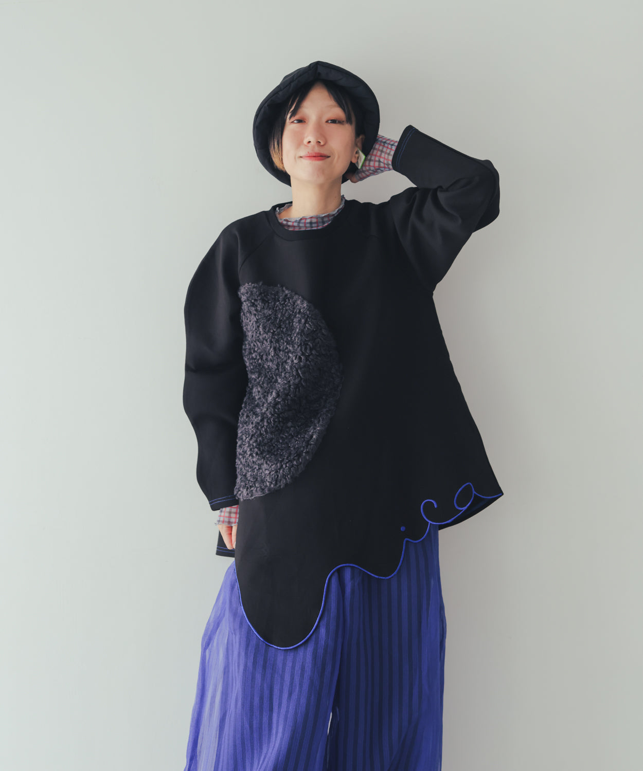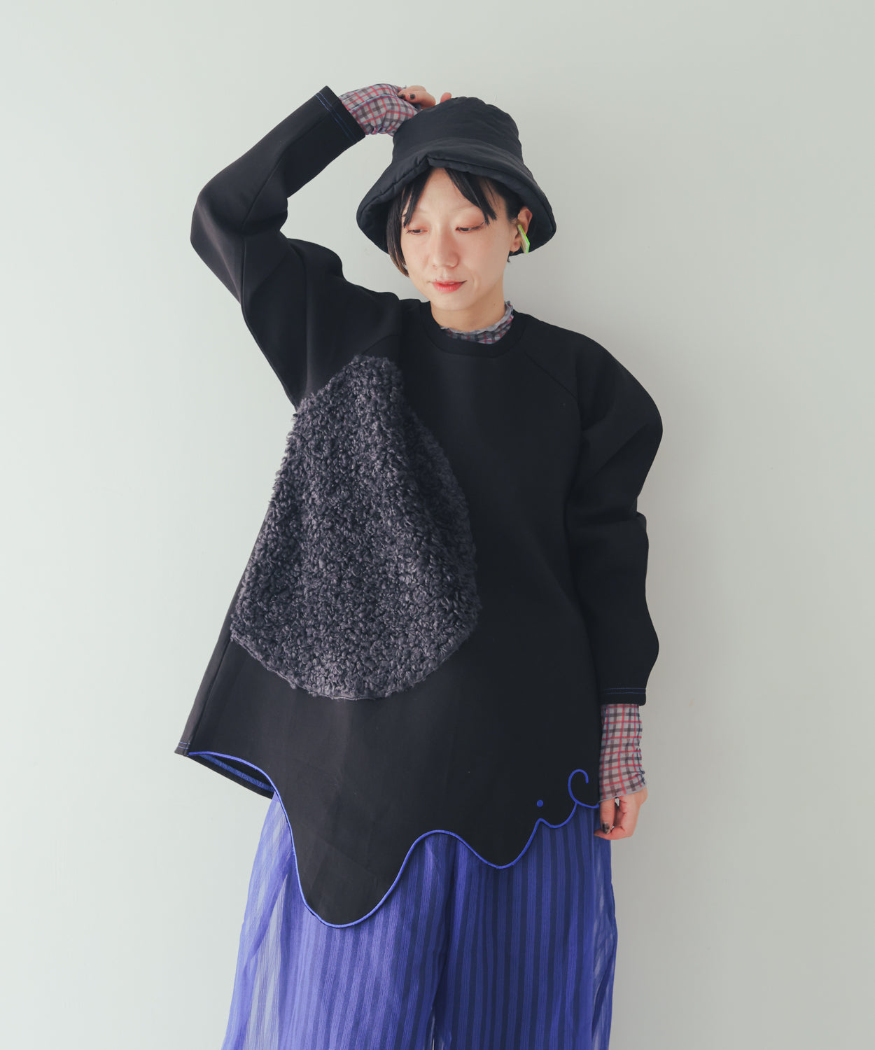 コーディネイトの要としても活躍する、個性派トップスです。前面に大きくデザインされた半円はふかふかのボア素材で、見た目にもあたたか。ユニークなカッティングの裾には、よく見るとブランドネームの刺繍が。波のようにうねった袖など、随所にひねりを効かせました。