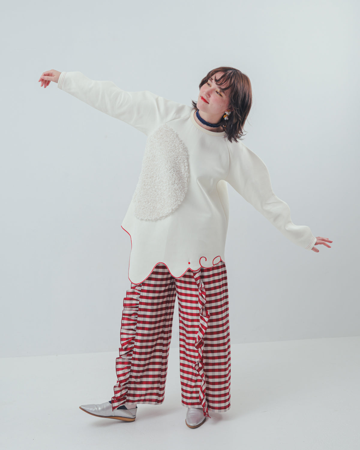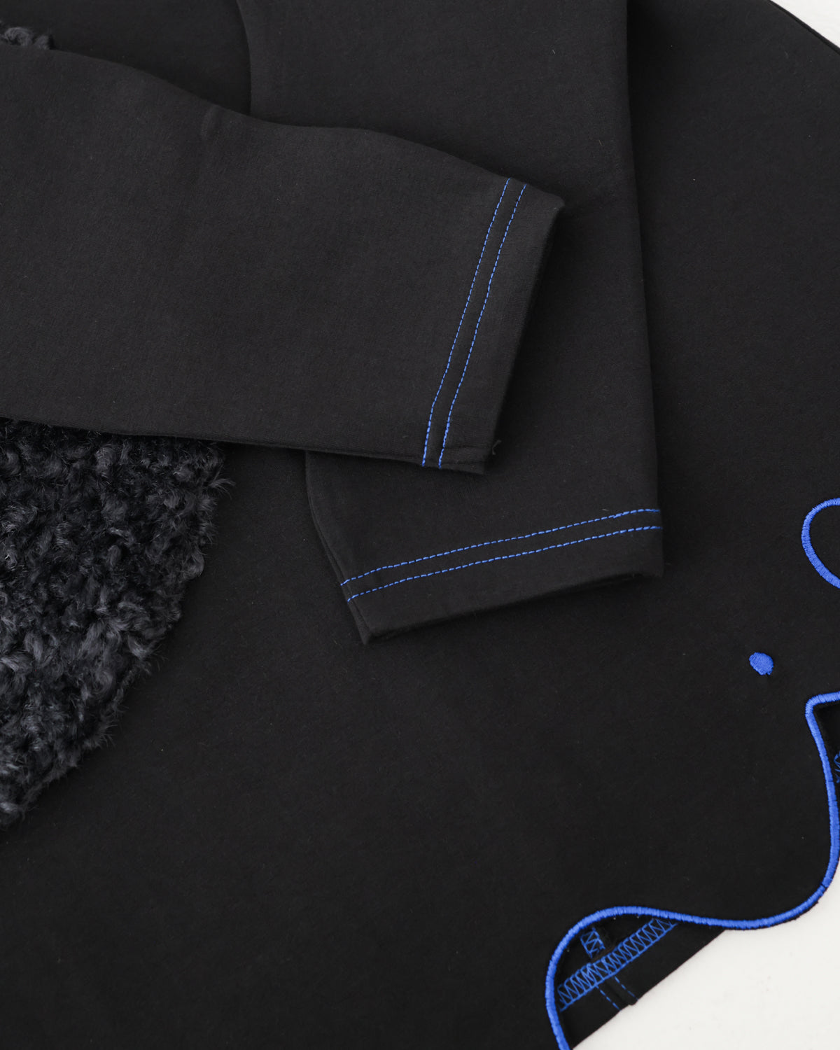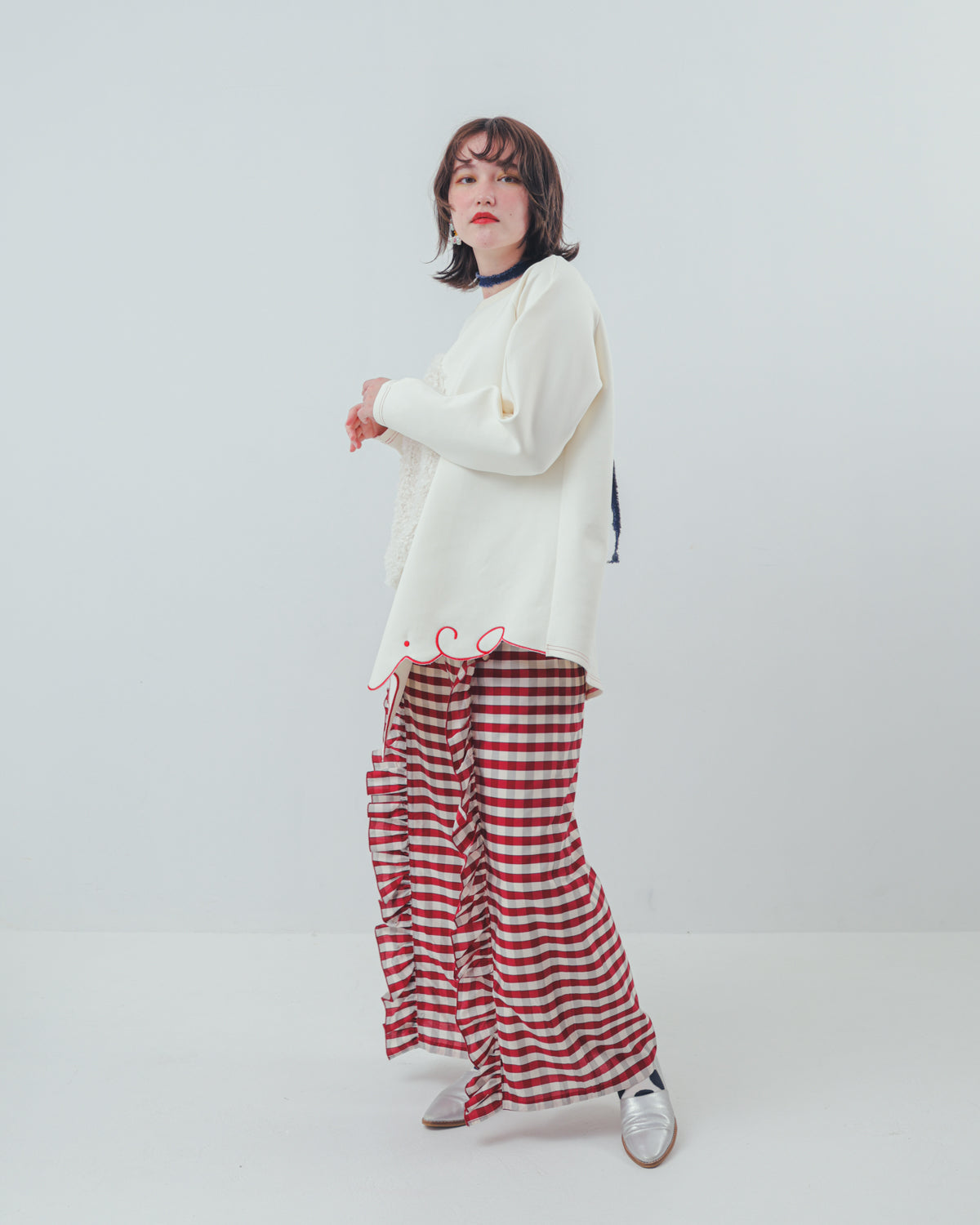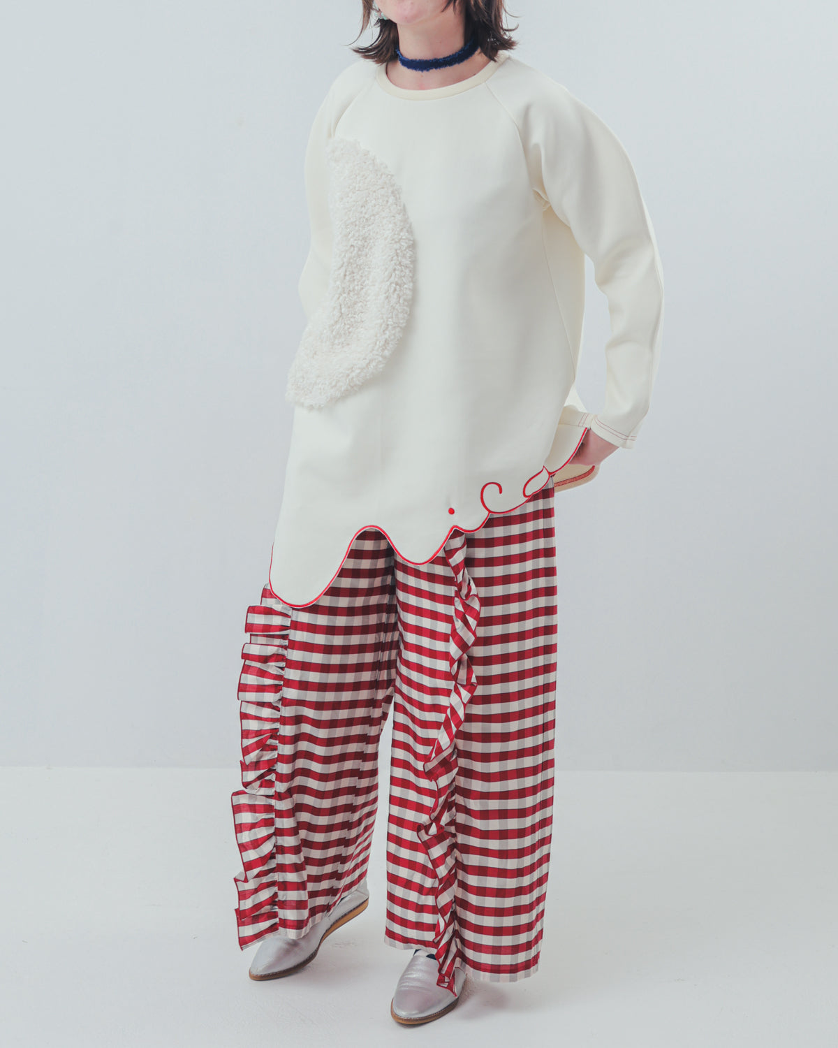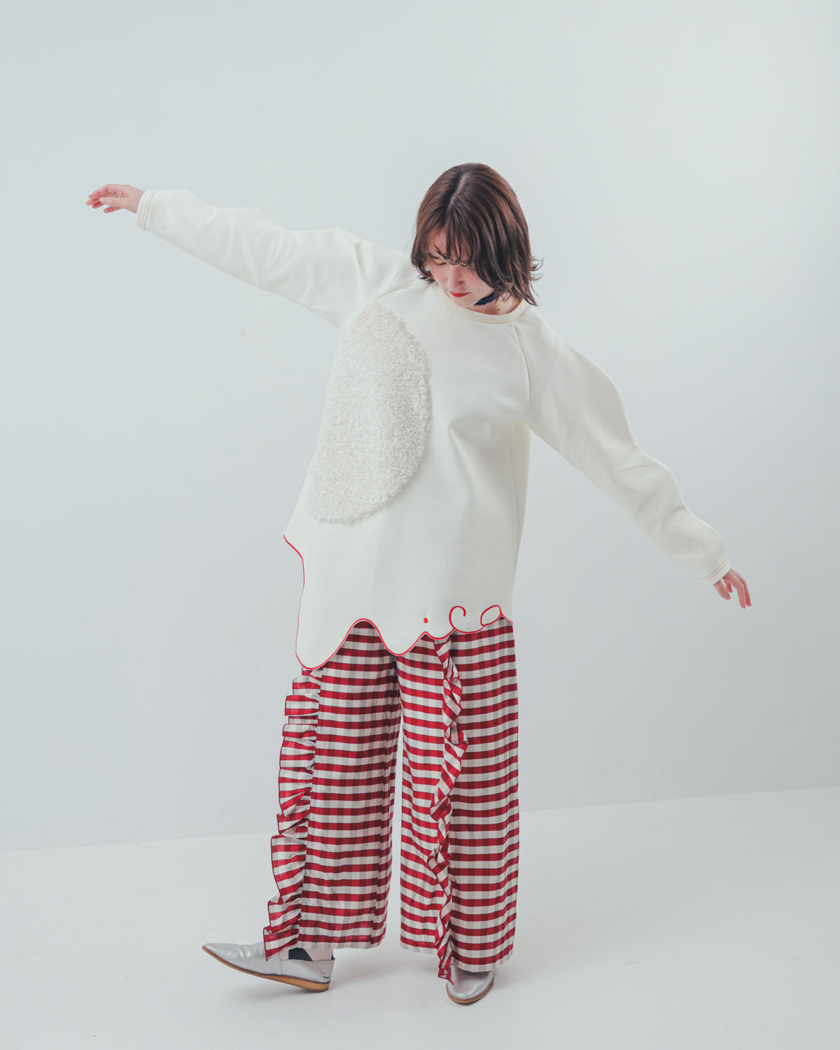 コーディネイトの要としても活躍する、個性派トップスです。前面に大きくデザインされた半円はふかふかのボア素材で、見た目にもあたたか。ユニークなカッティングの裾には、よく見るとブランドネームの刺繍が。波のようにうねった袖など、随所にひねりを効かせました。