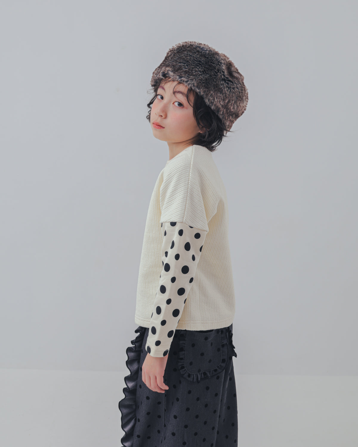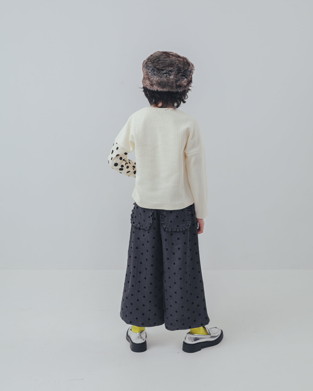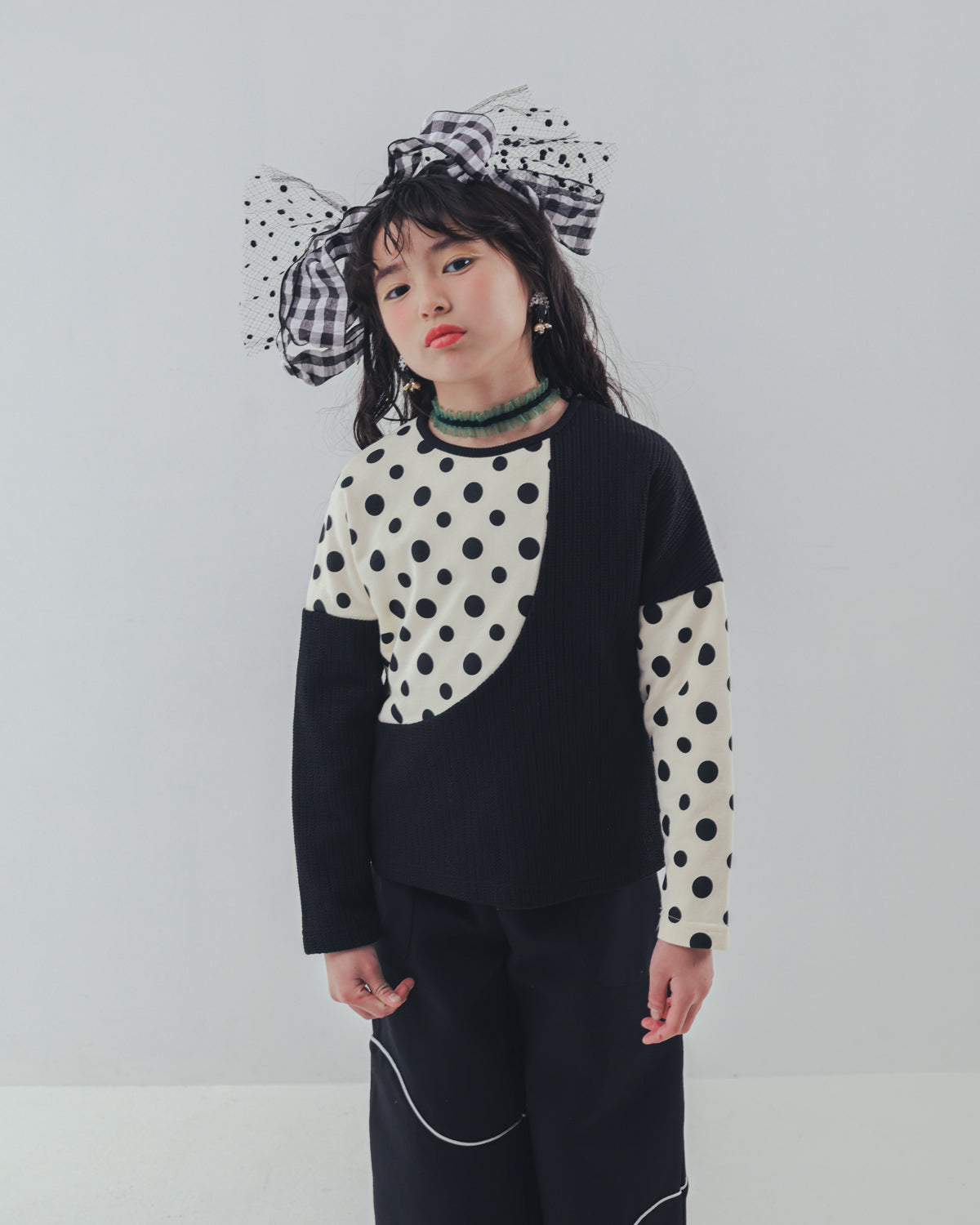 着回しの利くカットソーは、肩や腕まわりがゆるやかなドロップショルダー仕様。ポップで可愛い印象のドット柄も、モノトーンにすることで幼くなり過ぎない印象に。秋冬らしい柔らかなニット生地が、アクティブな日常に寄り添います。