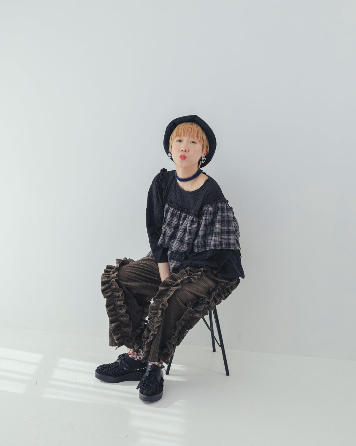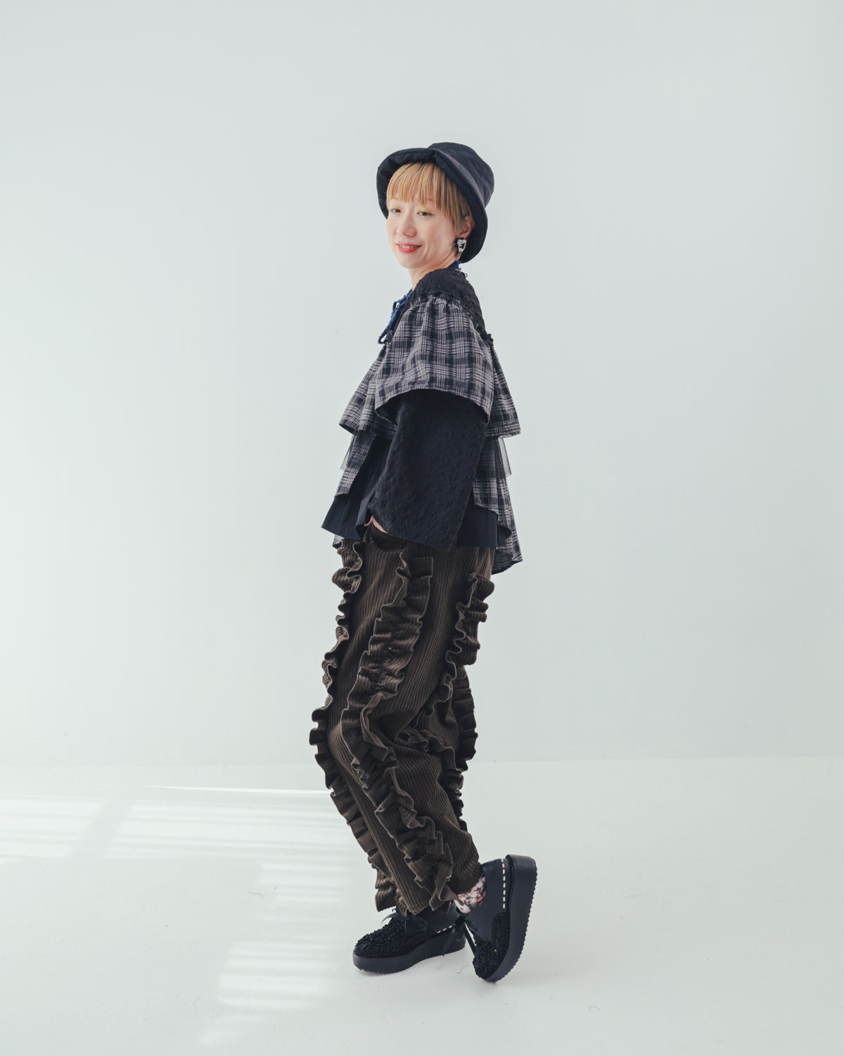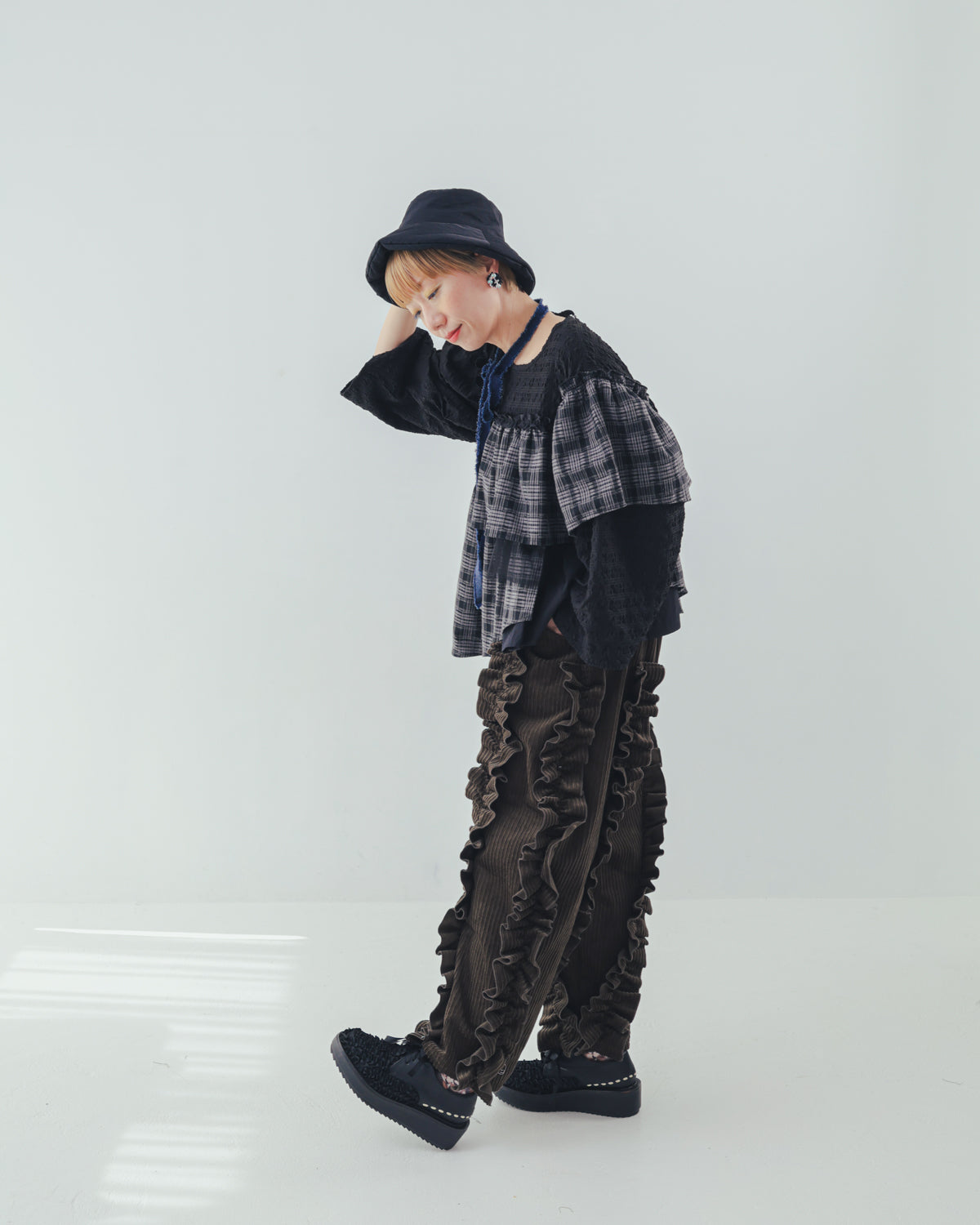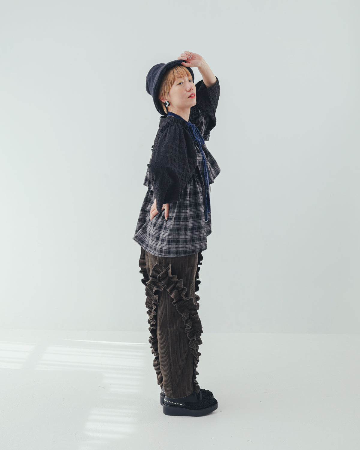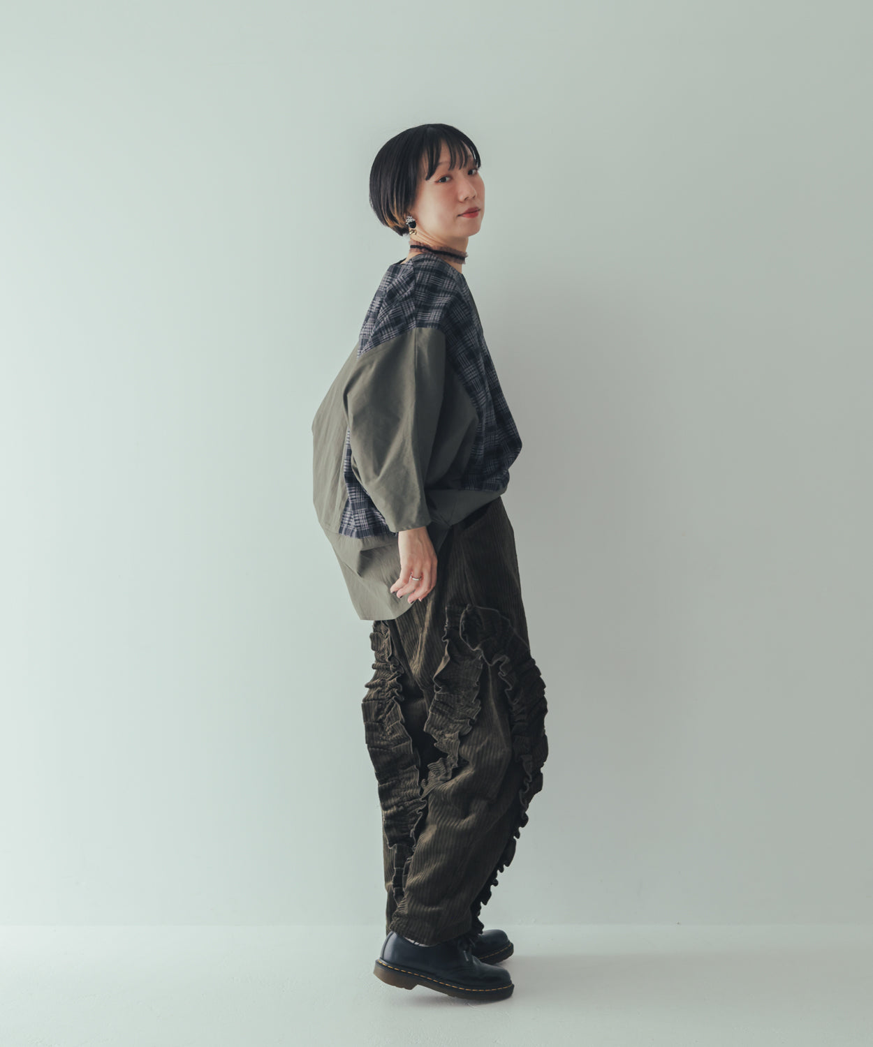 保温性の高いコーデュロイ生地を使用した、秋冬らしいパンツです。アシンメトリーにあしらった立体感あるフリルがカジュアルさを程良く抑え、可愛さをキープ。ボトムスの重心を活かしたコーディネイトを組んでみたりと、遊び甲斐のあるアイテムです。