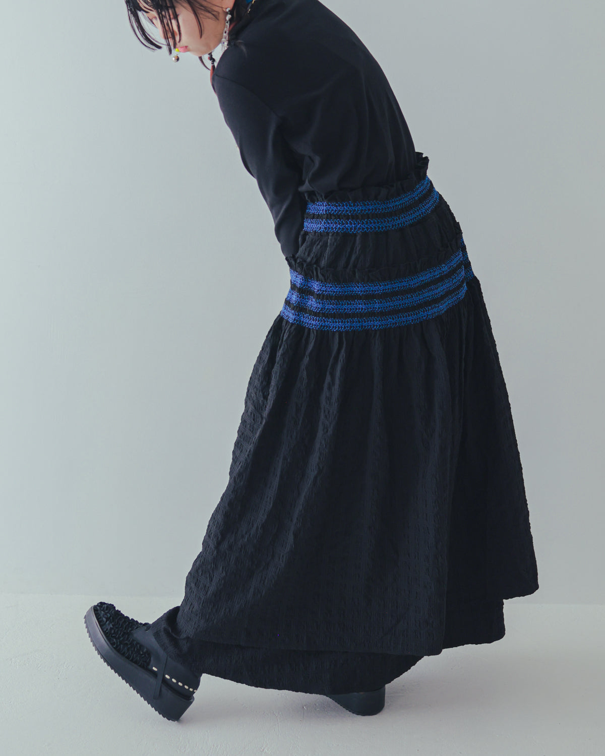 同素材の生地を重ねることでボリュームと立体感を演出したスカートは、軽やかに揺れるたっぷりのフレアが魅力的な一着。裏地付きのため透ける心配がなく、シルエットもしっかりキープします。ブラウンにはレッド、ブラックにはブルーの糸をステッチに使用するなど、デザインだけでなく色の組み合わせにもこだわりました。